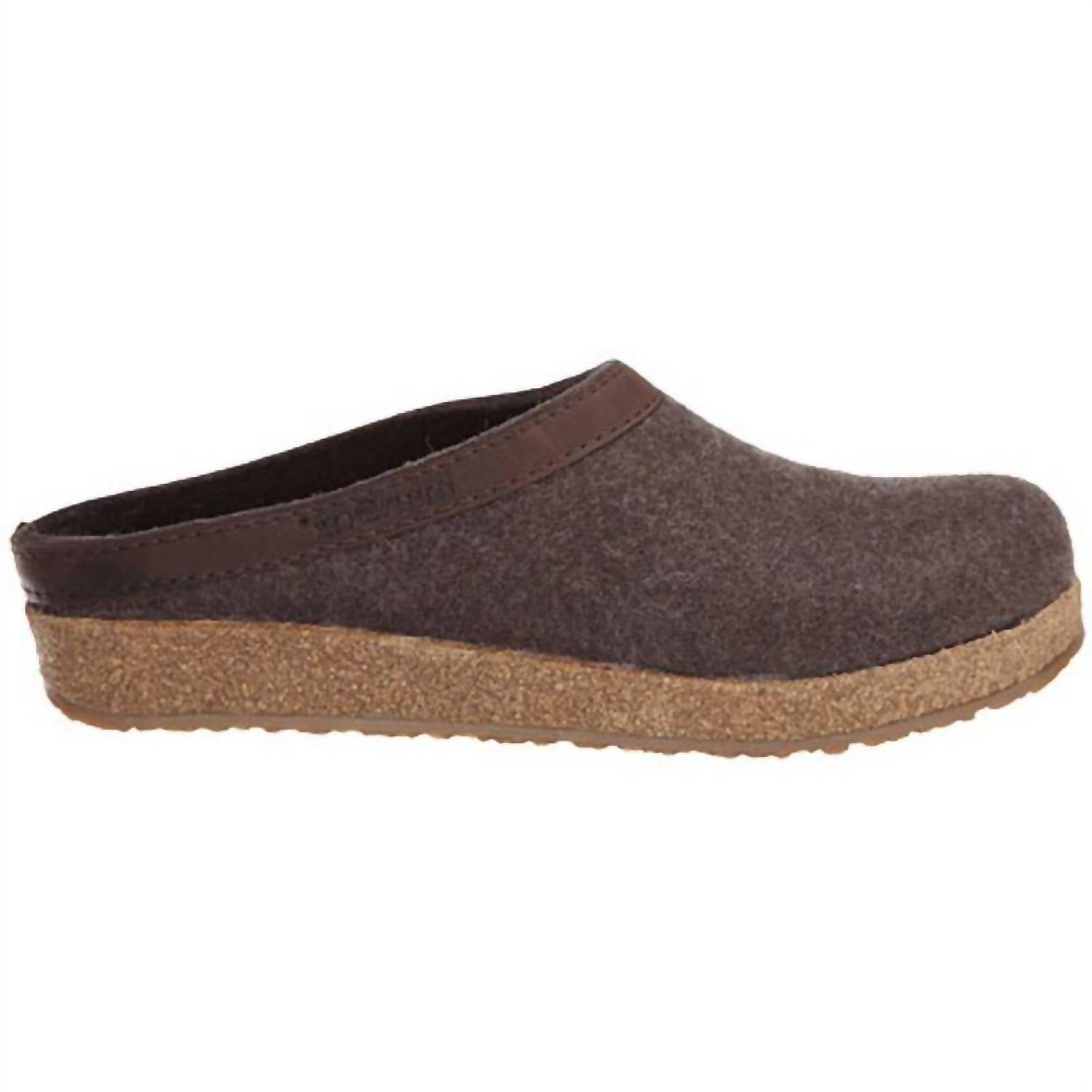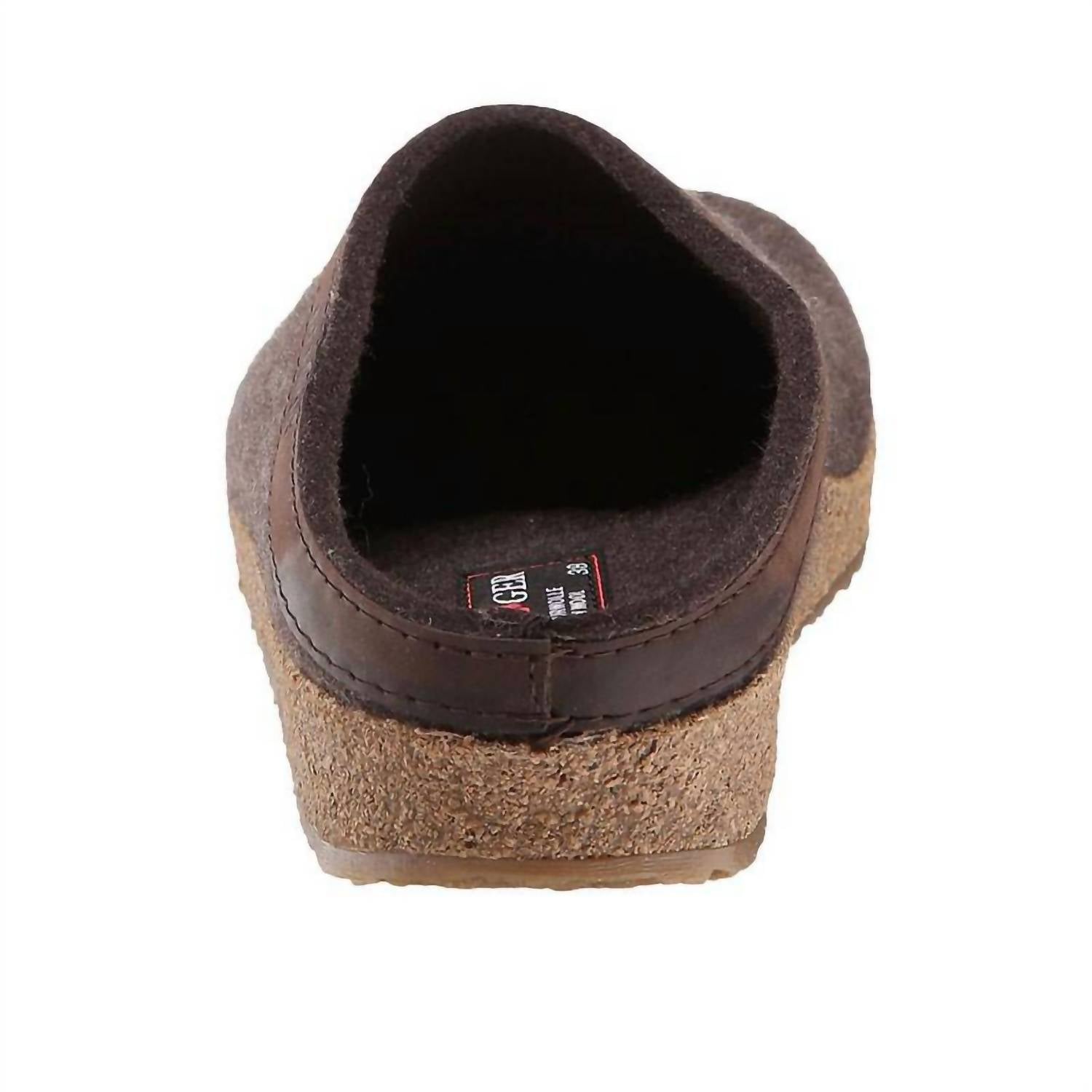 Slip them on and go! Step into comfort and style with the HAFLINGER Women's GZL42 Grizzly Clog in Smokey Brown, perfect for the winter season. These mules feature a boiled wool upper for exceptional temperature control and moisture-wicking properties, complemented by a timeless leather trim for a chic touch. The anatomically correct midsole, made from a combination of cork and latex, offers excellent arch support and a contoured heel seat for shock absorption. Finished with a durable rubber outsole, these clogs are ideal for vacation getaways or quiet time at home.