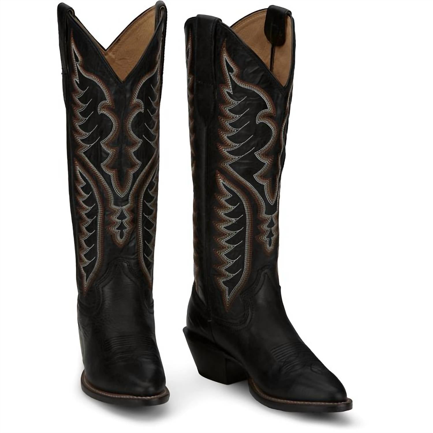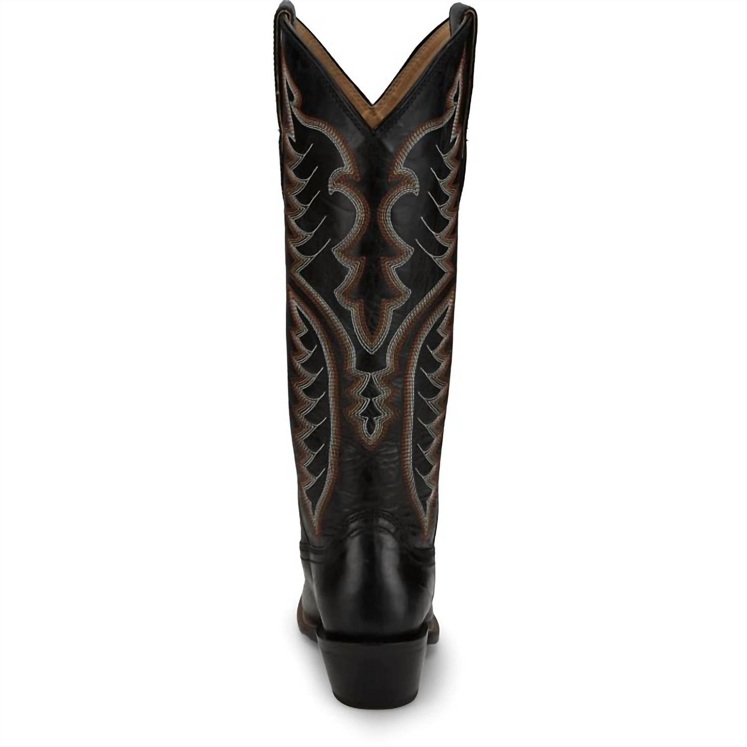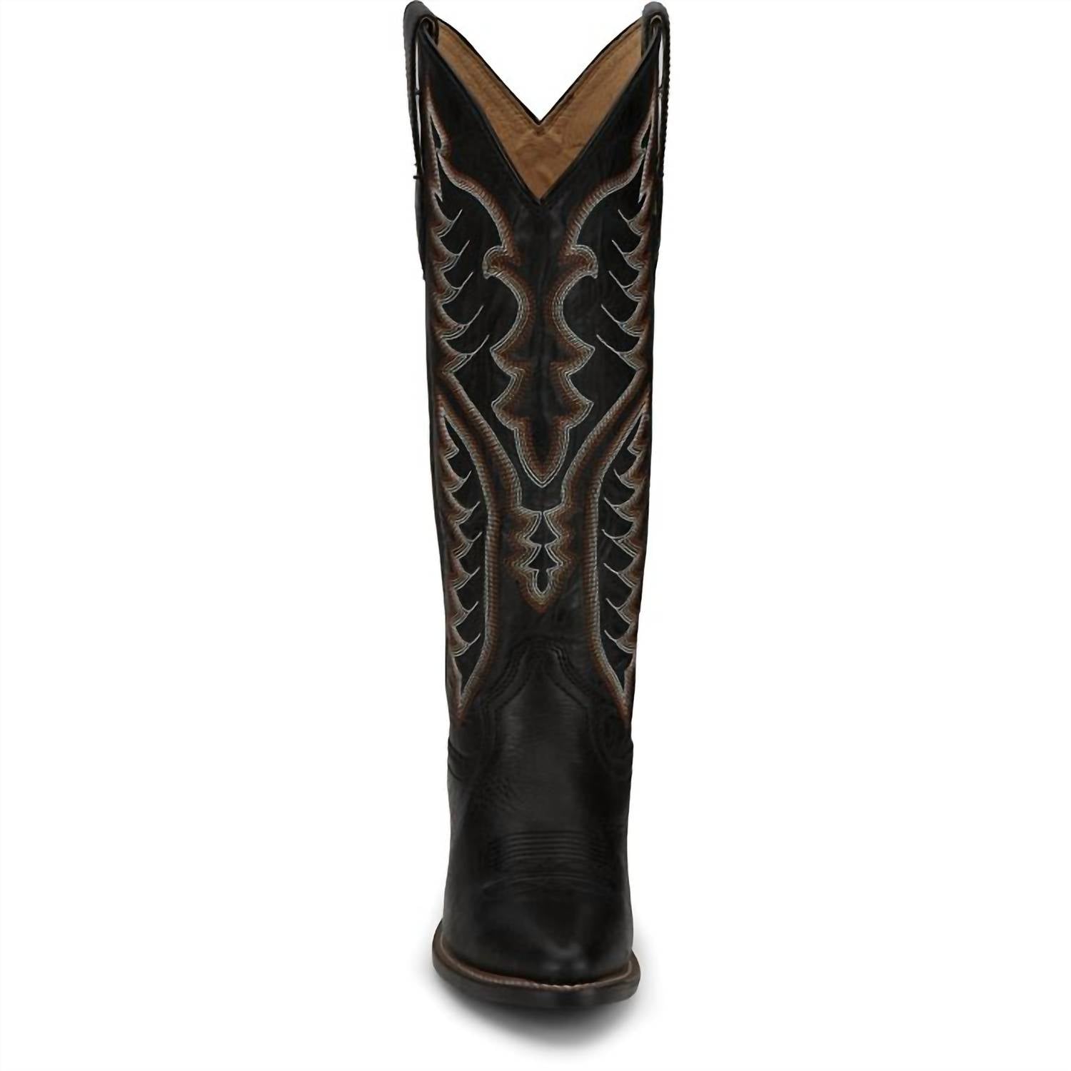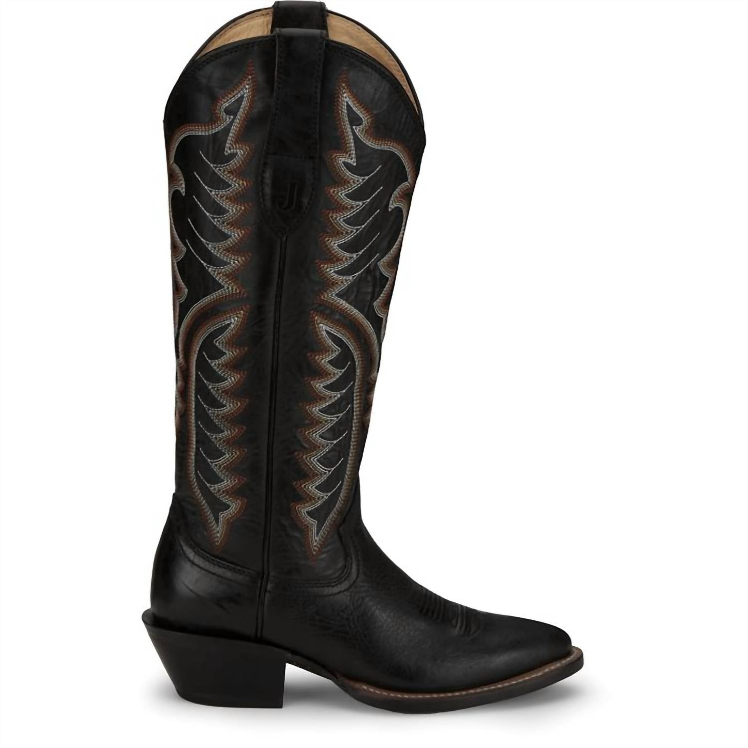 A trend that is here to stay. Step into the timeless elegance of Justin's Women's Evelyn Western Boot, featuring a rich coal color and premium full grain leather construction. With a medium round almond toe and a sturdy block heel, these boots blend modern and Western styles seamlessly. The intricate bold stitching and 3/4 welt construction with a single row stitch showcase meticulous craftsmanship. Designed for comfort and durability, these over-the-knee boots are lined with leather, include a cushioned insole, and are ideal for your fall vacation wardrobe.