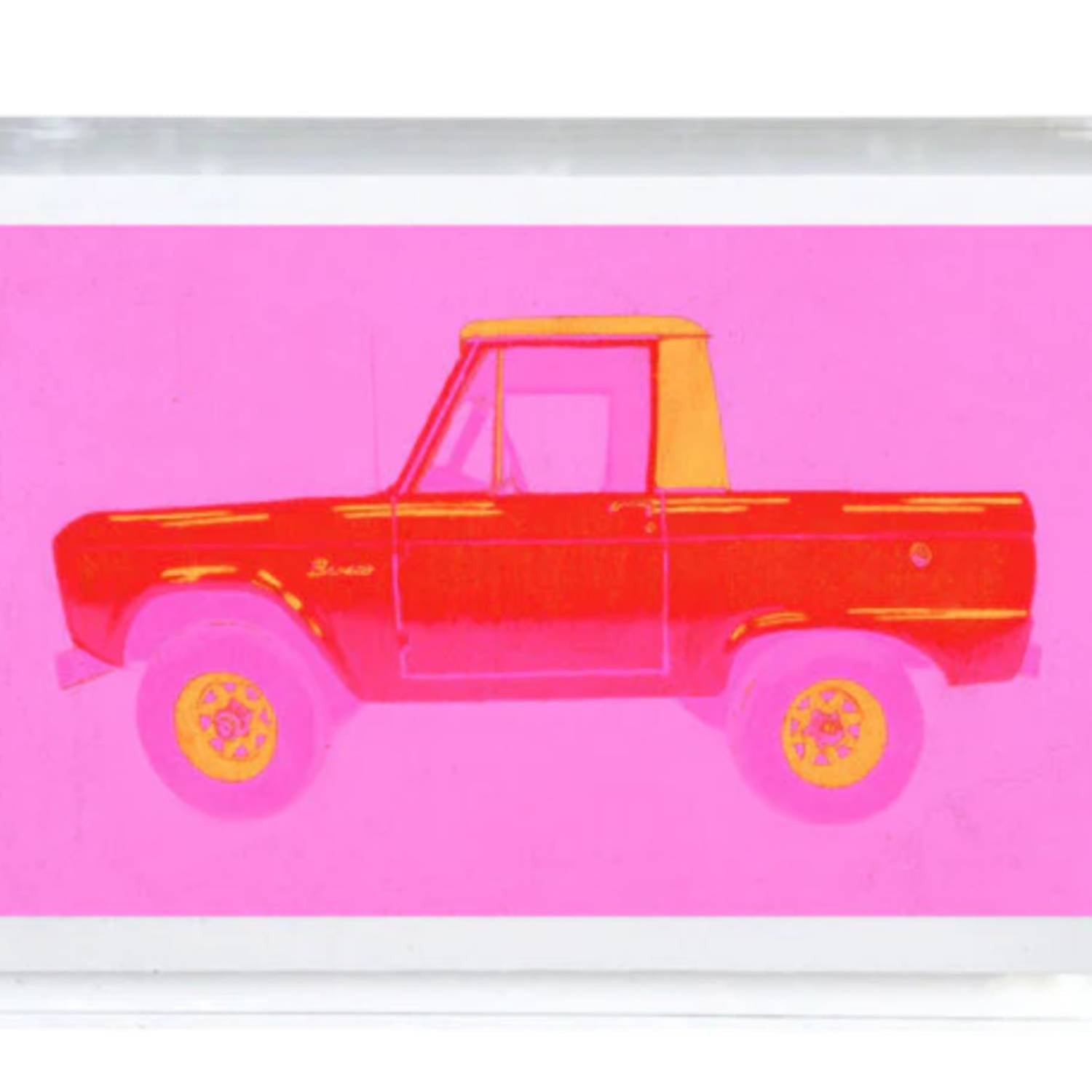 Introducing the Bronco Print Acrylic Frame by Kelsey Livingston, a charming addition to your decor with its vibrant depiction of a red and yellow Ford Bronco on a pink background. This fine art giclee print measures 3" x 5" and is elegantly encased in a 4x6 inch magnetic acrylic frame, perfect for tabletop display. All artwork is original, archival, and crafted with precision in Austin, TX. This multi-colored frame not only enhances your space but also showcases Kelsey Livingston's unique artistic flair.