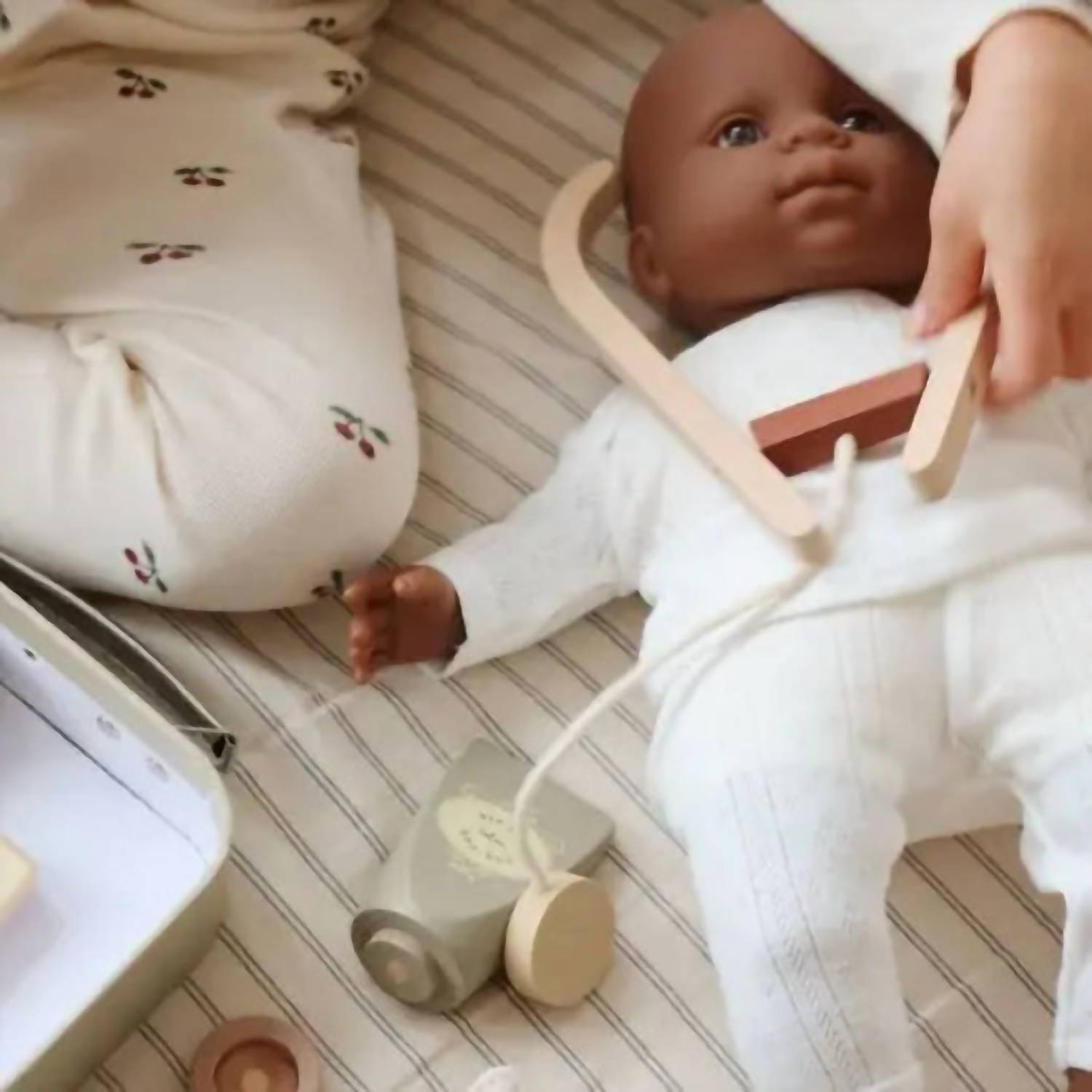 Meet the Girls Gerd Soft Body Doll by Konges Sløjd, a beautifully crafted play companion. Made from durable vinyl with an organic cotton fabric and filled with recycled polyester, this doll is both eco-friendly and safe for children. Its pointelle pants and blouse, composed of 100% organic cotton, make dressing and undressing effortless for little hands. The doll's strikingly realistic eyes add a delightful depth and color, sparking imagination and play.