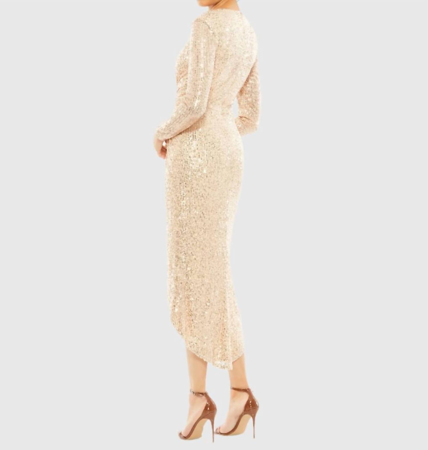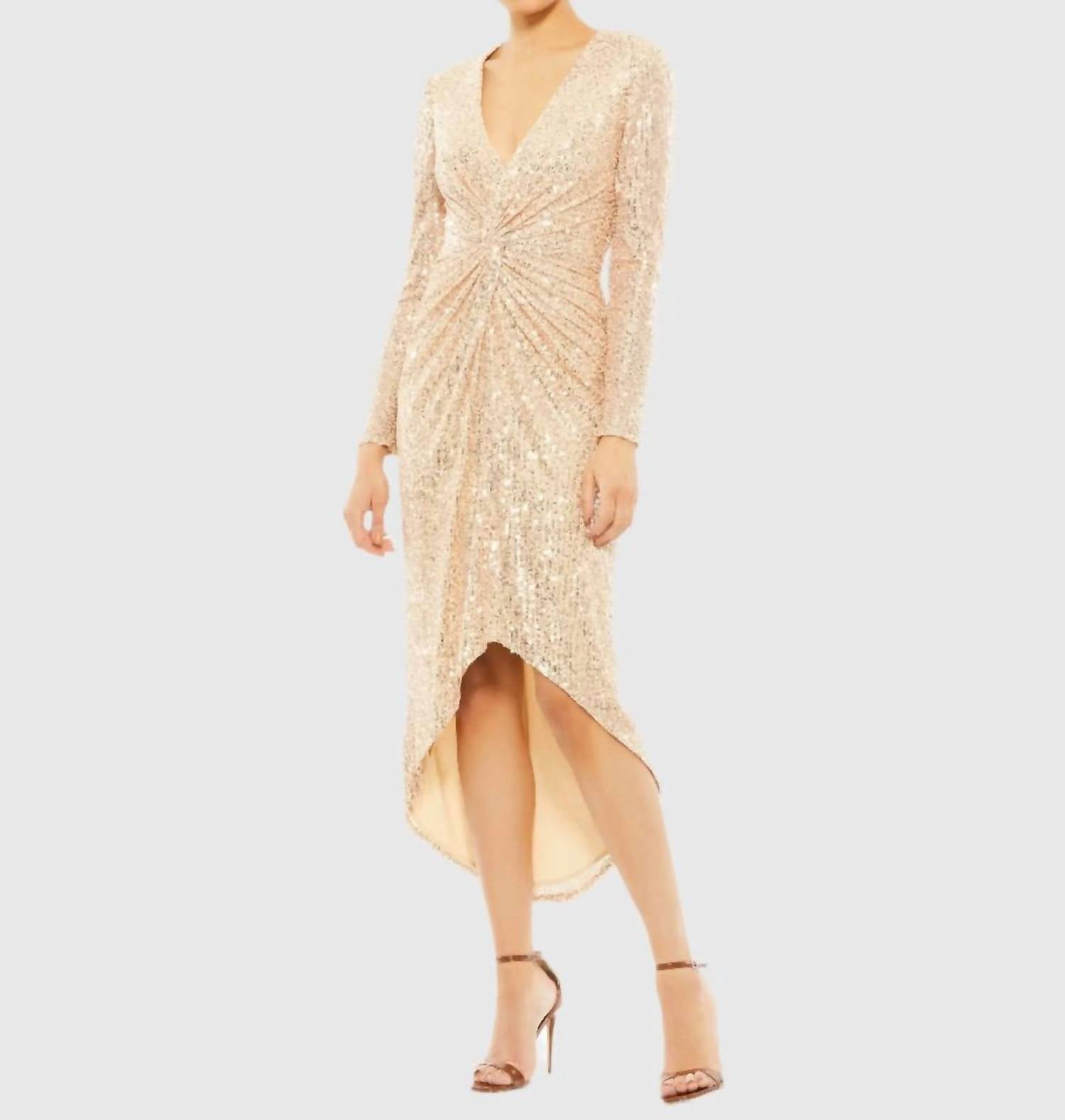 When you can't decide between length, the high-low dress is the way to go. This long-sleeved, fully sequined cocktail dress features a flattering V-neckline, knot-style ruching at the waist, and a dramatic high–low hem. Crafted from shimmering sequin fabric and fully lined for comfort, it includes a concealed back zipper for a smooth, secure fit. Made from 100% polyester.