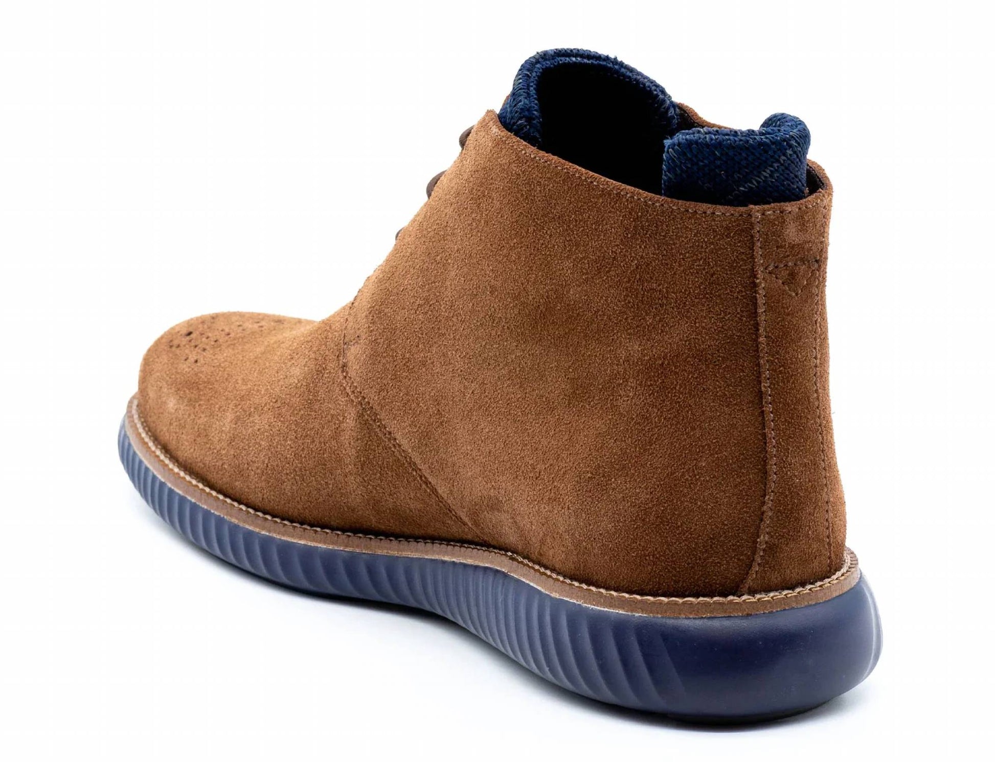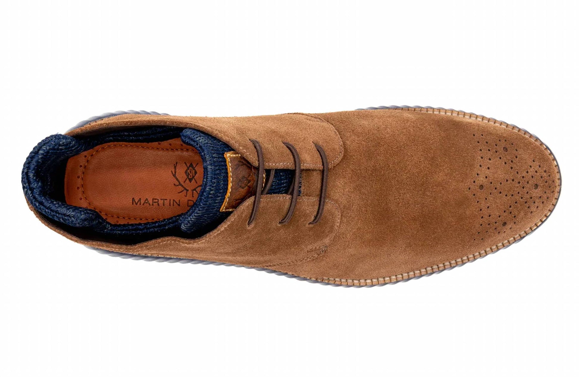 Introducing the Men's Countryaire Chukka Boots by Martin Dingman, crafted from water-repellent suede in a rich tobacco color. These boots feature a 3-eyelet slip-on design with elastic non-tie laces and a round toe shape. They are equipped with a neoprene performance lining and a lightweight all-season rubber sole, offering a heel-to-toe comfort system. Handcrafted on the Countryaire last, these vintage-inspired boots are perfect for travel during the fall season.