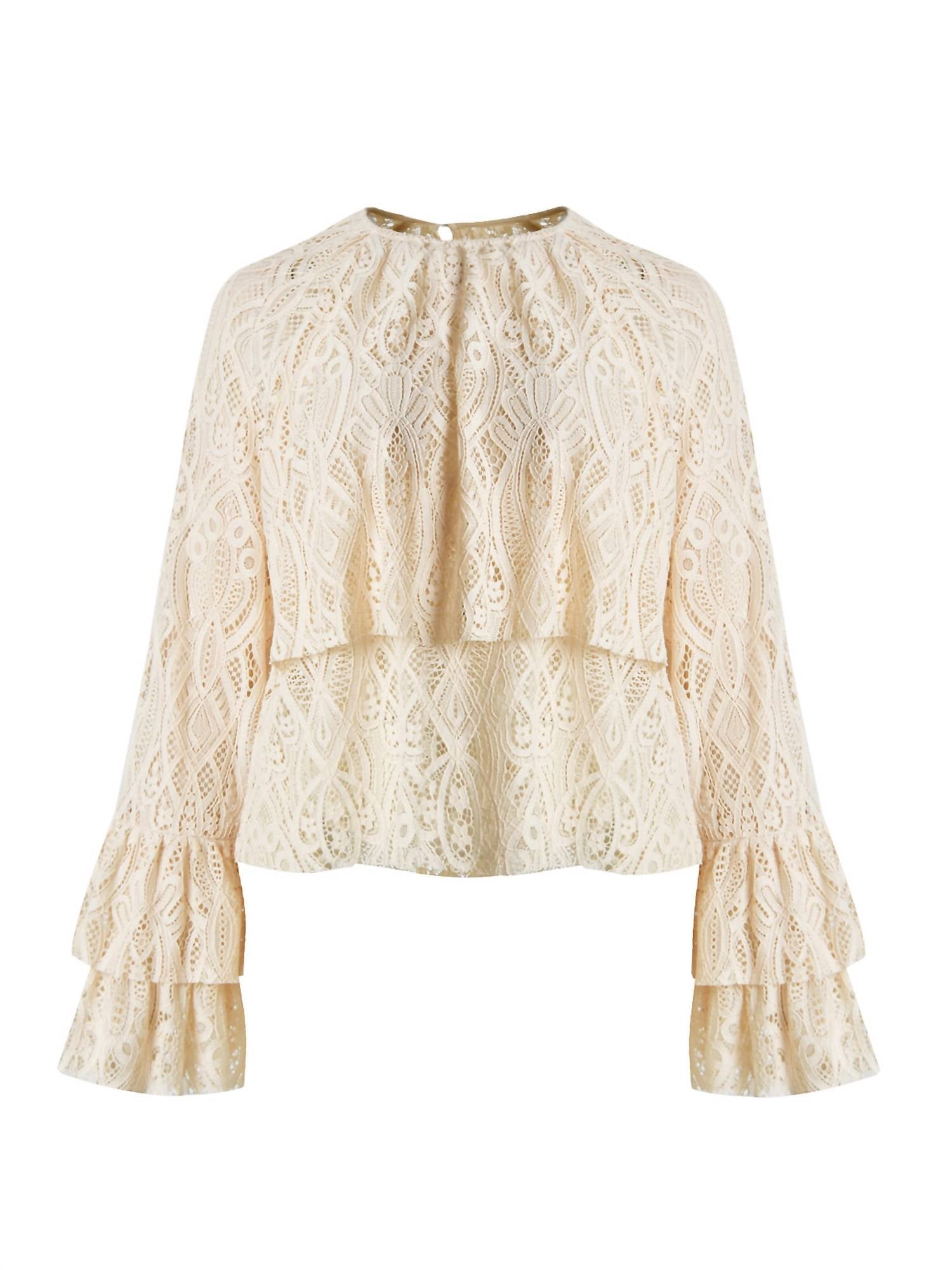 A timeless blouse that will never go out of style. Introducing the Lacey Tiered Long Sleeve Blouse by Mat Fashion, a romantic piece in a delicate vanilla hue that captivates with its vintage-inspired charm. Designed for women, this blouse features long, elegantly tiered sleeves and a classic crewneck. Made from textured lace, its boho chic style makes it perfect for engagements and fall occasions. Closure: Hook and eye closure.