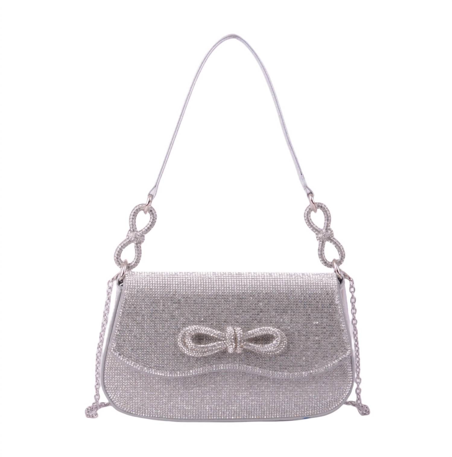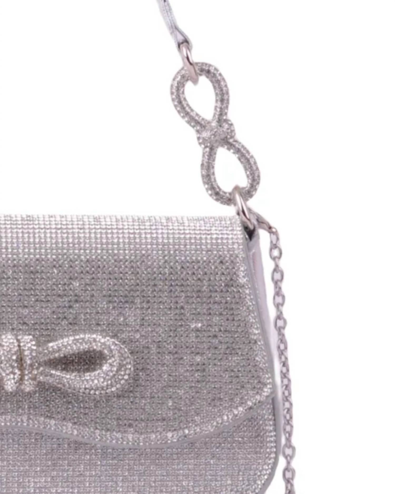 Small in size but a total statement maker. Introducing the Women's Crystal Bow Bag by Most Wanted, a mini bag that radiates elegance with its all-over crystal baguettes. This silver bag is accentuated by a bow detail both on the top handle and center, making it a standout accessory for any occasion. Whether you're dressing up for a night out or adding sparkle to your daily look, this bag is a must-have addition to your collection.