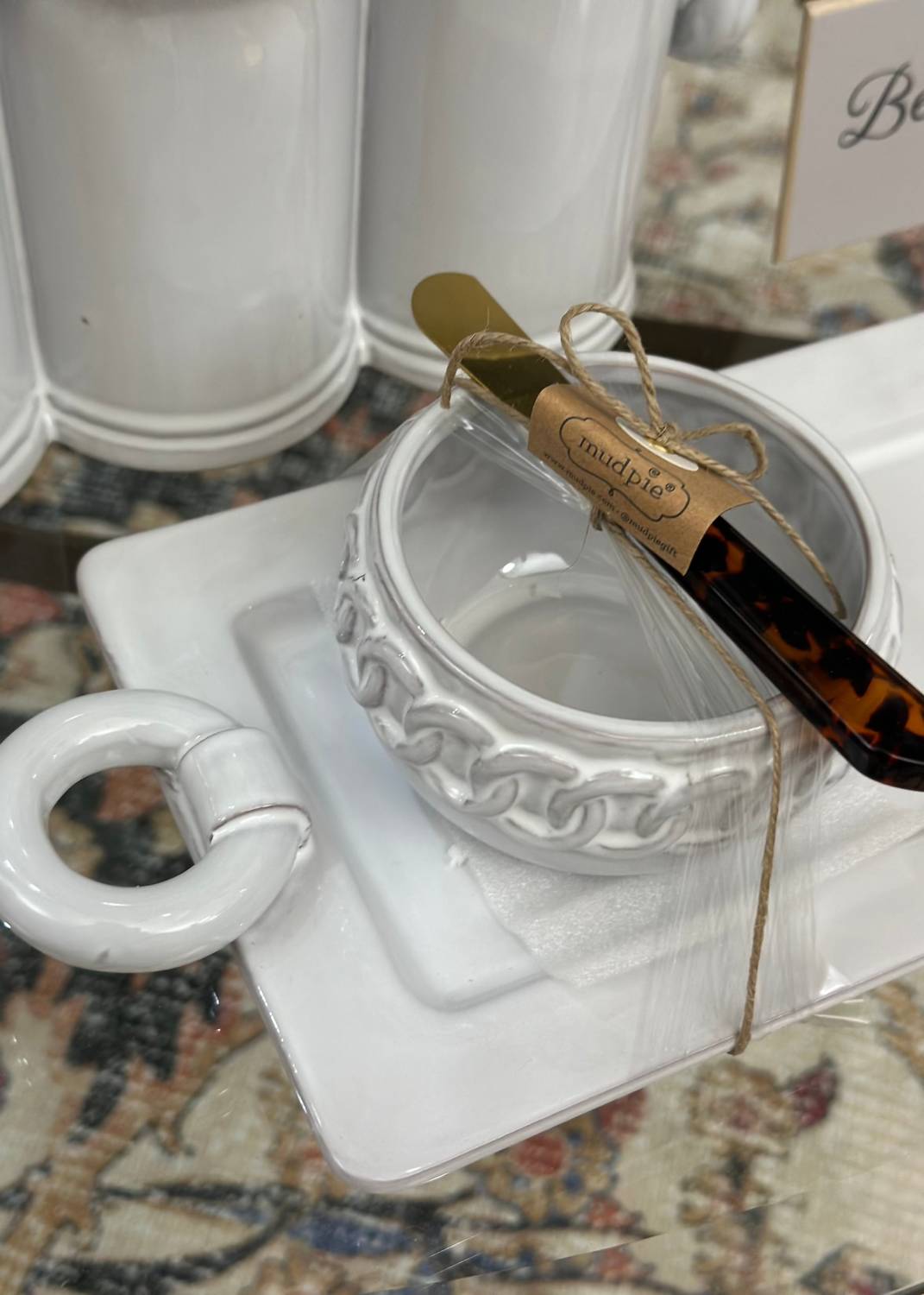 Elevate your hosting game with the Women's Link Handle Tray & Tidbit Tray by Mudpie, a stylish addition to any gathering. This three-piece serving set is crafted from durable white stoneware, perfect for entertaining with its classic elegance. The set measures 6" x 16" and includes a charming tortoise shell handled spreader, making serving both functional and fashionable. An ideal choice for enhancing your kitchenware collection.