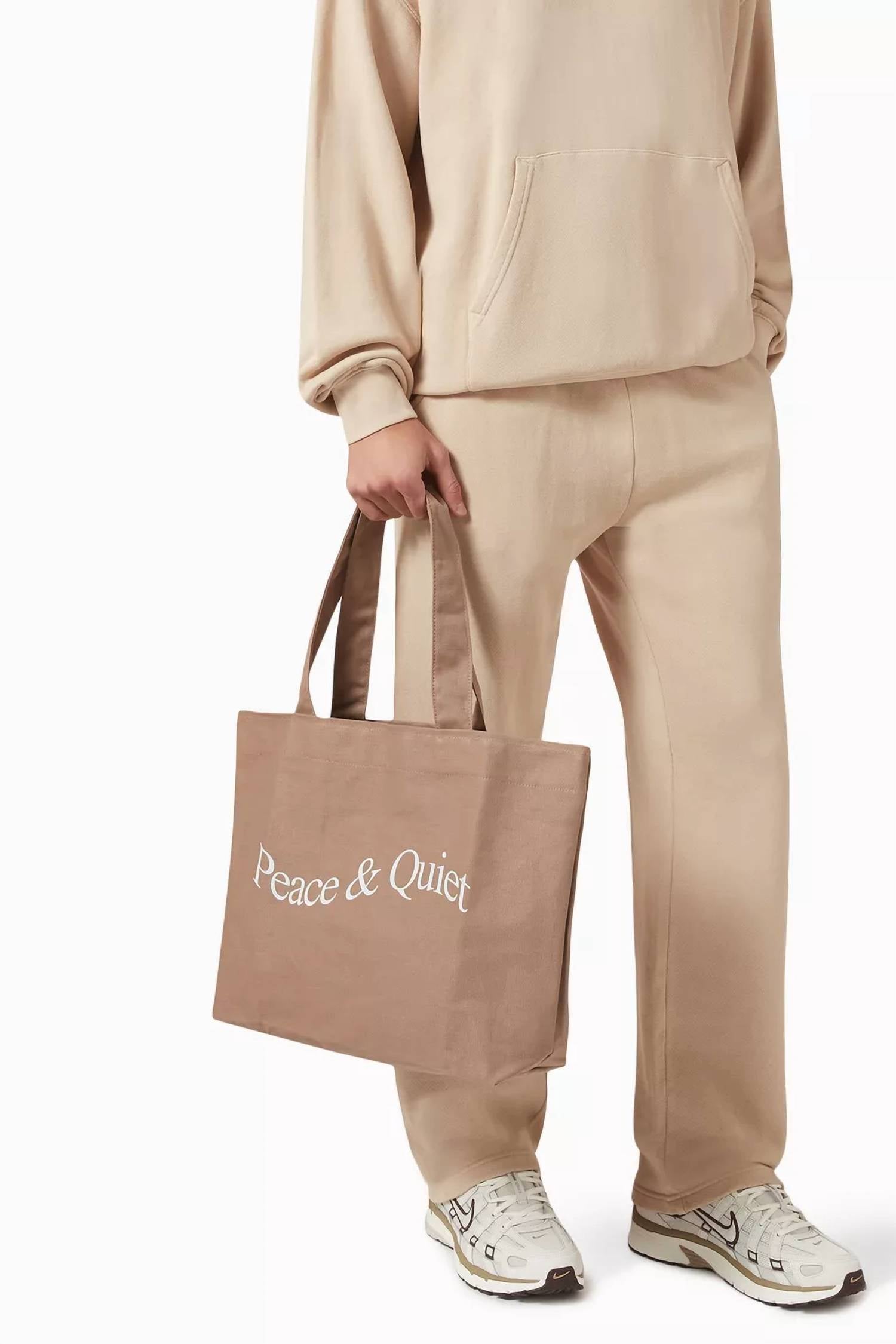 Aside from being the cutest bag ever, this tote is the perfect size to hold all of your vacation necessities. Pair this adorable bag with a flowing dress and some slides and you're all set! Introducing the Women's Wordmark Tote by Museum of Peace & Quiet, a functional yet stylish accessory in taupe. Made from 100% heavy-duty cotton canvas, this tote provides durability and a soft touch. It measures 18 inches in width and 11 inches in height, offering ample space for all your essentials. Elevate your everyday look with this chic and reliable tote bag.