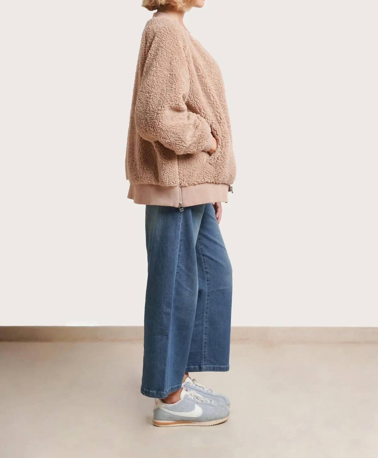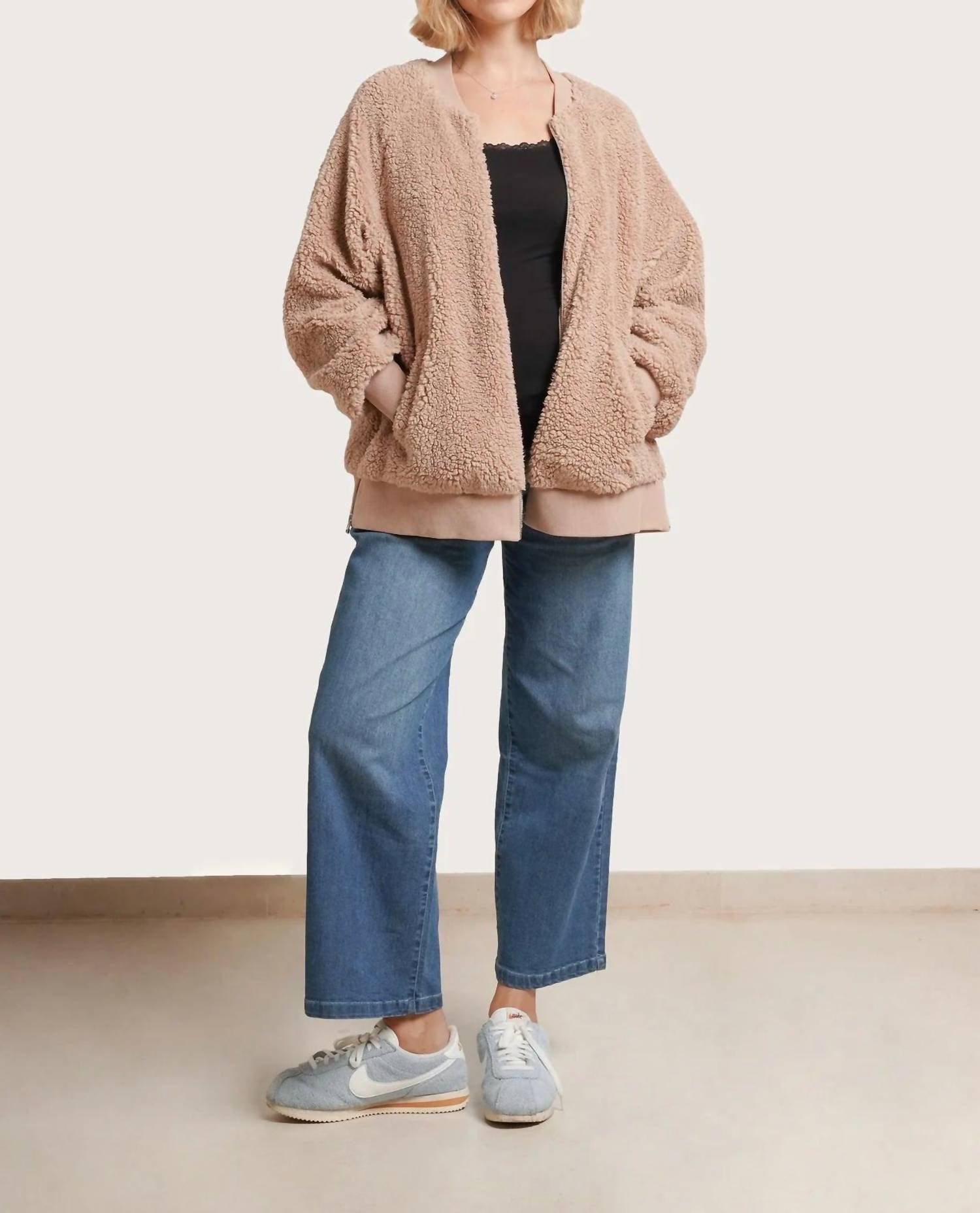 Presenting the Cozy Before & After Jacket by NOM Maternity, a must-have for chilly days with a V-neck and long sleeves in sophisticated taupe. Crafted from 100% polyester, this bomber-inspired layer is perfect for maternity wear with side zips and roomy pockets. Closure: Zip closure. Care: Machine wash, lay flat to dry. Ideal for preppy fall travel outings.
