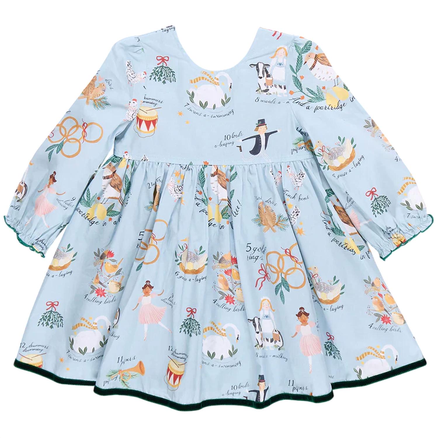 Introducing the PINK CHICKEN Twelve Days Of Christmas Dress in blue, perfect for celebrating the holiday season with elegance and charm. Crafted from soft cotton, this dress features a delightful pattern by artist Darcie Olley, complemented by a fully gathered skirt and green velvet trim with ruffle cuff details. Ideal for a festive occasion, it embodies both style and holiday spirit, making it perfect for spring celebrations like Thanksgiving. This piece offers a sweet pairing option with our Baby Girls Amma Dress Set, perfect for a memorable Big Sis/Little Sis moment.