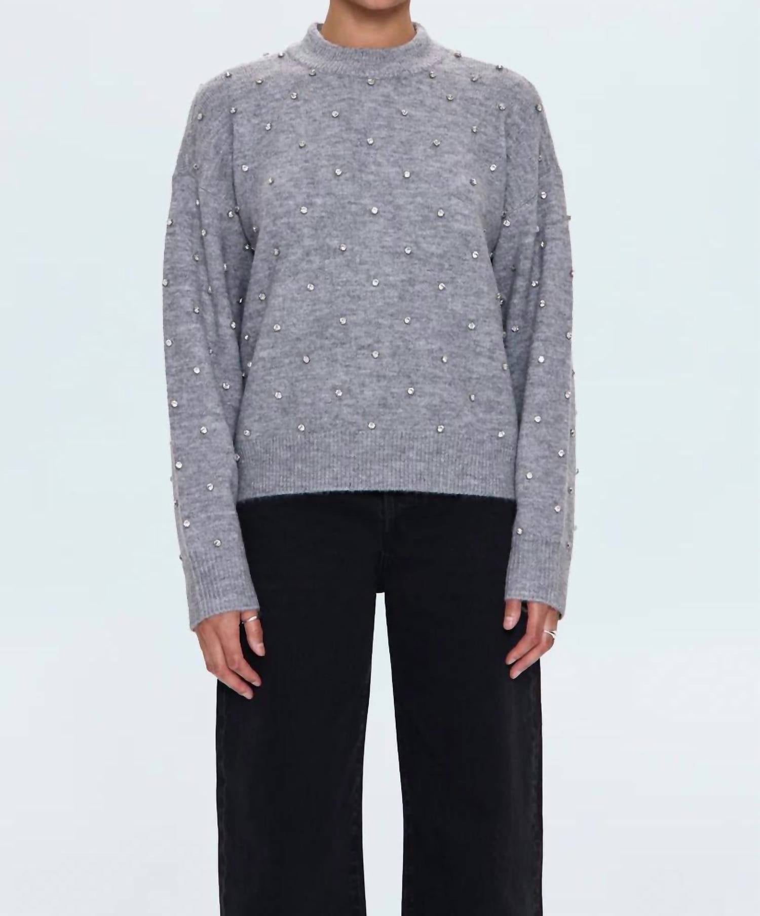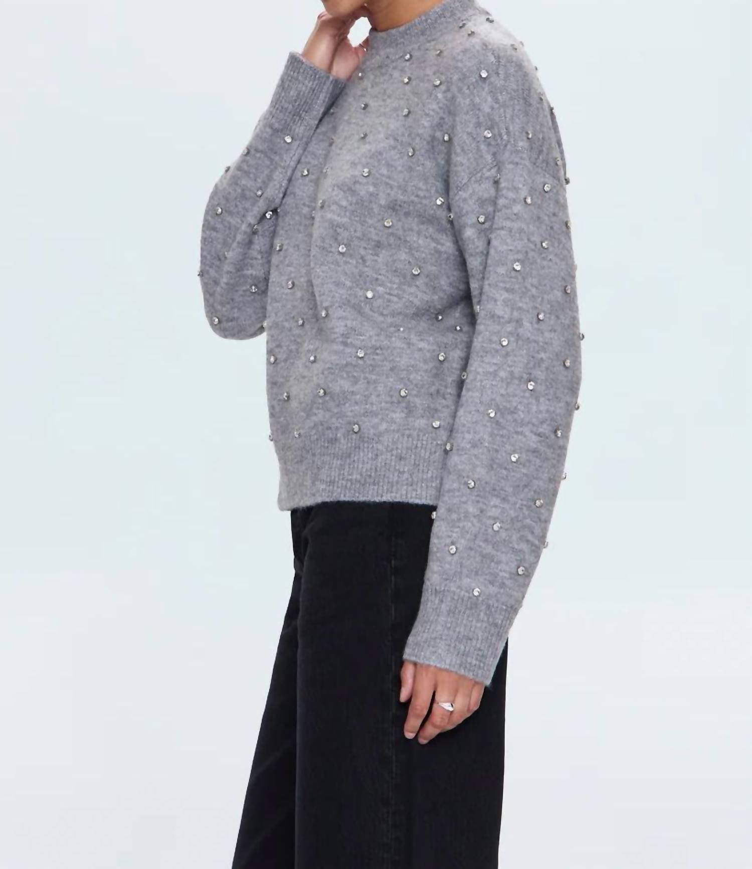 Stay warm and stylish in this versatile and effortlessly cool knitwear staple. Wear it alone or layered, it's the perfect sweater for the season and you'll wish you had it in every color. Meet the Aura Crewneck Sweater by PISTOLA, a chic addition to any wardrobe that's perfect for fall outings or Thanksgiving gatherings. This women's sweater boasts long sleeves and is crafted in a textured knit composed of 77% Acrylic, 20% Nylon, and 3% Spandex, offering a soft drape for ease of layering. Featuring a pull-on closure, the sweater adds a subtle sparkle with delicate crystal embellishments against a deep Charcoal Diamante backdrop. For care, hand wash and lay flat to dry, ensuring it remains a staple piece in your wardrobe.