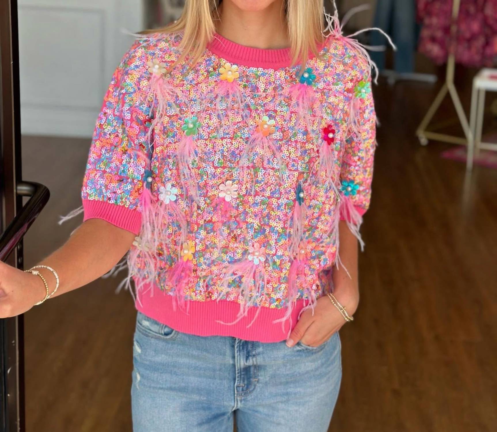 Queen Of Sparkles - Sequin Feather Sweater Top