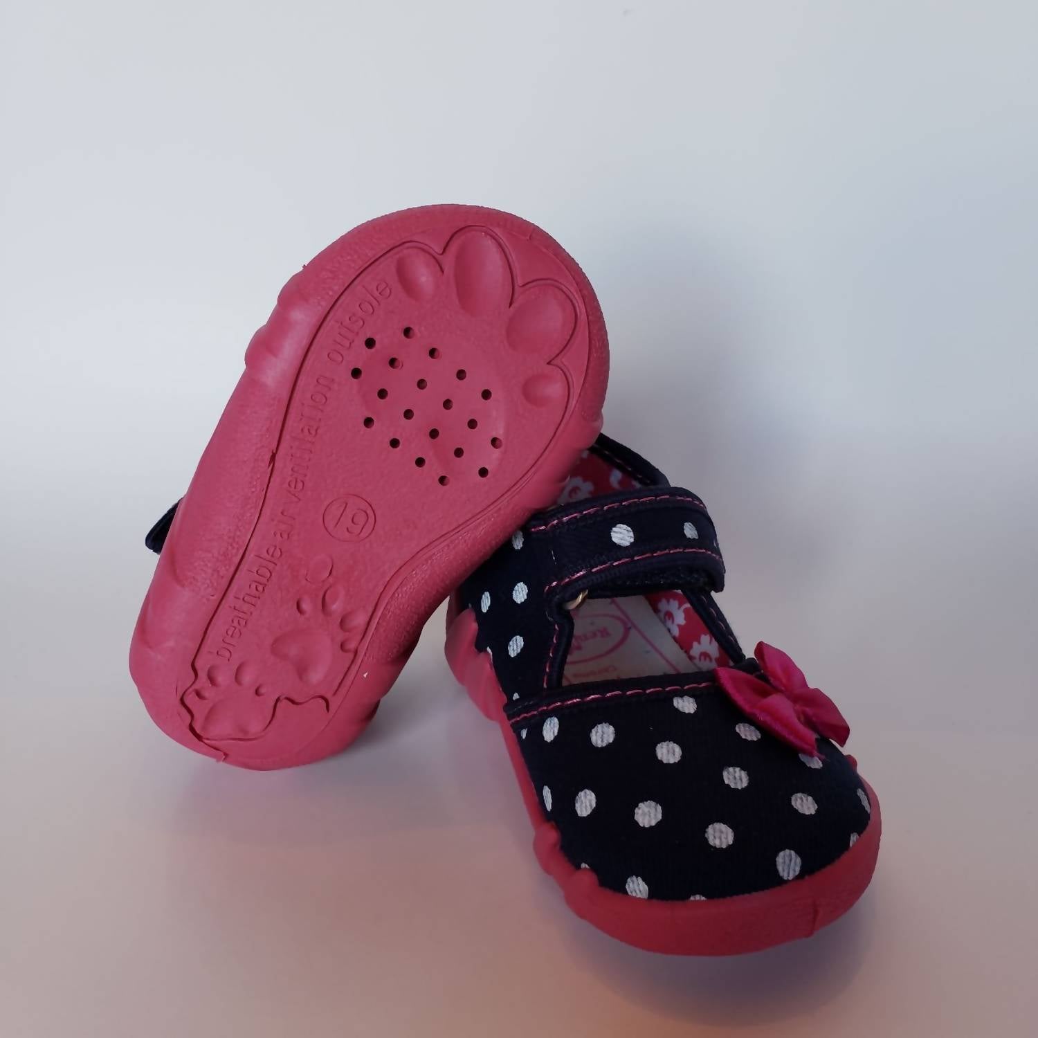 The Renbut Shoes Girl's Velcro Strap Mary Jane Casual Flat Shoe is a delightful addition to any toddler's wardrobe. Featuring a convenient Velcro strap closure, this shoe is crafted with a natural cotton canvas upper and lined with natural cotton fabric. The orthopedic arch supportive design promotes healthy feet development, with antibacterial and antifungal properties provided by the natural leather insoles. Made in Europe, the shoe also boasts anti-slip flexible rubber outsoles and a stylish black and white polka dot pattern with red stitching and bow accent.