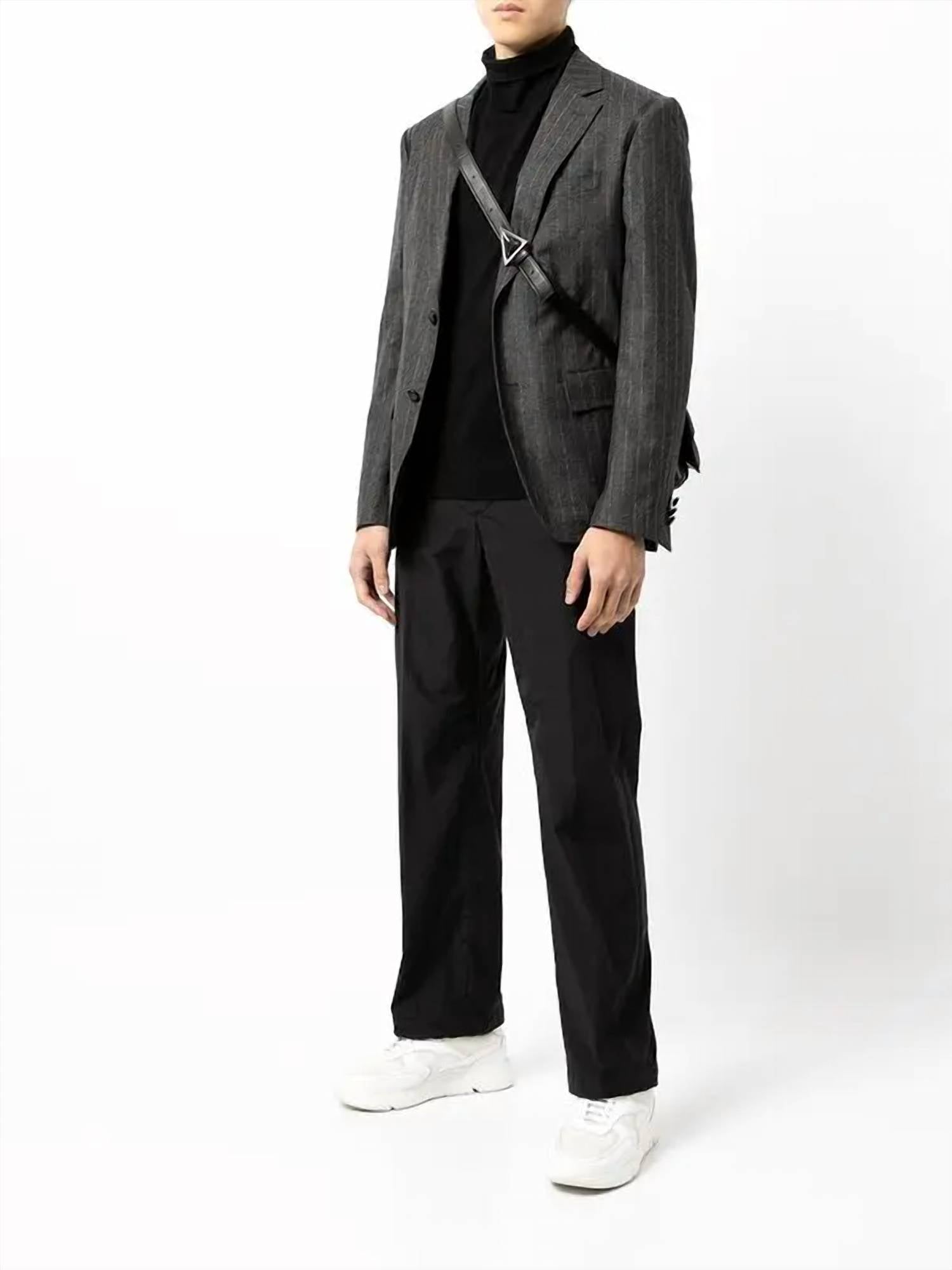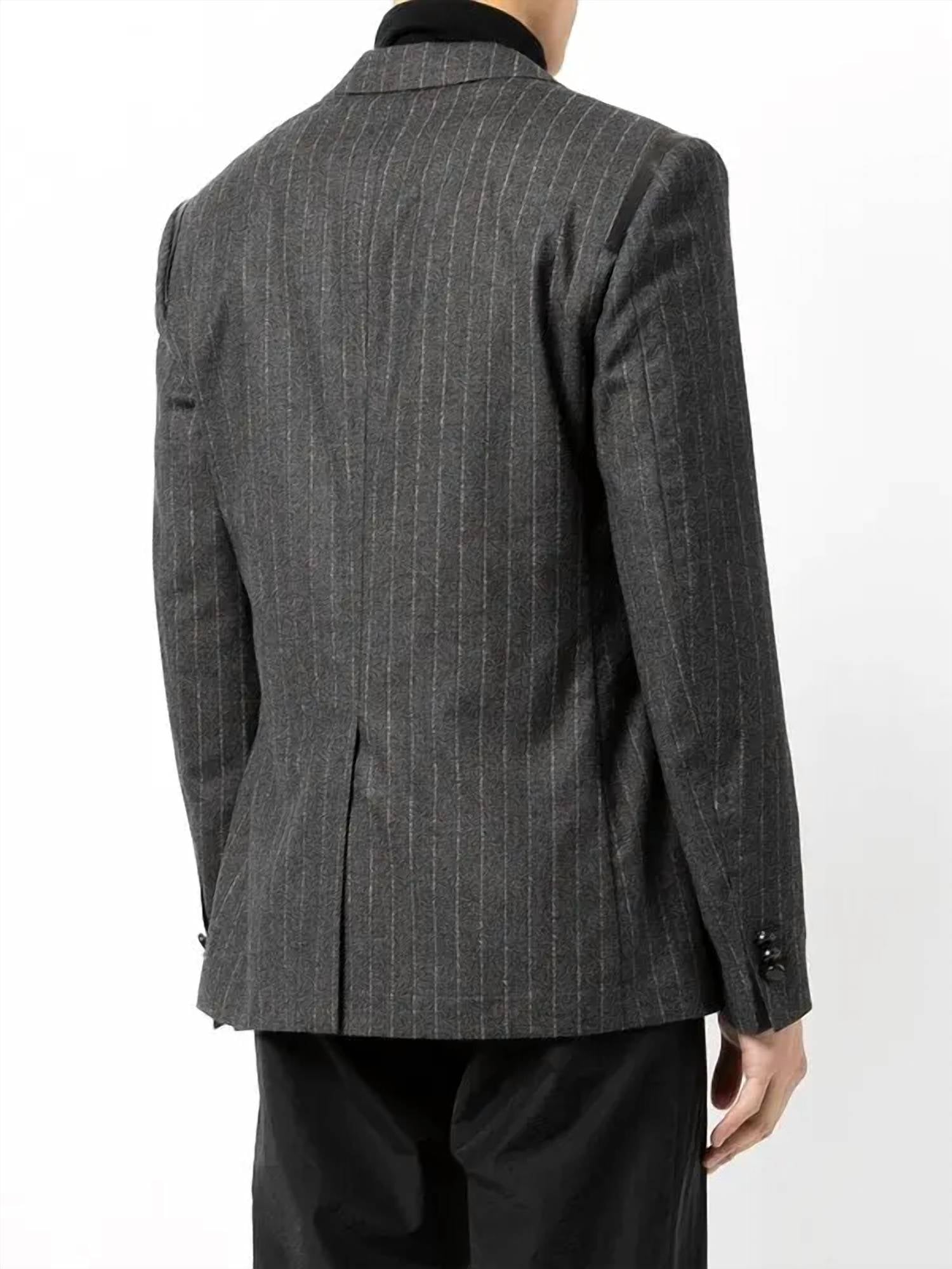 Elevate your formal wardrobe with the Pinstripe Leather-trim Suit Jacket by Salvatore Ferragamo. This grey piece showcases long sleeves and is crafted from 100% virgin wool, featuring a sophisticated pinstripe pattern and leather trims. Made in Italy, it includes a front button closure, front flap pockets, and a chest welt pocket, finished with buttoned cuffs and a central rear vent for ease. Care instructions advise against washing or dry cleaning, maintaining the jacket's pristine condition. The model is 1.83 m tall and wearing size 50.