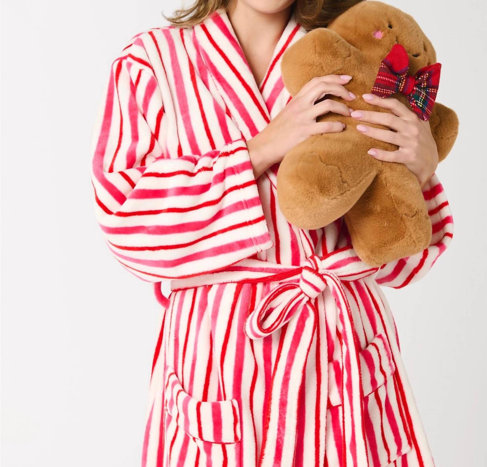 The perfect piece to lounge in, sleep in, and cook breakfast in. Indulge in the cozy charm of Shiraleah's Candy Stripe Fuzzy Plush Robe, designed for both comfort and style. This long-sleeve robe is crafted from 100% polyester, showcasing a delightful pink, red, and ivory stripe pattern. It features a tie belt and convenient front pockets, perfect for leisurely mornings or relaxing nights. Length: S/M 38", M/L 40". Care: Machine wash and tumble dry low.