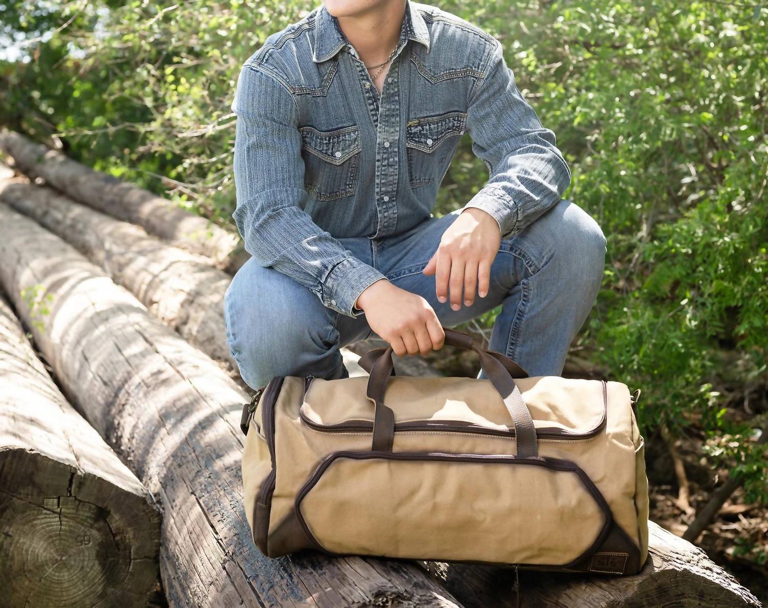 Introducing the Men's Buffalo Creek Large Duffle Bag by STS Ranchwear, a perfect fusion of durability and rustic elegance. Crafted with a heavy-grade waxed cotton canvas in classic tan, this duffle is complemented by genuine chestnut buffalo leather accents. It features a secure zip top closure, dual leather carry handles with a snap closure, and a removable canvas shoulder strap. This spacious bag measures 24" W x 10" H x 9" D and includes practical pockets for organized storage.