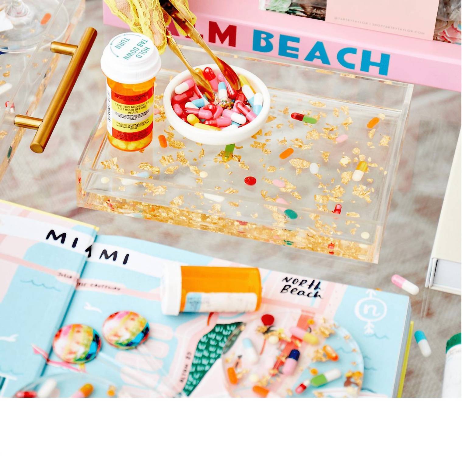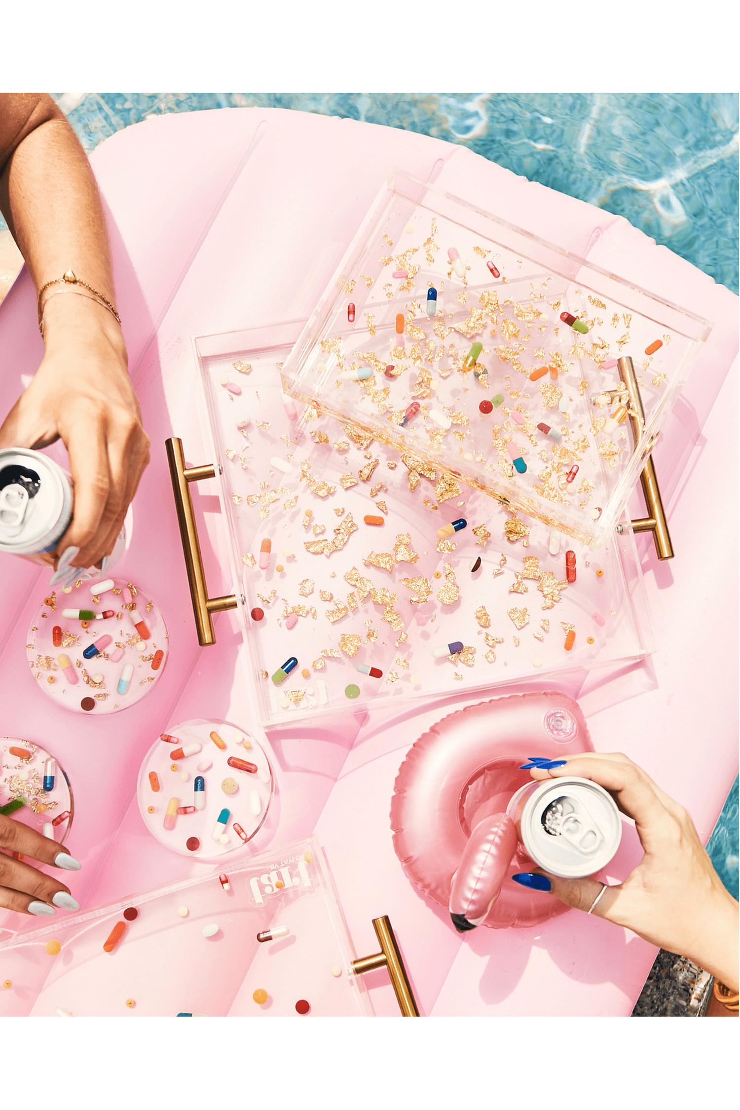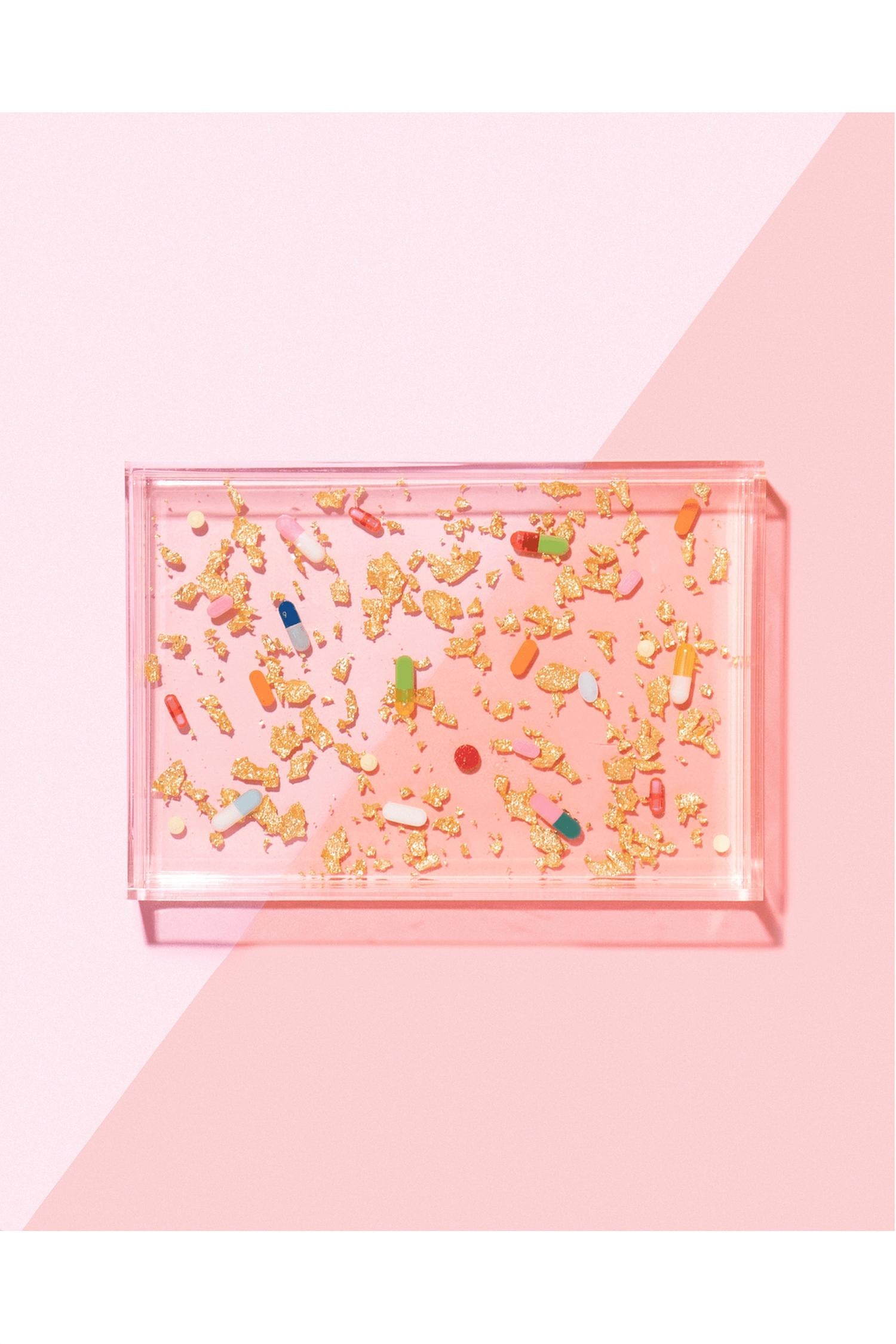 Add a touch of whimsy to your serveware collection with the Pill + Gold Small Tray by Tart By Taylor in vibrant pink. This handcrafted tray from Dallas, Texas, showcases over-the-counter medication replicas encased in hand-filled sprinkle/glitter capsules and gold flakes, meticulously sealed under a layer of resin. Made of durable acrylic and resin, it measures 6.5” L x 9.5” W x 1.5” H, ensuring it's both waterproof and effortless to clean—just use a soft damp cloth. Each piece is uniquely handmade, guaranteeing a one-of-a-kind item that stands out in any setting; please note, the pills are not for consumption.
