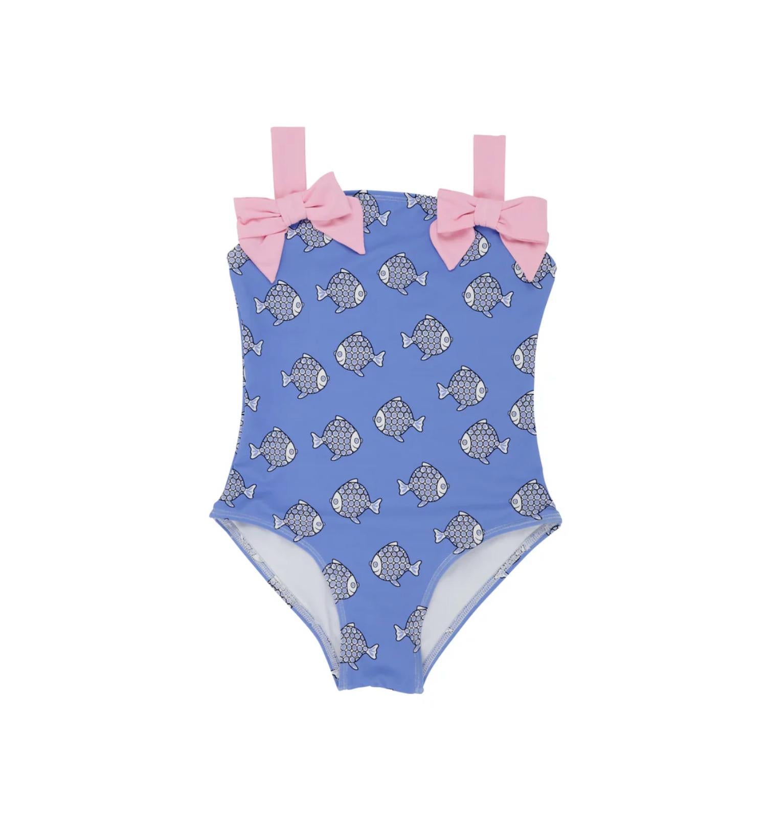 Step into summer with the Shannon Bow Bathing Suit by The Beaufort Bonnet Company, perfectly designed for a beach day. This charming one-piece features an animal pattern in delightful Little Fishes print, capturing the essence of seaside fun. Crafted from a comfortable nylon blend, this swimsuit combines style and function for your little one's adventures. Care is easy with machine wash and line dry instructions, ensuring it's ready for every splash and swim.