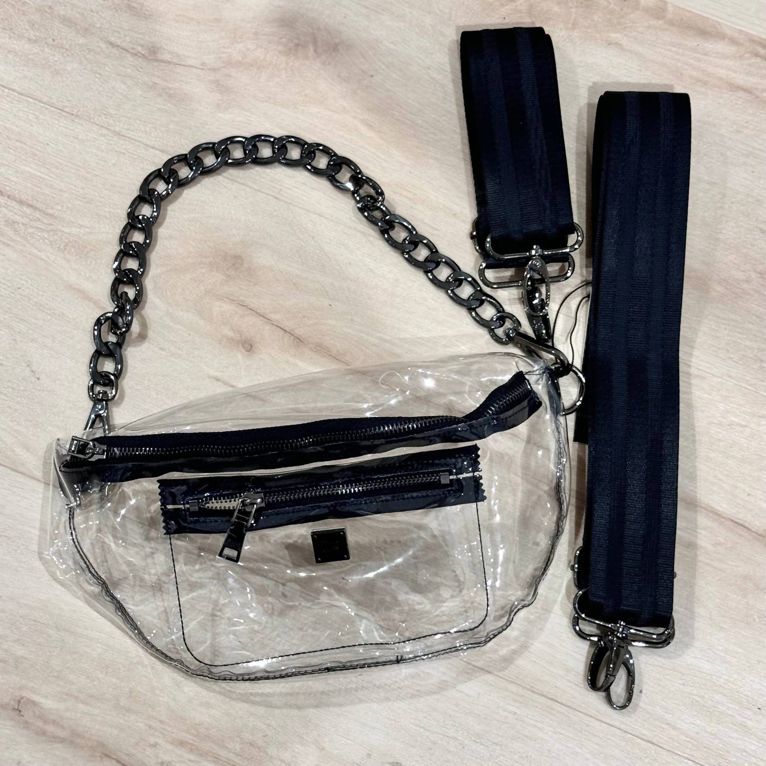 The crossbody bag is a trend that is here to stay and we especially love this style. Introducing the Women's Clear Crossbody Bag by THINK ROYLN, an essential accessory for events that require visible security without compromising on style. Featuring a top zipper closure and a front zipper pocket, this bag is designed for convenience and functionality. It offers multiple styling options with 3 detachable straps, including a chain handle with a 9" drop and adjustable crossbody straps varying from 15.5" to 54.75" in length. Dimensions: 7.5" H x 10.5" W x 2.5" D, making it the perfect compact companion for any occasion.