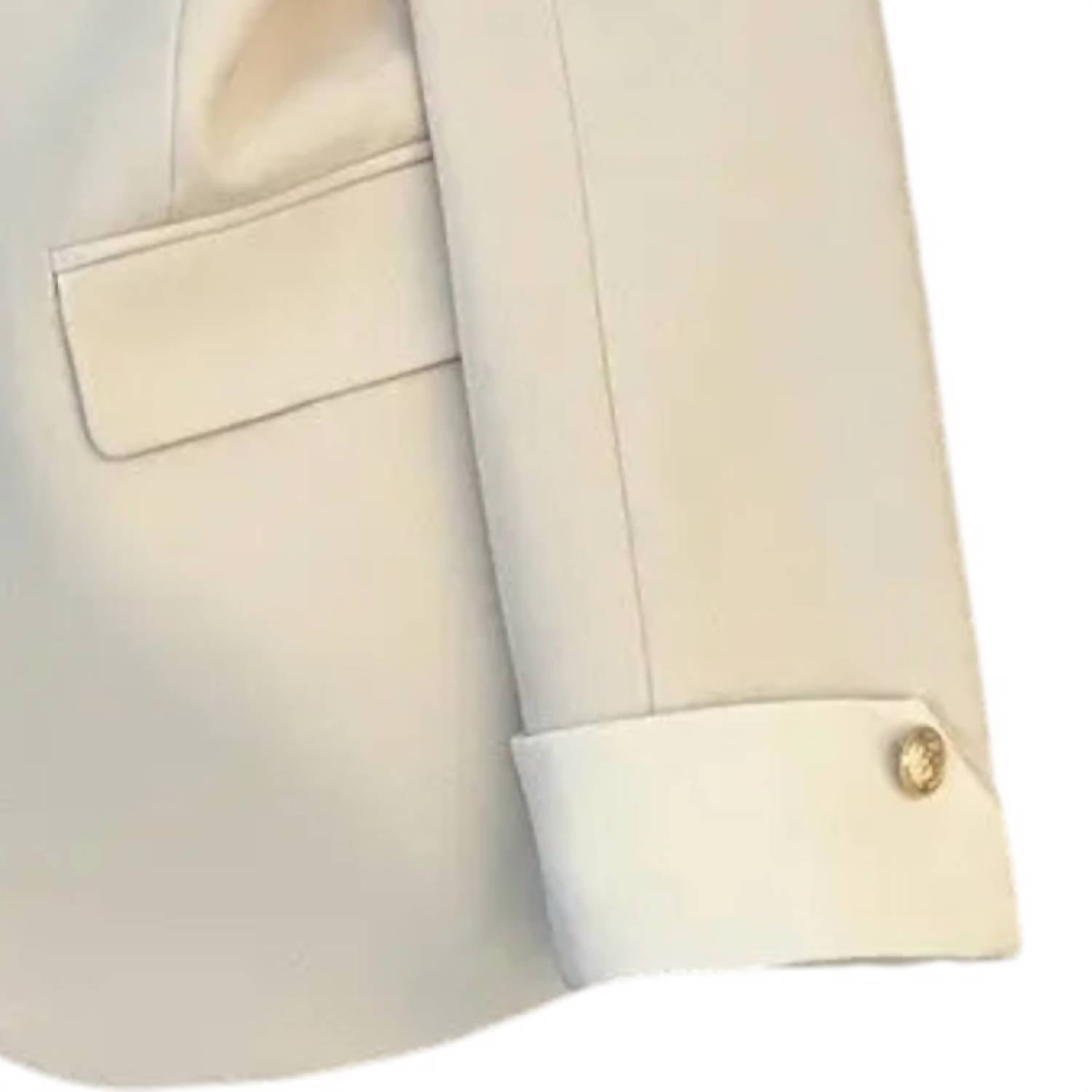 Introducing the Women's Leisure Style Block Sleeve Blazer by UZWholesale in an elegant cream hue, perfect for traveling in style. This sophisticated suit jacket features long raglan sleeves and a tailored collar, emphasizing both fashion and comfort. Crafted from a blend of elastane, dacron, and spandex, it offers a flexible fit ideal for workwear and various occasions. Designed with practicality in mind, this blazer includes pockets and a lined interior for a polished look.
