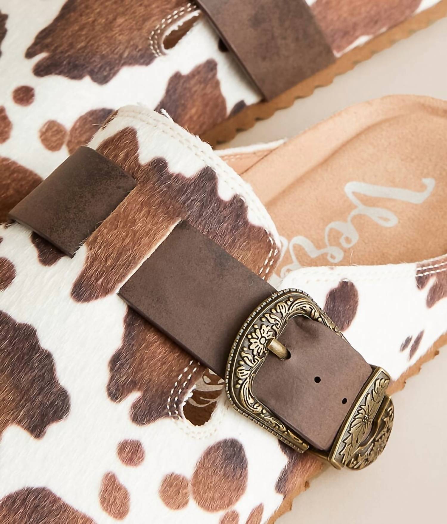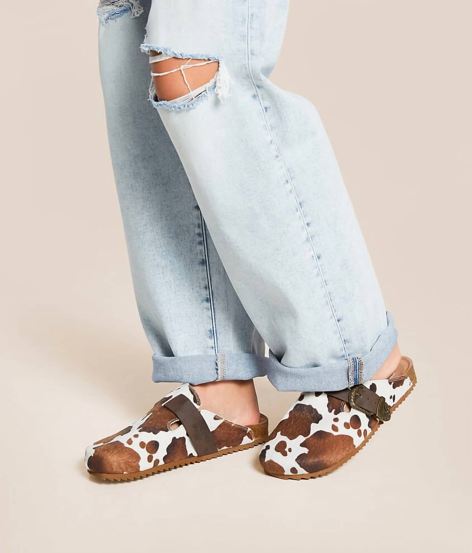 A trend that everyone is loving and this style might just be our favorite. Step into farm-fresh style with the Very G Andi Cow Print Mule. This eye-catching slip-on features authentic-looking cow print, a comfortable contoured footbed, and rustic buckle detail. Perfect for casual outings, these mules combine western charm with everyday comfort. Pair with jeans or a sundress for an instantly elevated country-chic look. Faux fur western buckle slip-on mule Cushioned footbed