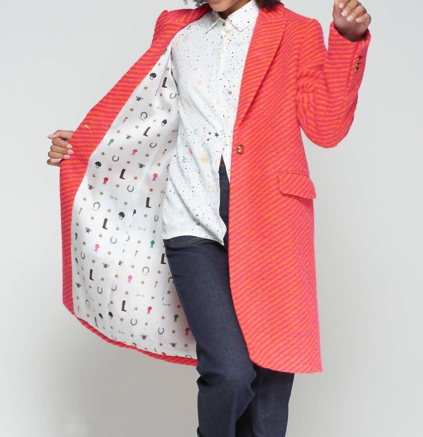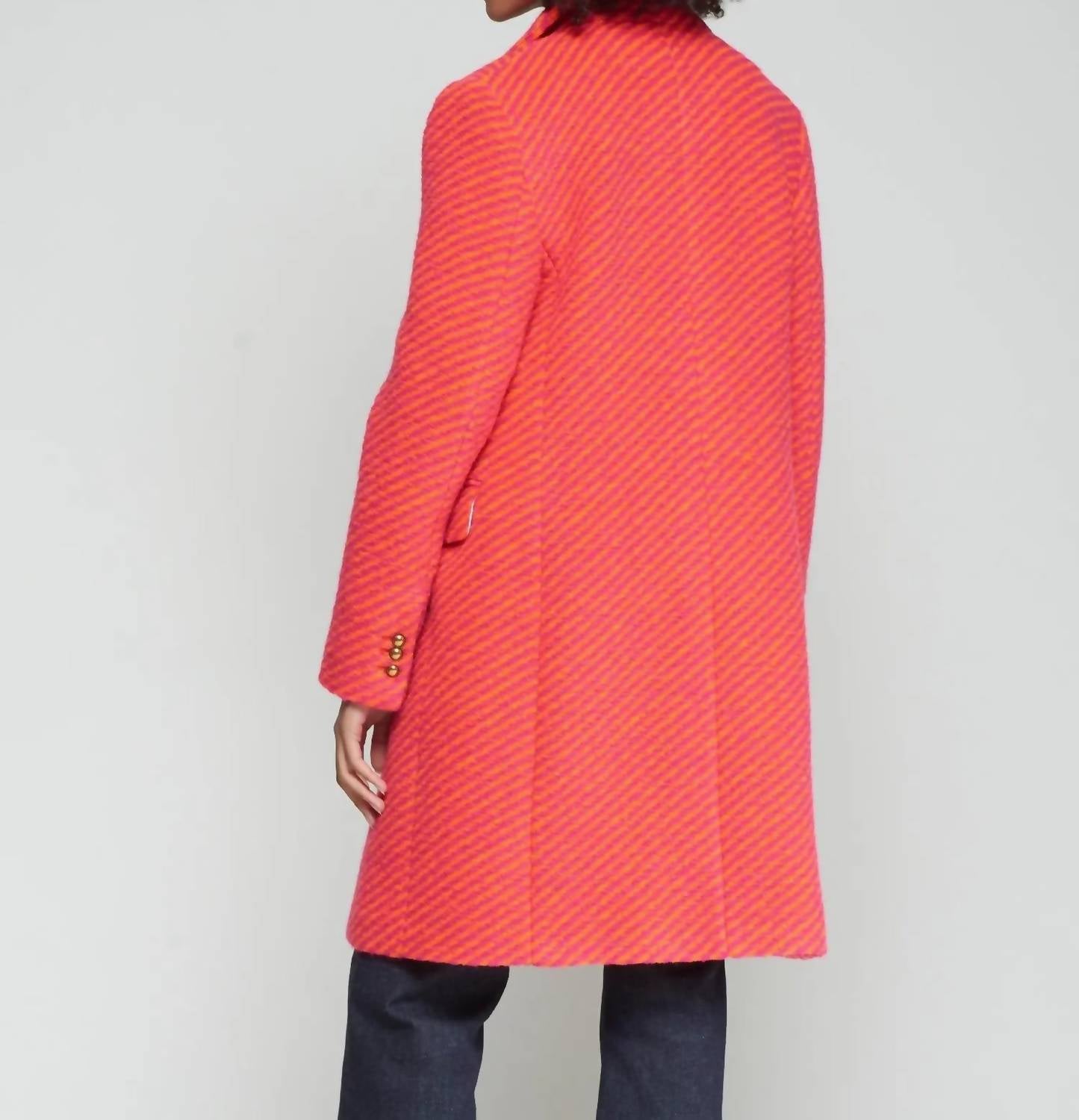 Classicly chic, this is the kind of trench coat that never goes out of style. Introducing the Vilagallo Diagonal Striped Coat, a bold winter wardrobe statement in vibrant orange and pink. This long-sleeve trench coat combines style with warmth, featuring a composition of 50% Polyester, 47% Virgin Wool, and 3% Other Fibers. Closure: Button closure. Designed for those who embrace striking patterns, it's the perfect choice for engagements and New Year's Eve celebrations.