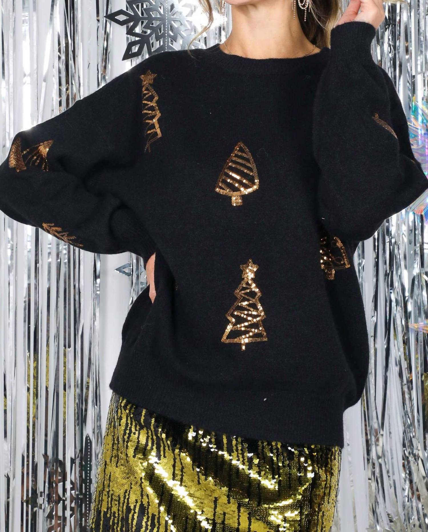 Stay warm and stylish in this versatile and effortlessly cool knitwear staple. Wear it alone or layered, it's the perfect sweater for the season and you'll wish you had it in every color. Perfect for holiday gatherings, the Gold Tree Sequin Knitted Crew Sweater by Vine & Love offers a festive touch with its shimmering sequin accents. This women's long sleeve pullover comes in an elegant gold and black combo, providing a soft touch and breathable feel for comfort. The knit fabric, featuring a ribbed crew neckline and casual drop shoulders, combines style with practicality for a preppy look. Designed for machine wash, this sweater is a striking choice for any holiday party.