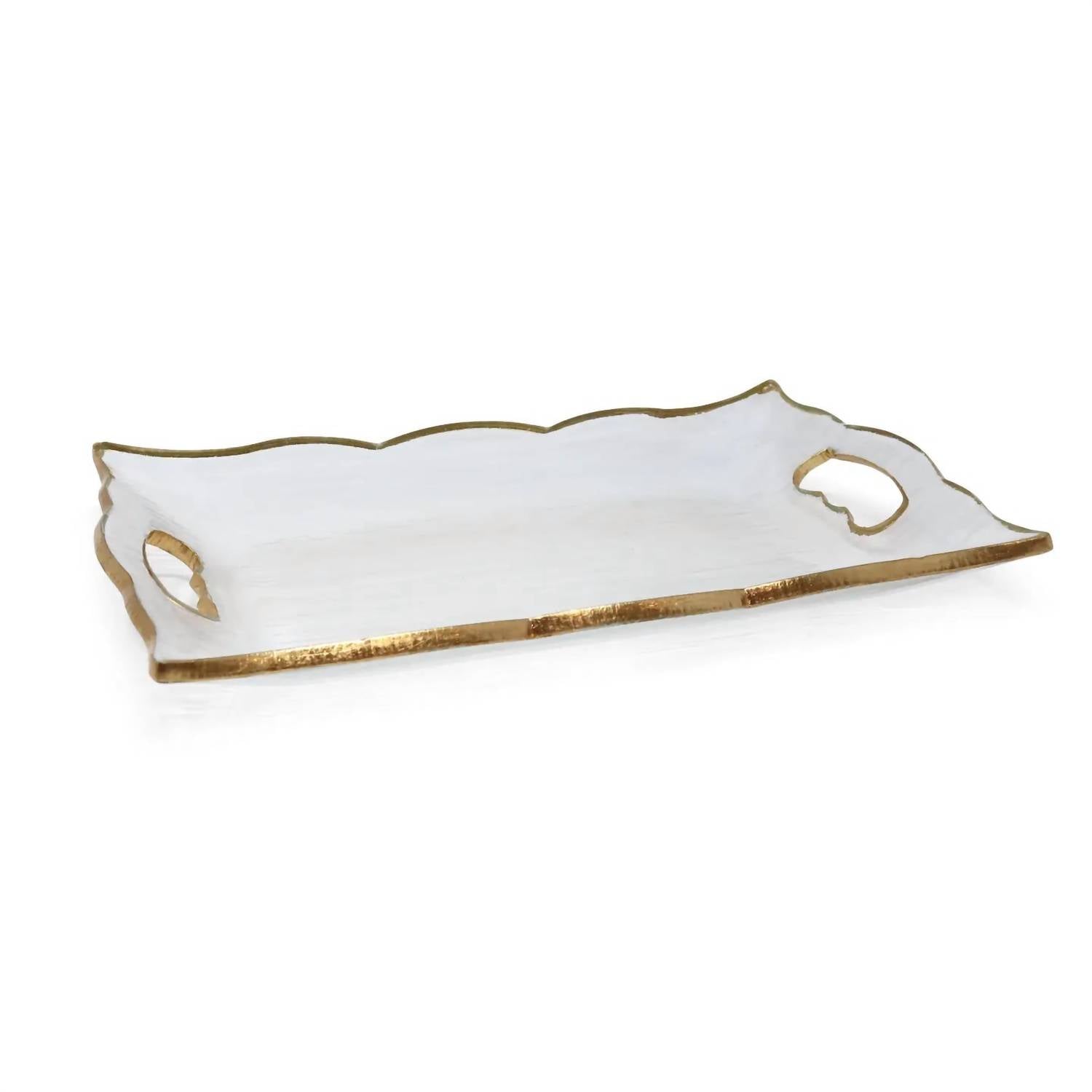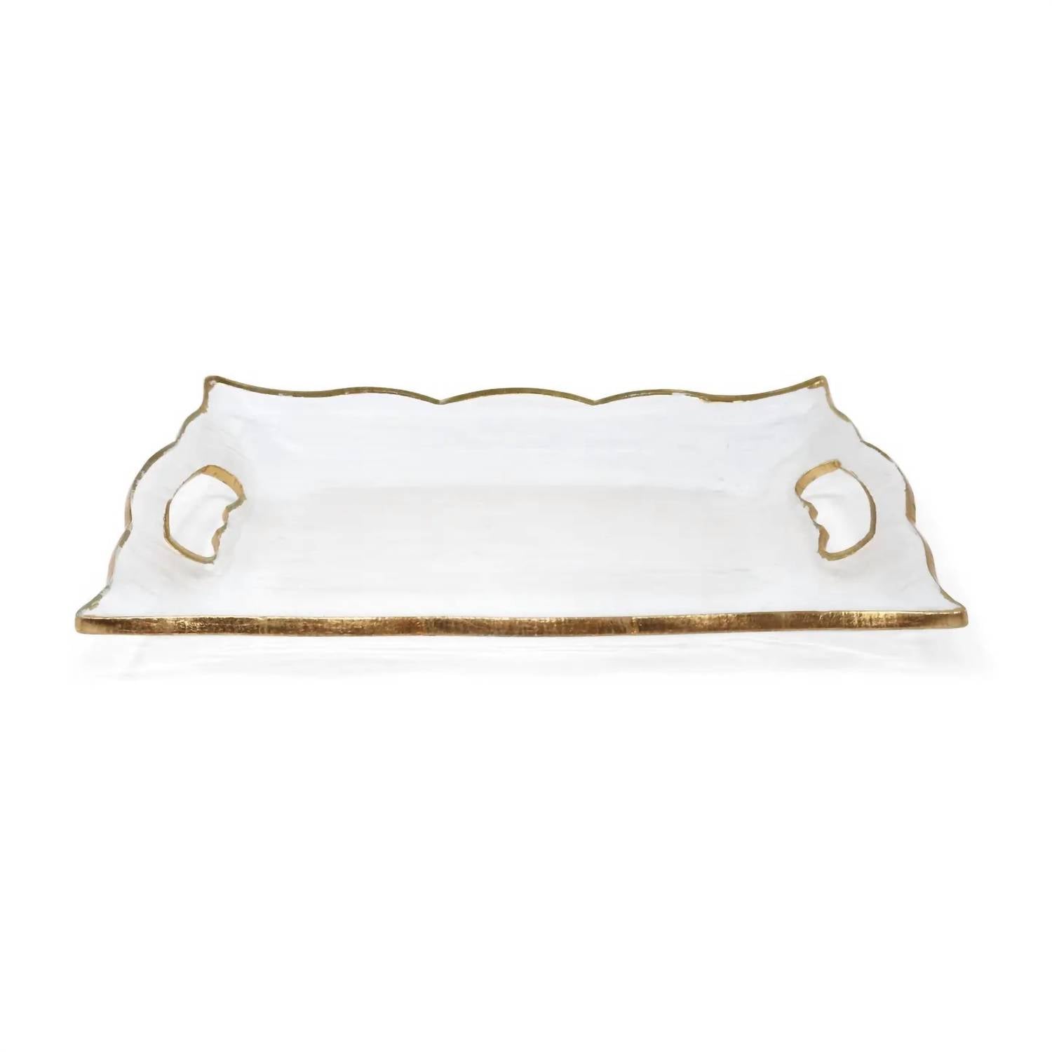 The VIVIENCE Medium Sized Rectangular Glass Tray combines functionality and elegance with its durable glass construction and striking gold scalloped rim. Its handles make it perfect for serving snacks, meals, and drinks, adding a modern, timeless flair to any home décor. Measuring 13.75 inches long and 9.75 inches wide, this versatile serveware piece in classic white is both stylish and practical.