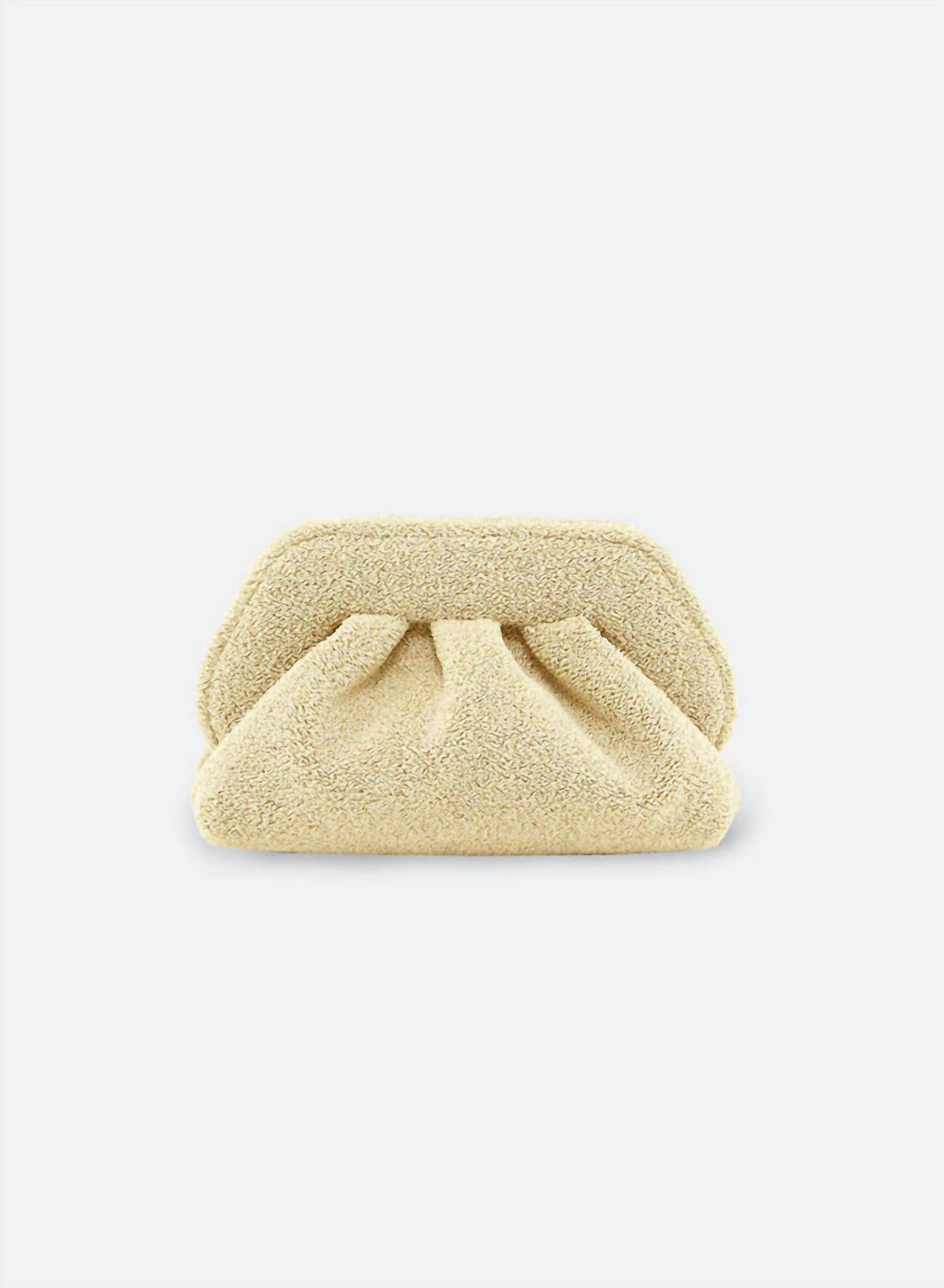 Clutch Bag. Detachable Shoulder Strap. Top Magnetic Closure. Lining 100% Recycled Materials. Made in Italy. Height 16cm. Width 30cm. Depth 11cm. Vegan Fabric. Sponged Surface. Cotton. PA. Durable. No Animal Suffering.