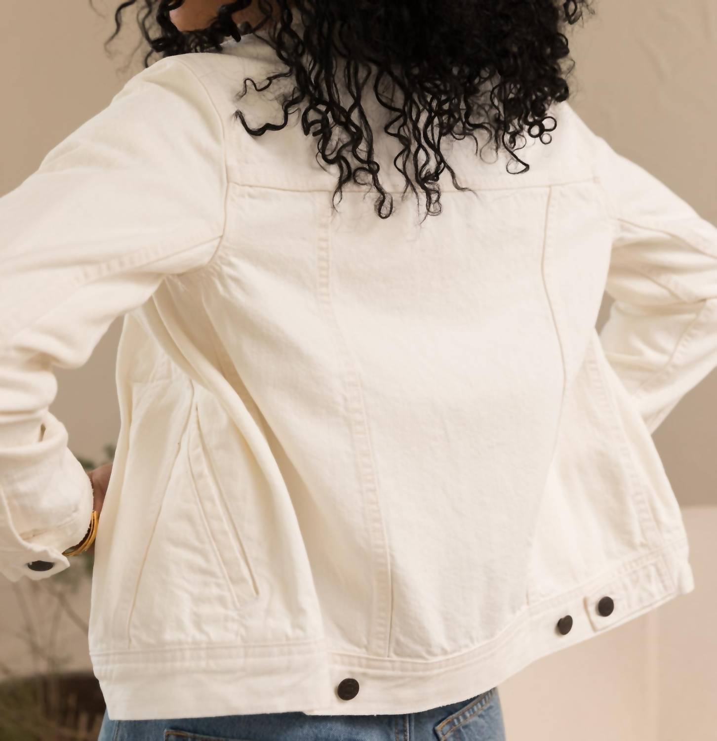 Classic, cool and works with almost any outfit choice. Discover the Bailey Jacket by ABLE, a stylish addition to any wardrobe in classic white. This jean jacket offers the timeless appeal of long sleeves and a collar, crafted from durable cotton. Featuring a textured pattern and convenient button closure, it's both functional and fashionable. Care: Machine wash for easy maintenance.