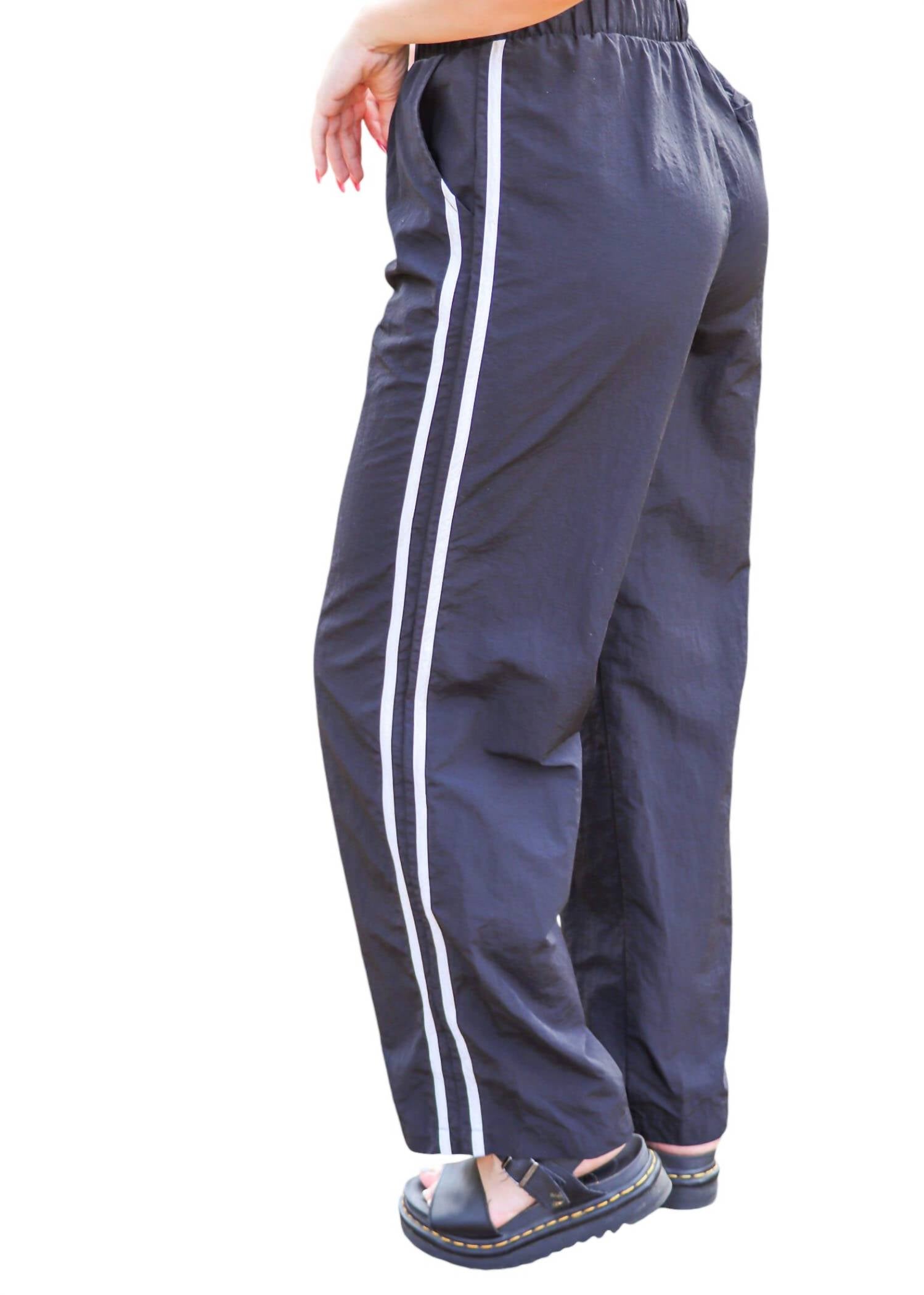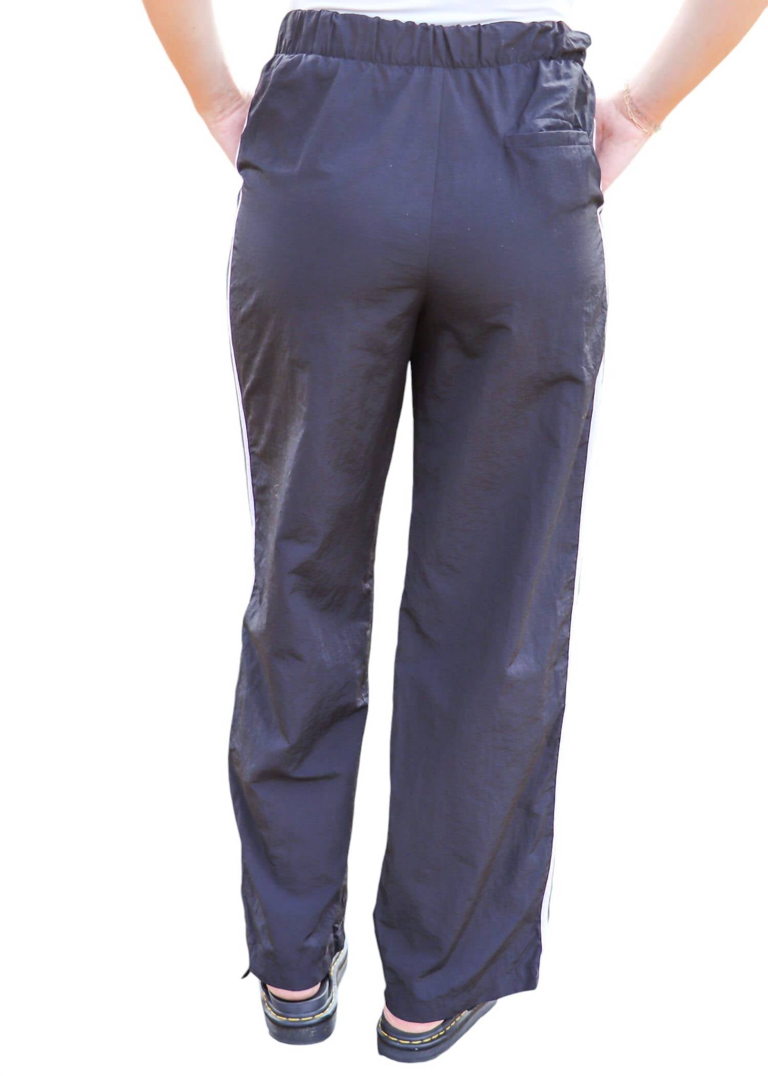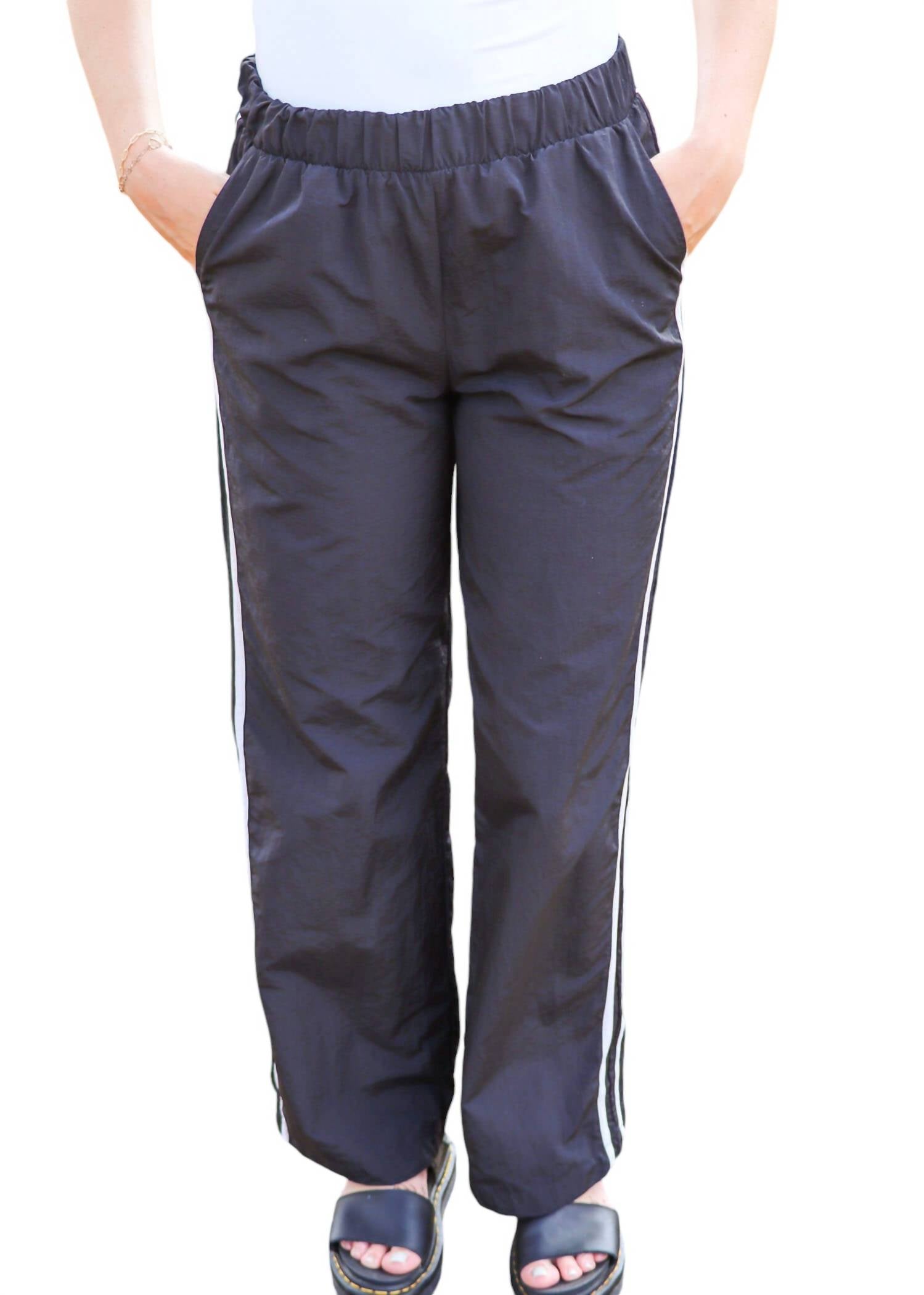 These athletic-inspired nylon pants are designed for both comfort and style. Featuring a high-waisted fit, side detailing, and pockets for storage, they're perfect for everyday wear. The elastic waist adds extra comfort, while the black with white detailing offers a sleek look. Maggie, who is 5'7" with a 32B bust and a 24"-25" waist, is wearing the XS, which runs true to size.