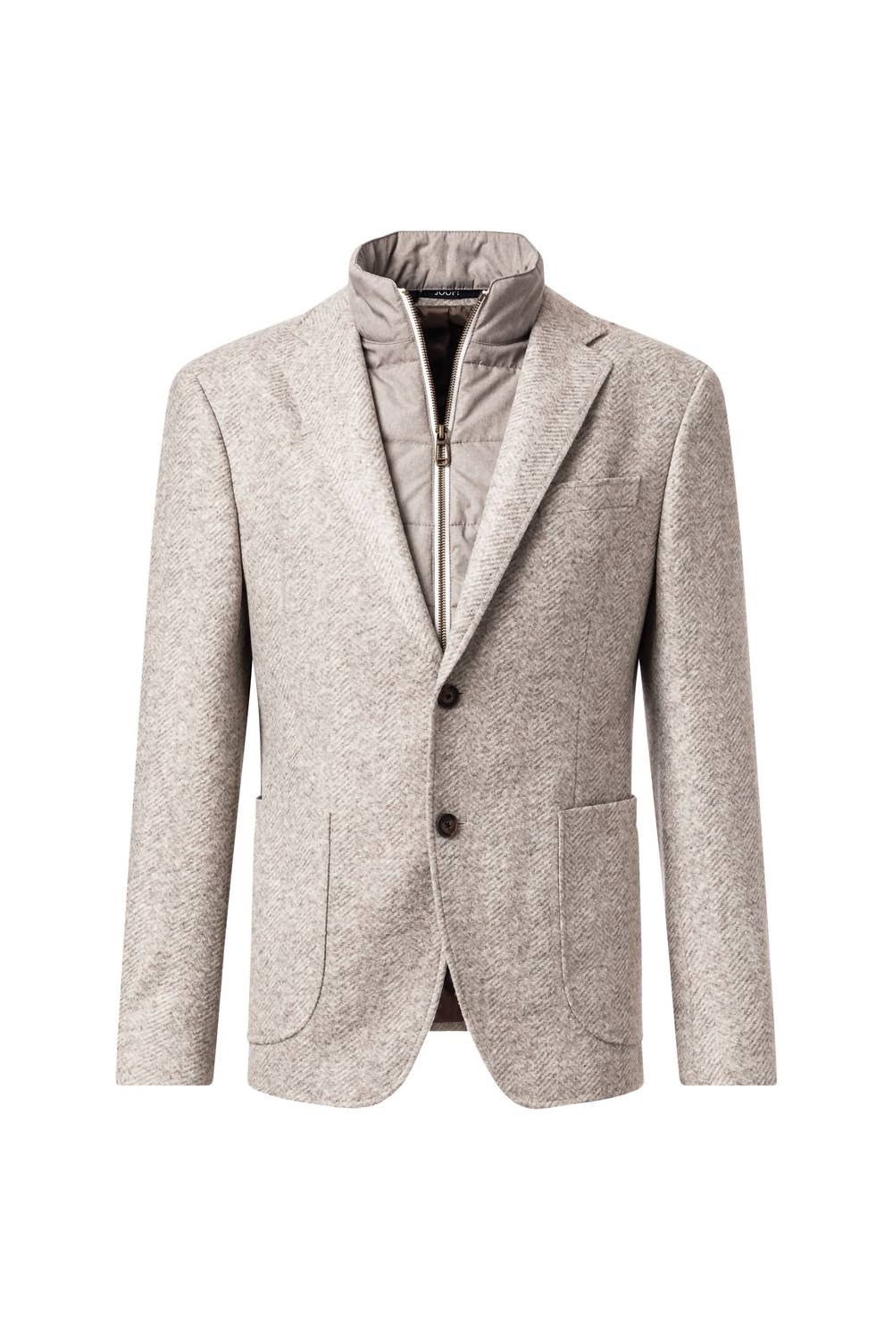 The Men's Hecton Insulated Sportcoat by JOOP! in Beige Herringbone is a sophisticated addition to any wardrobe. Crafted with long sleeves and a luxurious Italian wool blend, this blazer features a detachable quilted inlay with a stand-up collar and zip, alongside classic notched lapels. The single-breasted button closure and duo design vents enhance its tailored appeal, while the flowing lining and shoulder pads add comfort. Perfect for a slim fit, this sportcoat boasts inset sleeves with decorative slits, multiple pockets, and shaping darts for a refined look.