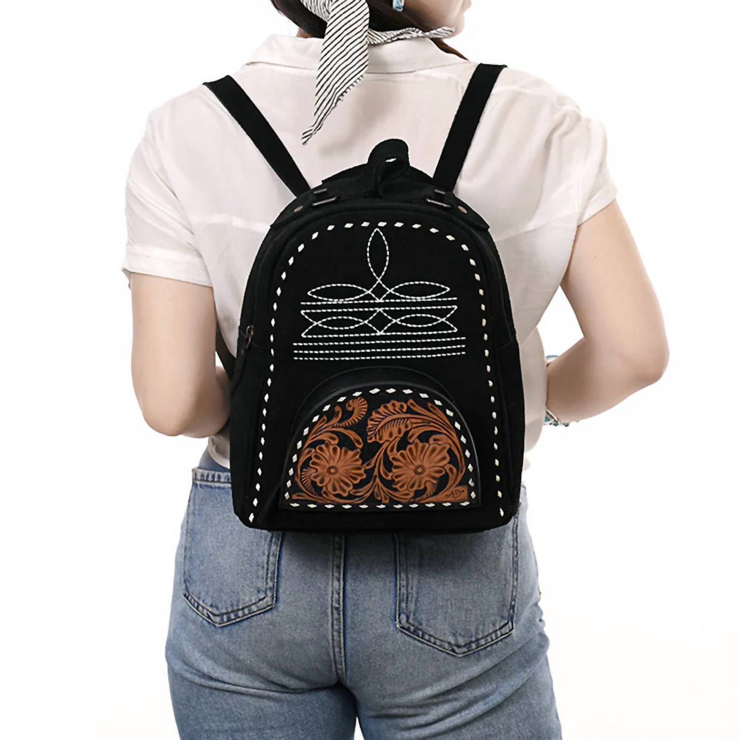 A backpack so versatile, you'll want to carry this with you everywhere. Introducing the Women's Genuine Western Leather Backpack by American Darling, an exquisite blend of elegance and practicality. Crafted from premium genuine leather, this backpack showcases intricate Western-inspired detailing in timeless black. The spacious main compartment and additional pockets provide ample space for all your essentials, ensuring everything stays organized and accessible. Adjustable straps offer a comfortable fit, making it ideal for daily use, whether for school, work, or travel. Its durable construction and secure closures promise lasting performance, while its versatile design perfectly complements casual and boho styles.