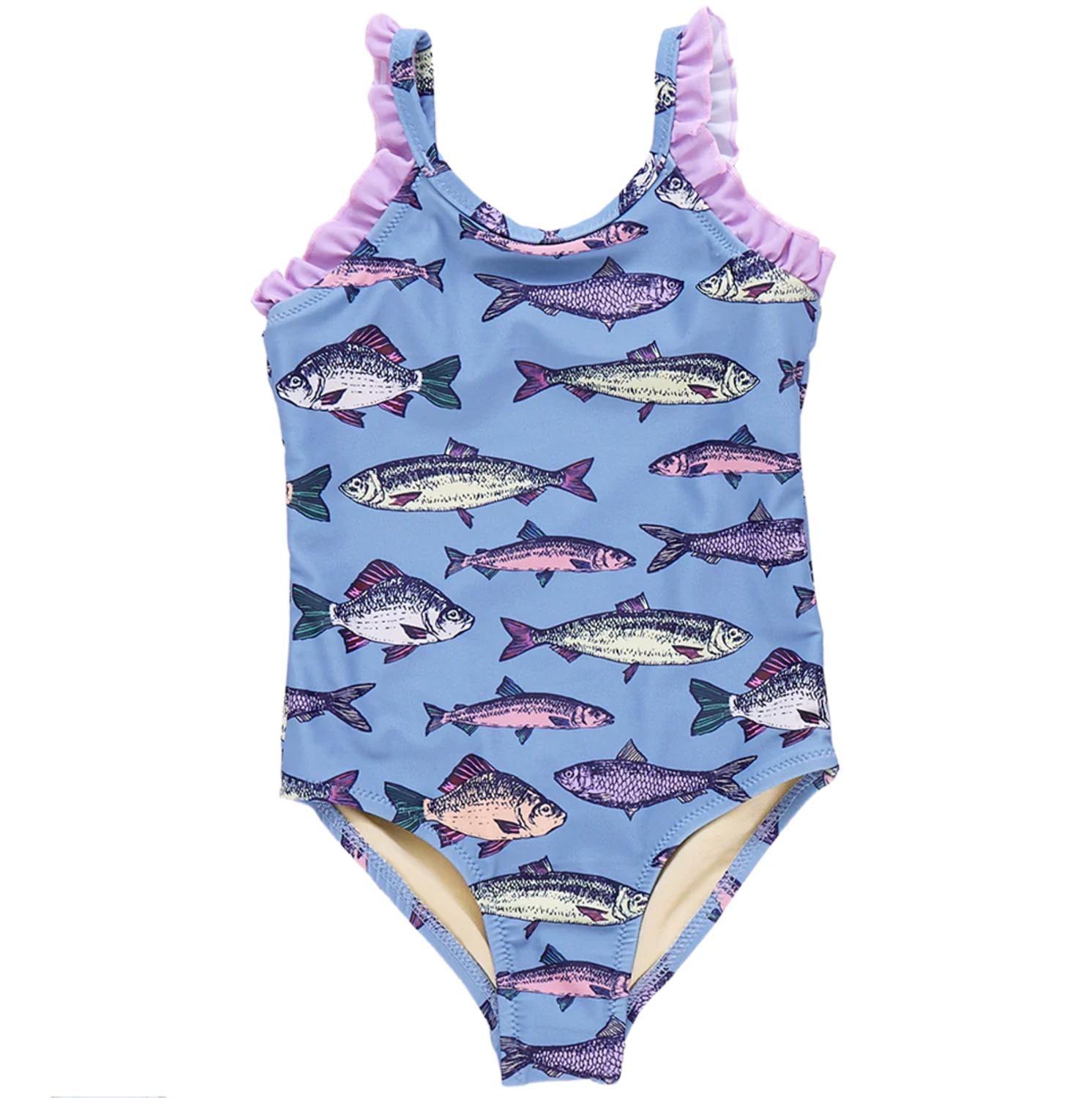 Introducing the Girl's Claire One-piece Swimsuit by PINK CHICKEN, a vibrant addition to your little one's summer wardrobe. This swimsuit, adorned with a colorful animal pattern, features a playful lavender ruffle embellishing the shoulder, neck, and back, complementing the Blue Multi base. Material: Nylon. Care: Machine wash and tumble dry, ensuring ease of maintenance for busy beach days.