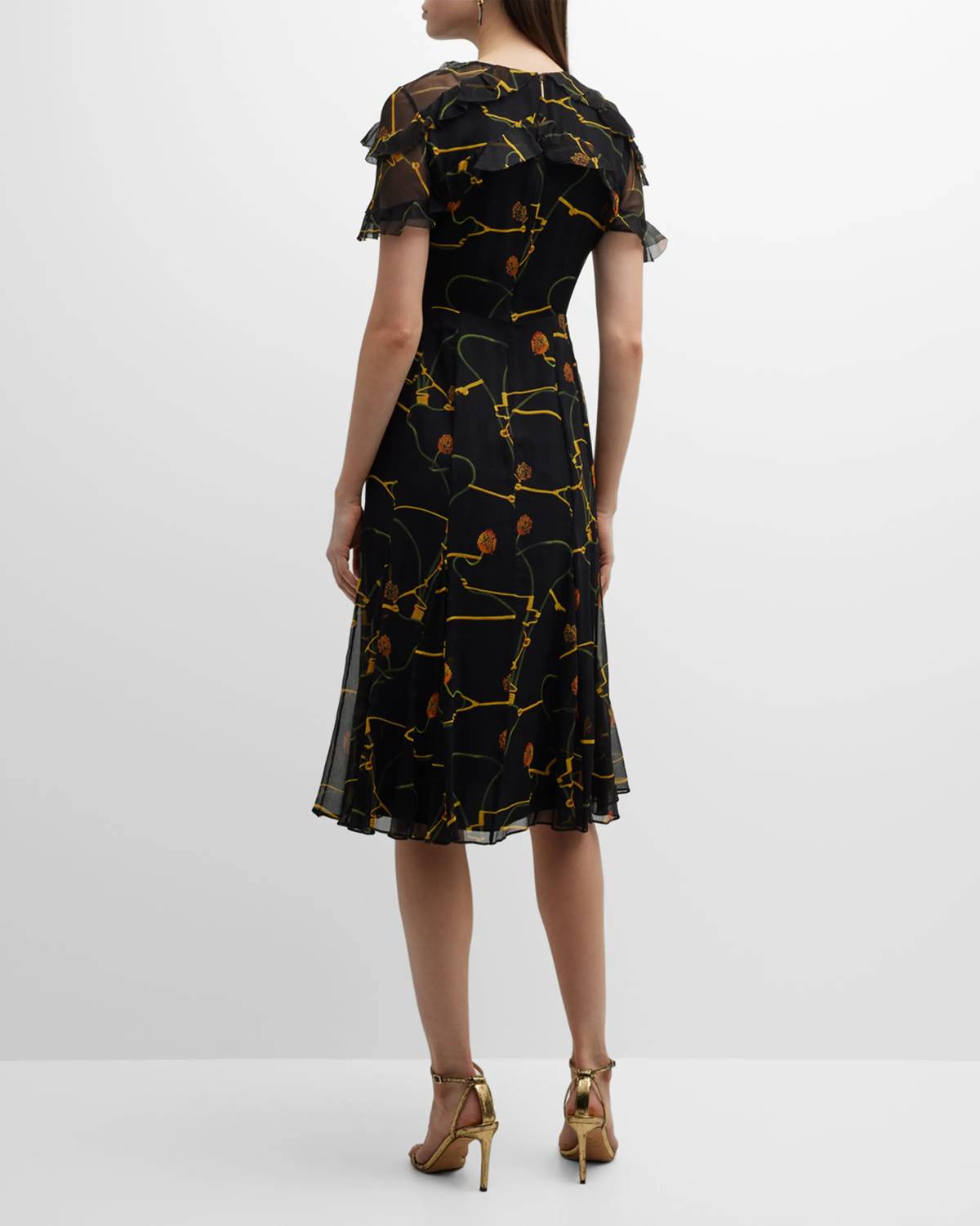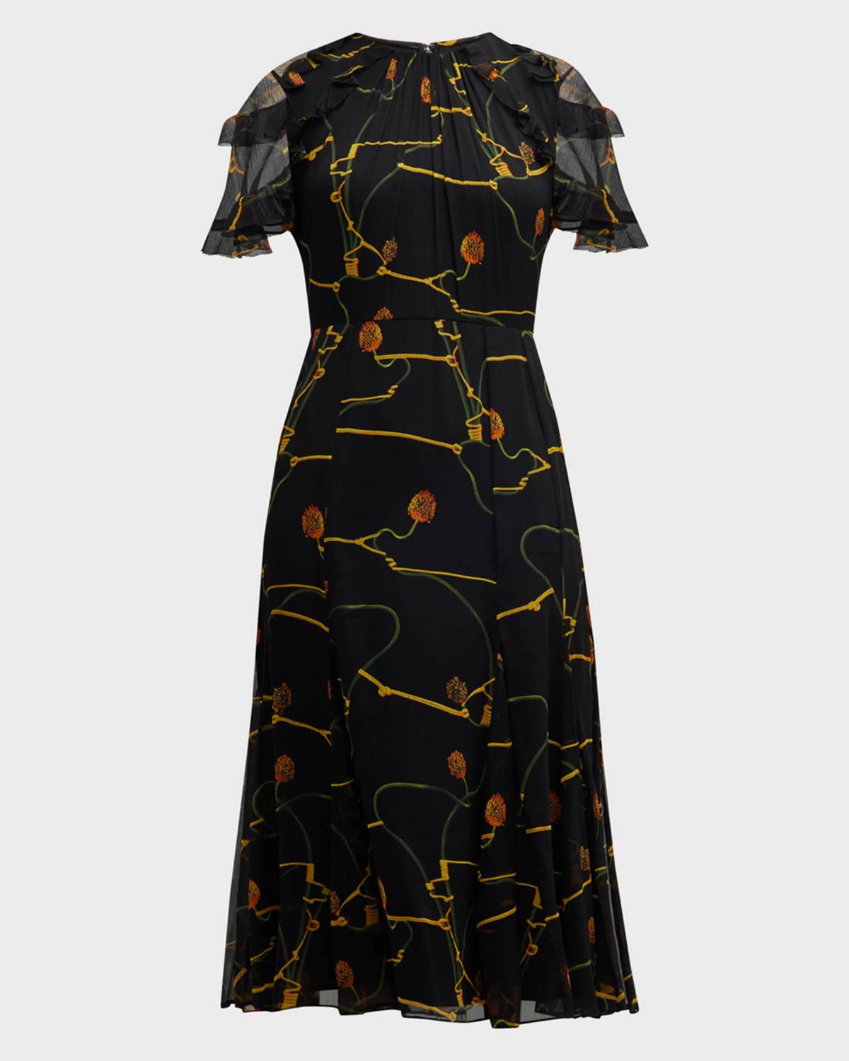 Silk crinkle day dress in an allover floral print with chiffon ruffle details at the sleeves . Round neckline. Short sleeves. Concealed back zip. Hem falls below the knee. A-line silhouette. Dry clean. Model is 5'10"/177cm.