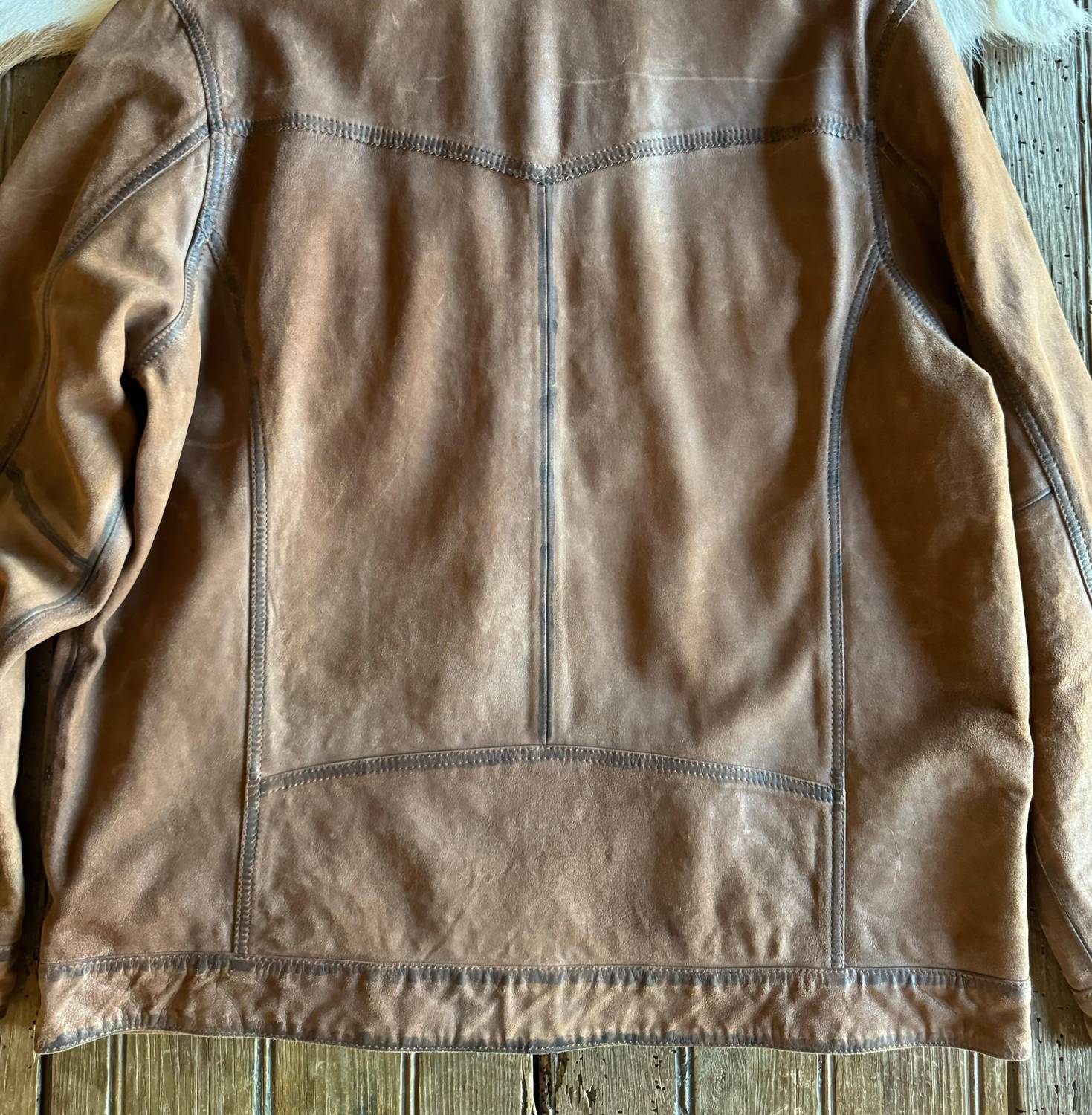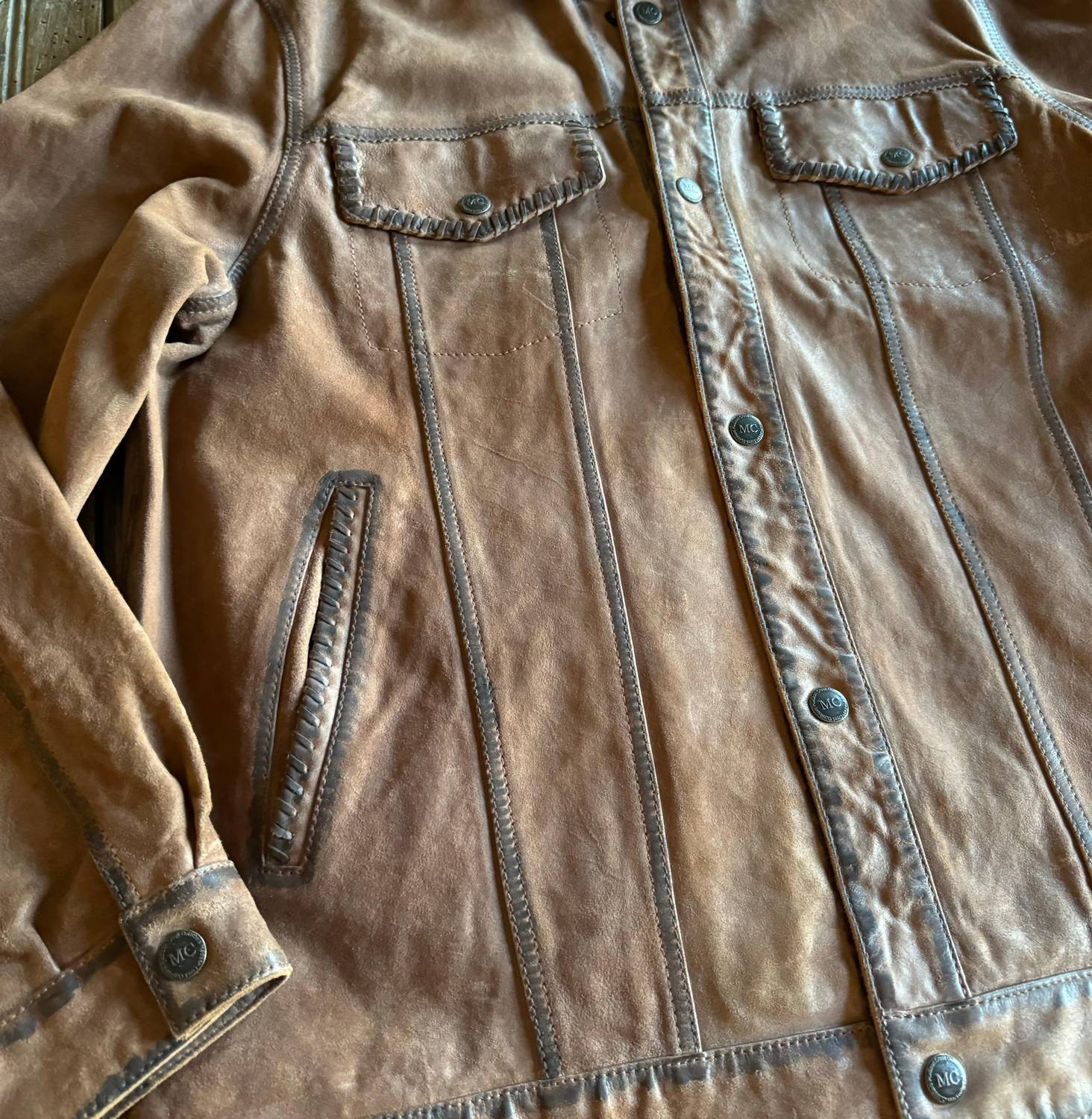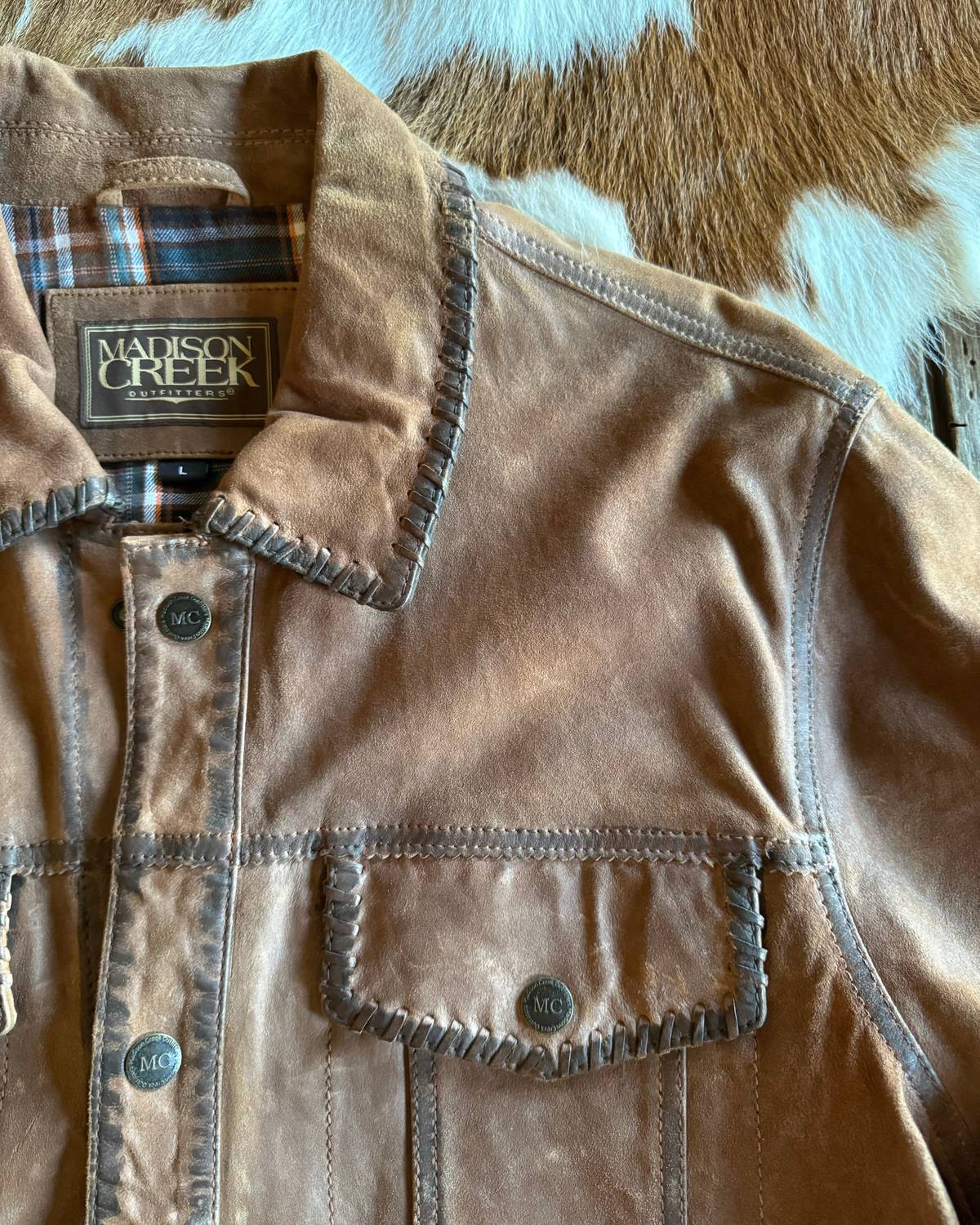 Elevate your outerwear collection with the Men's Santa Fe Goat Nappa Leather Jacket by Madison Creek Outfitters. This long sleeve jacket is crafted from 100% soft washed goat nappa leather in a rich antique brown, featuring whip stitching details and a zip front closure. It includes two lower slant pockets with whip stitching, adjustable cuffs, and the brand's signature check lining. Proudly showcasing modern yoke and back accents, this jacket requires professional leather cleaning.