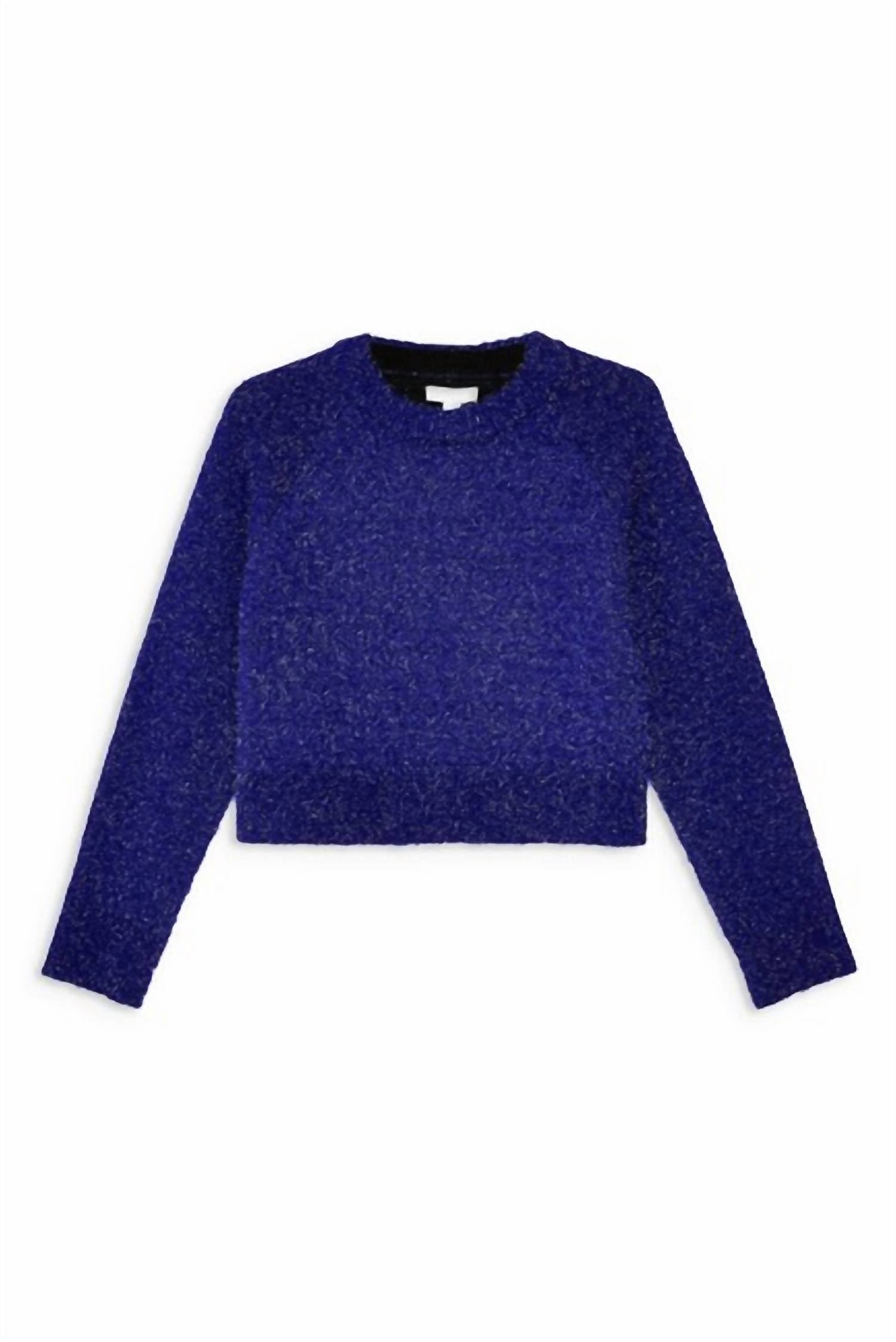 Get ready to sparkle in a fuzzy cropped sweater that combines a gorgeous royal-blue hue with tinsel-like shimmer