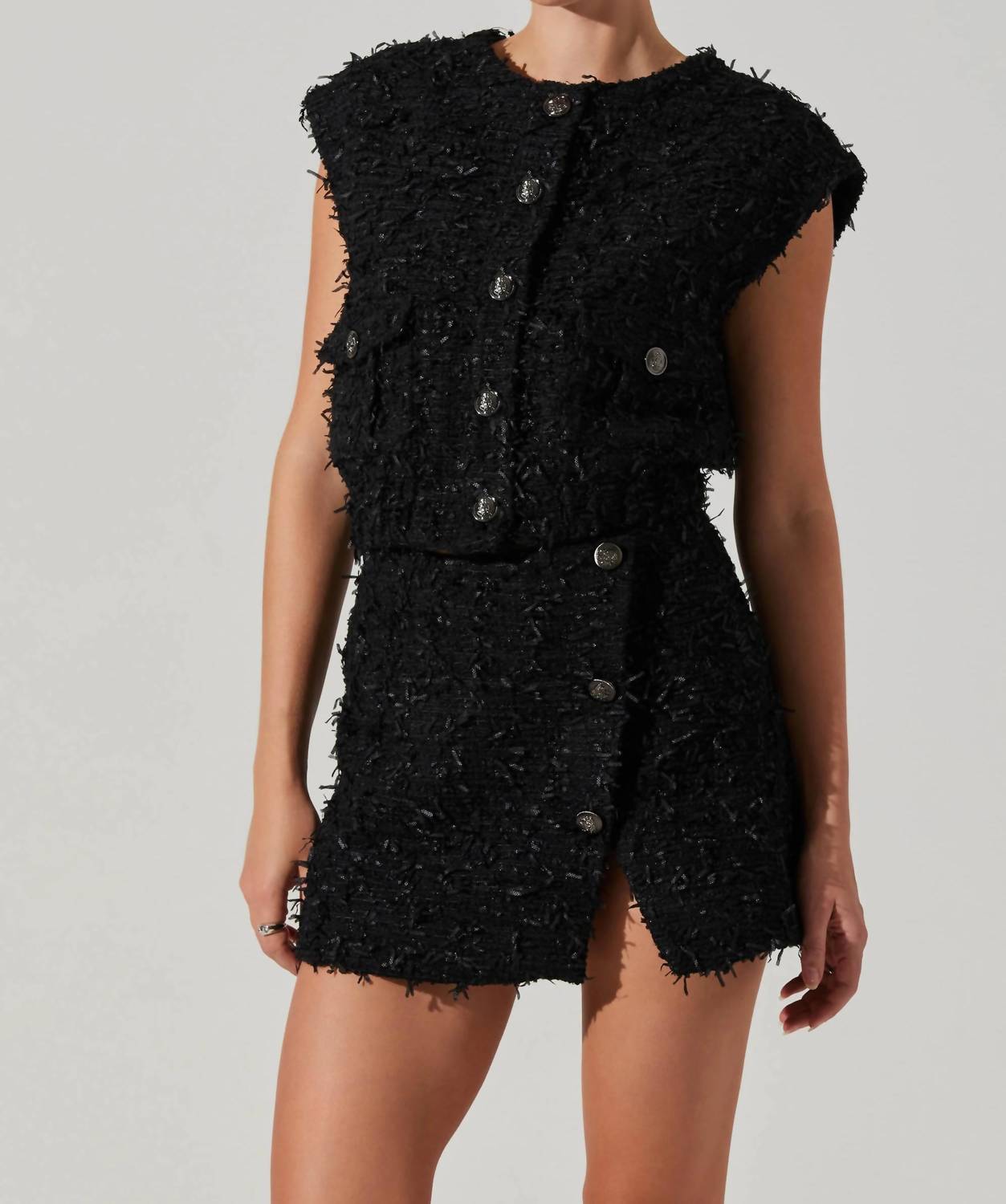Show just the right amount of leg in this fit flattering mini. Elevate your style with the Pedrine Skirt by ASTR, a chic mini in classic black. Crafted from a wool blend, this textured tweed skirt measures 14.25" in length and features a small slit at the bottom left hem. Its fully lined design incorporates buttons at the center front for a polished finish. Composition: 83% Polyester, 10% Cotton, 7% Wool; Lining: 100% Polyester. Closure: Button closure. Care: Dry clean only.