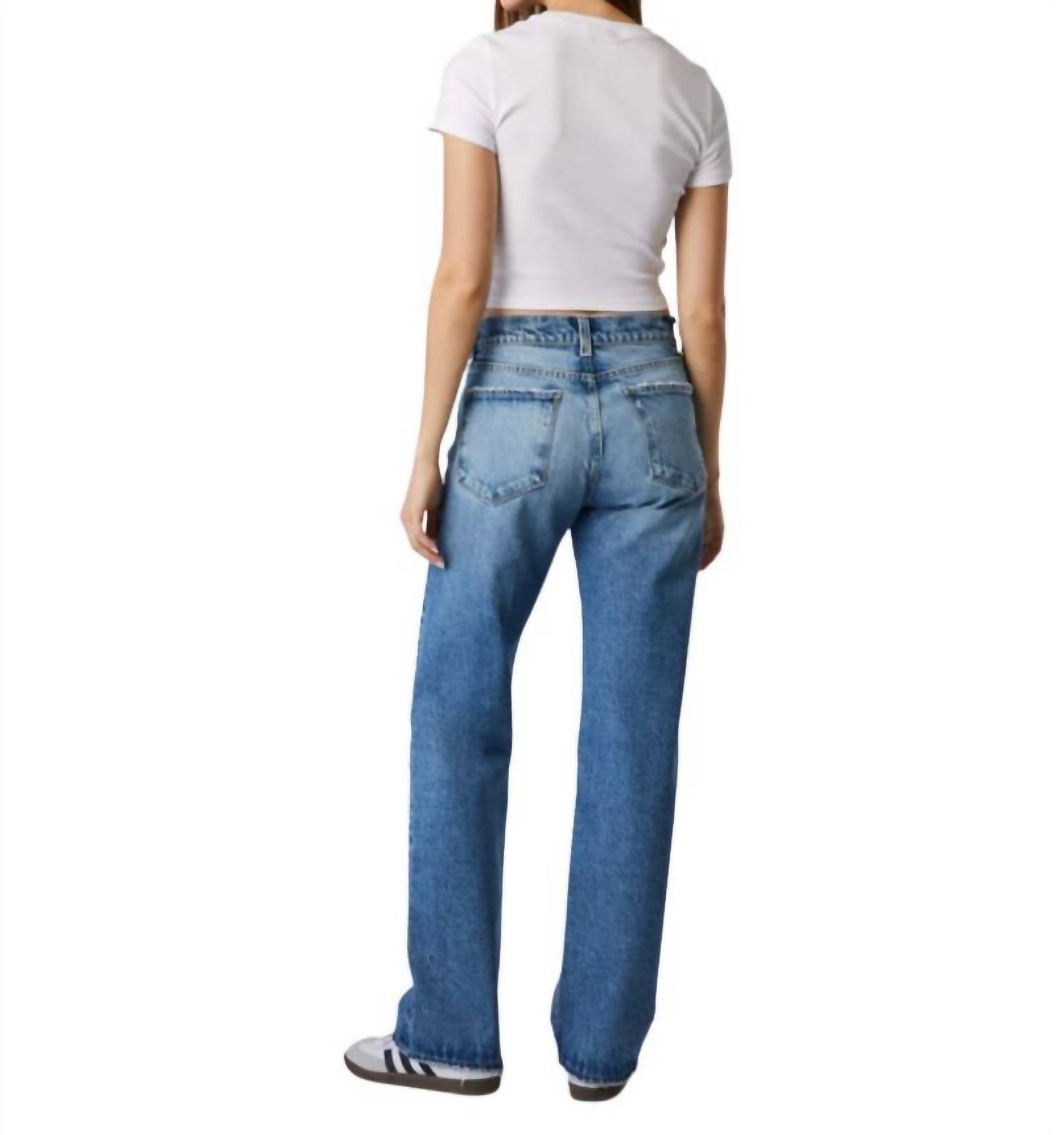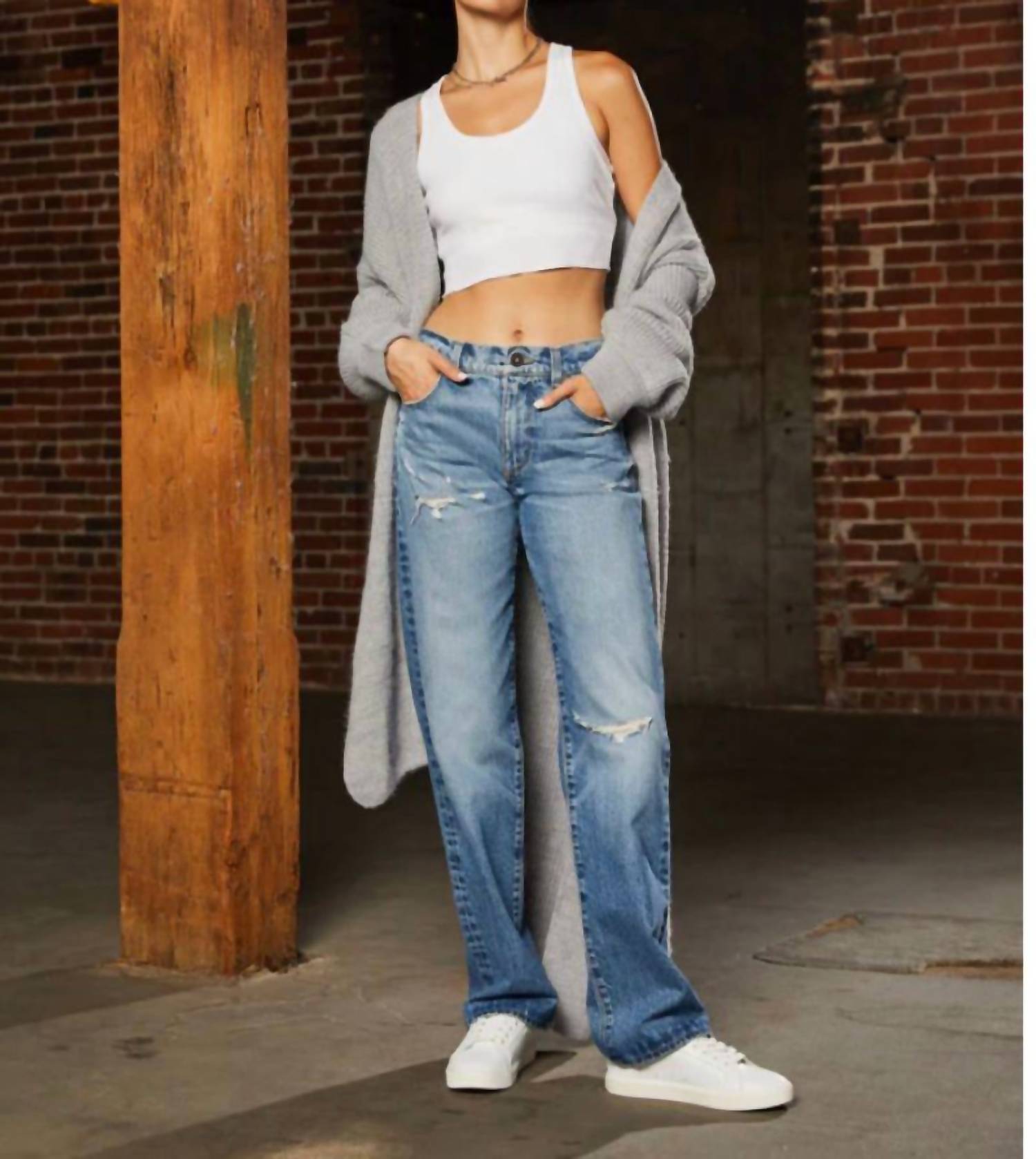 A vintage slouchy fit wide leg that is relaxed throughout in a long inseam. Closure: button zip fly. Rise: high. Fit: slouchy puddle wide leg, long 32" inseam. Fabric: rigid non-stretch. Hem: clean.