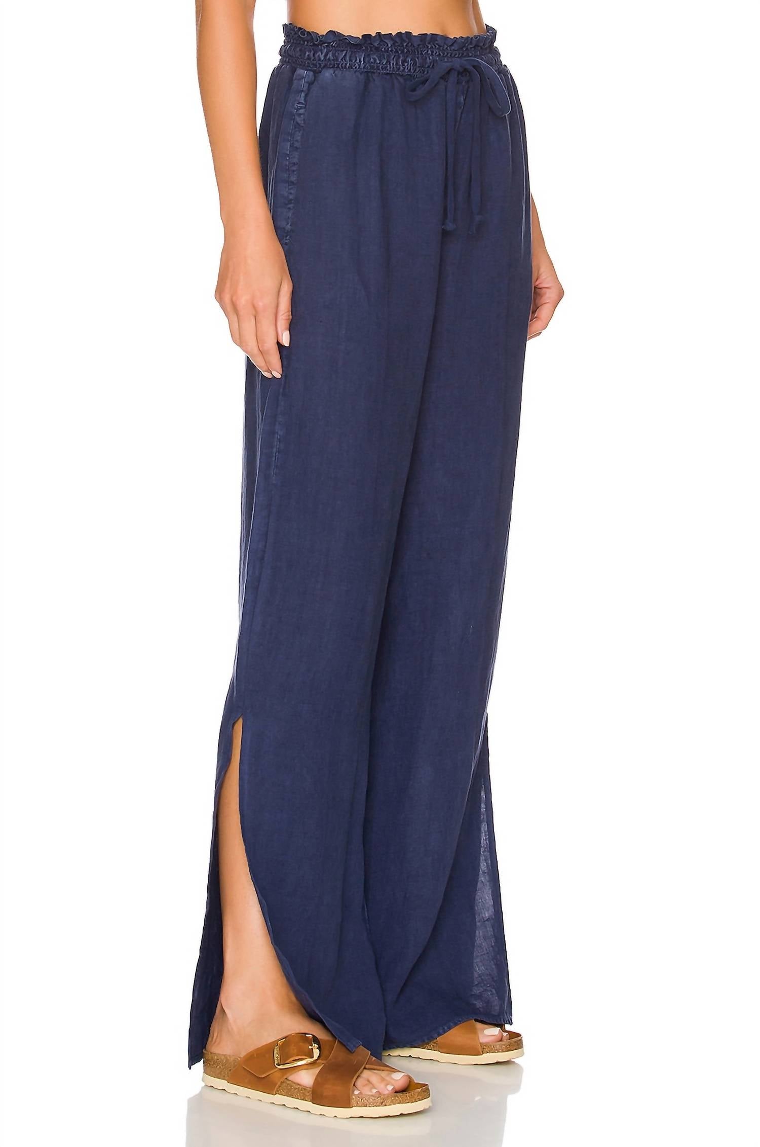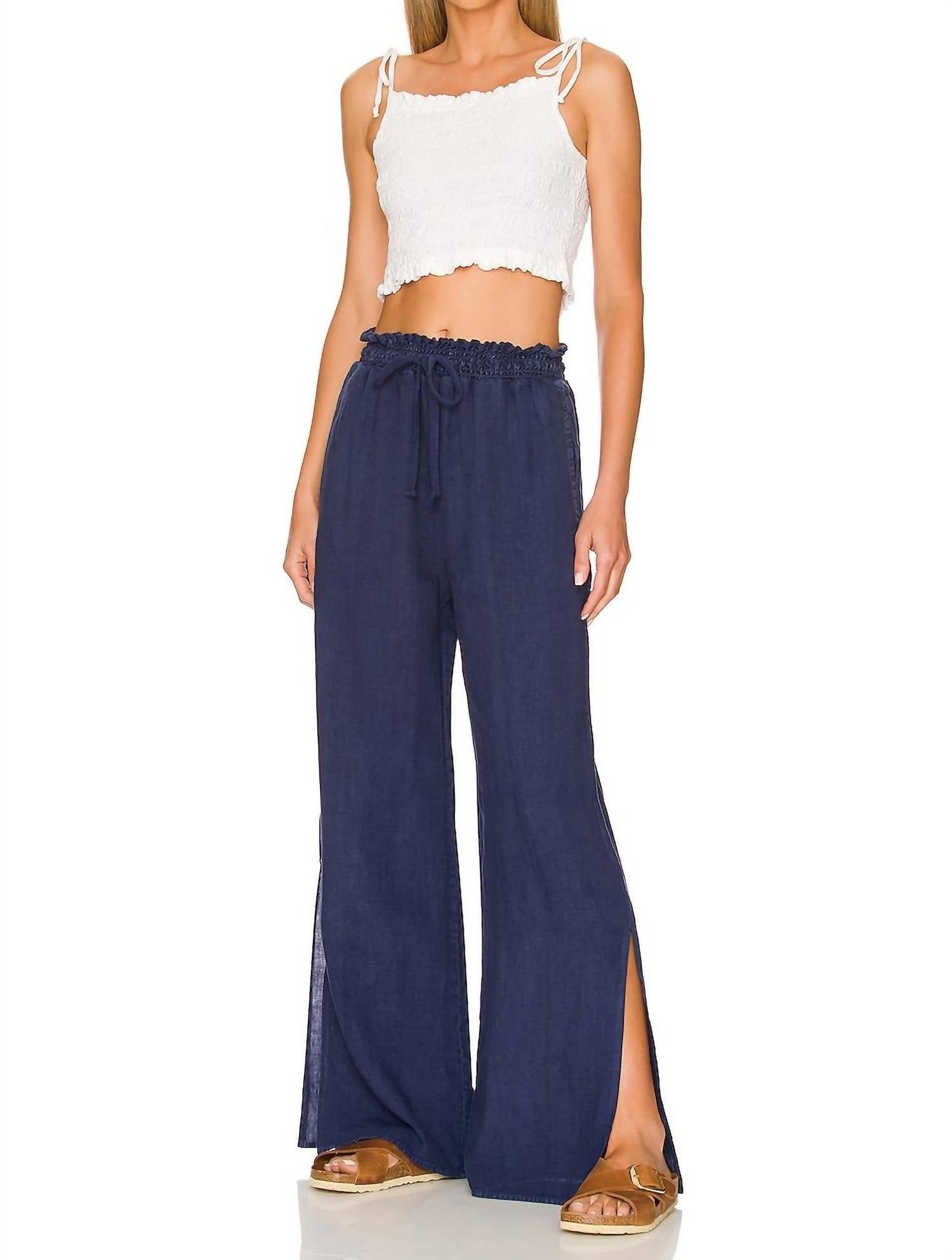 The Smocked Waist Side Slit Wide Leg Pant by Bella Dahl offers relaxed elegance with its lightweight chambray fabric in a rich Marine Blue hue. Crafted from 100% linen and proudly made in the USA, these pants feature a comfortable high-rise fit with a 14.0" rise, perfect for all-day wear. The design includes a pull-on closure with a shirred waist and drawstring, complemented by side slant pockets and a stylish side seam slit. Care maintenance is straightforward with easy machine wash instructions, adding to their practicality.