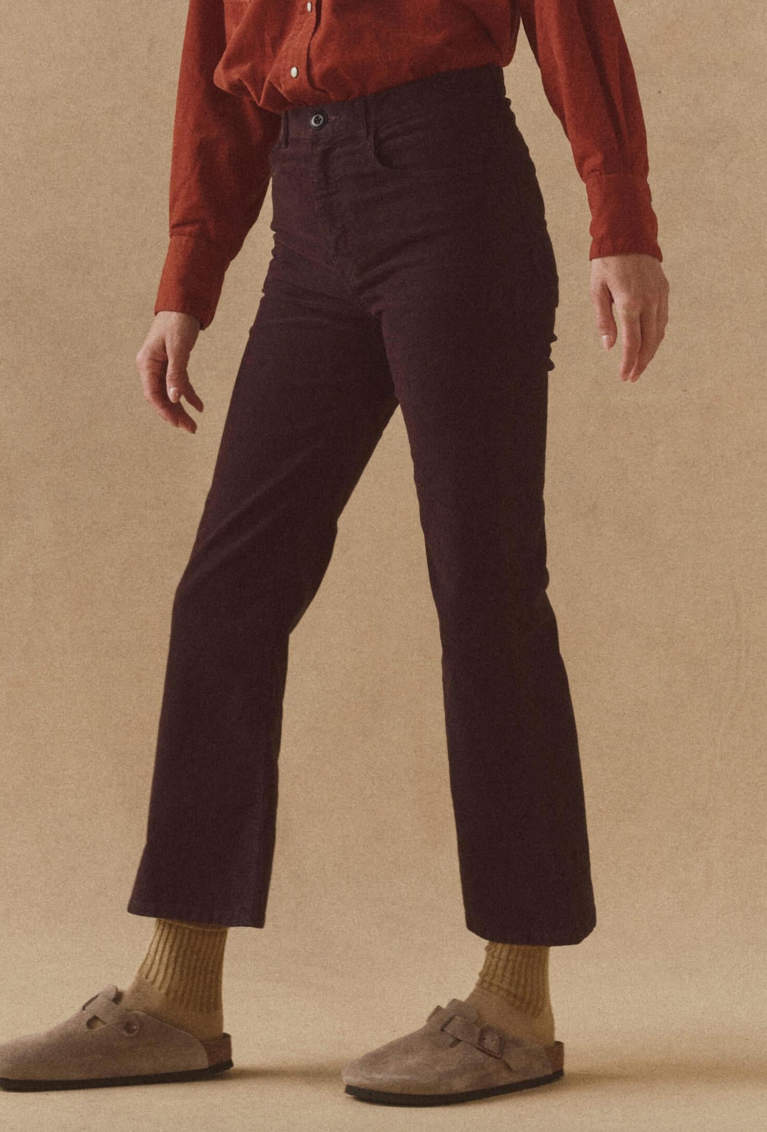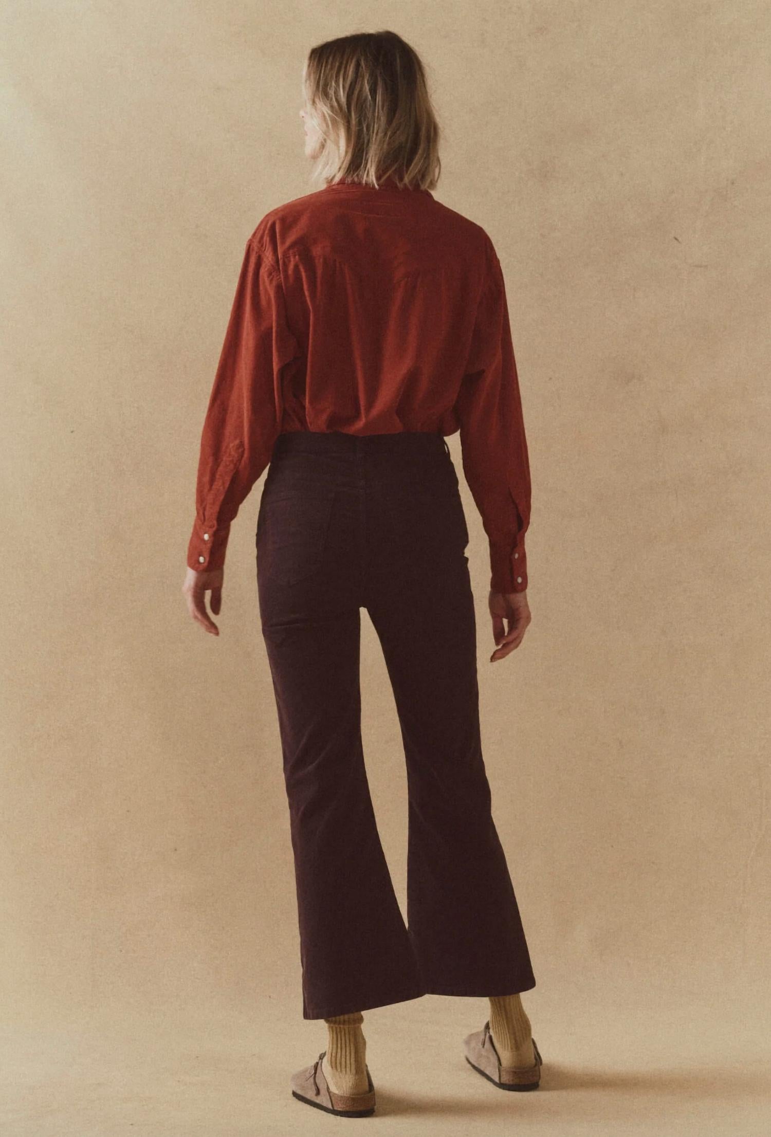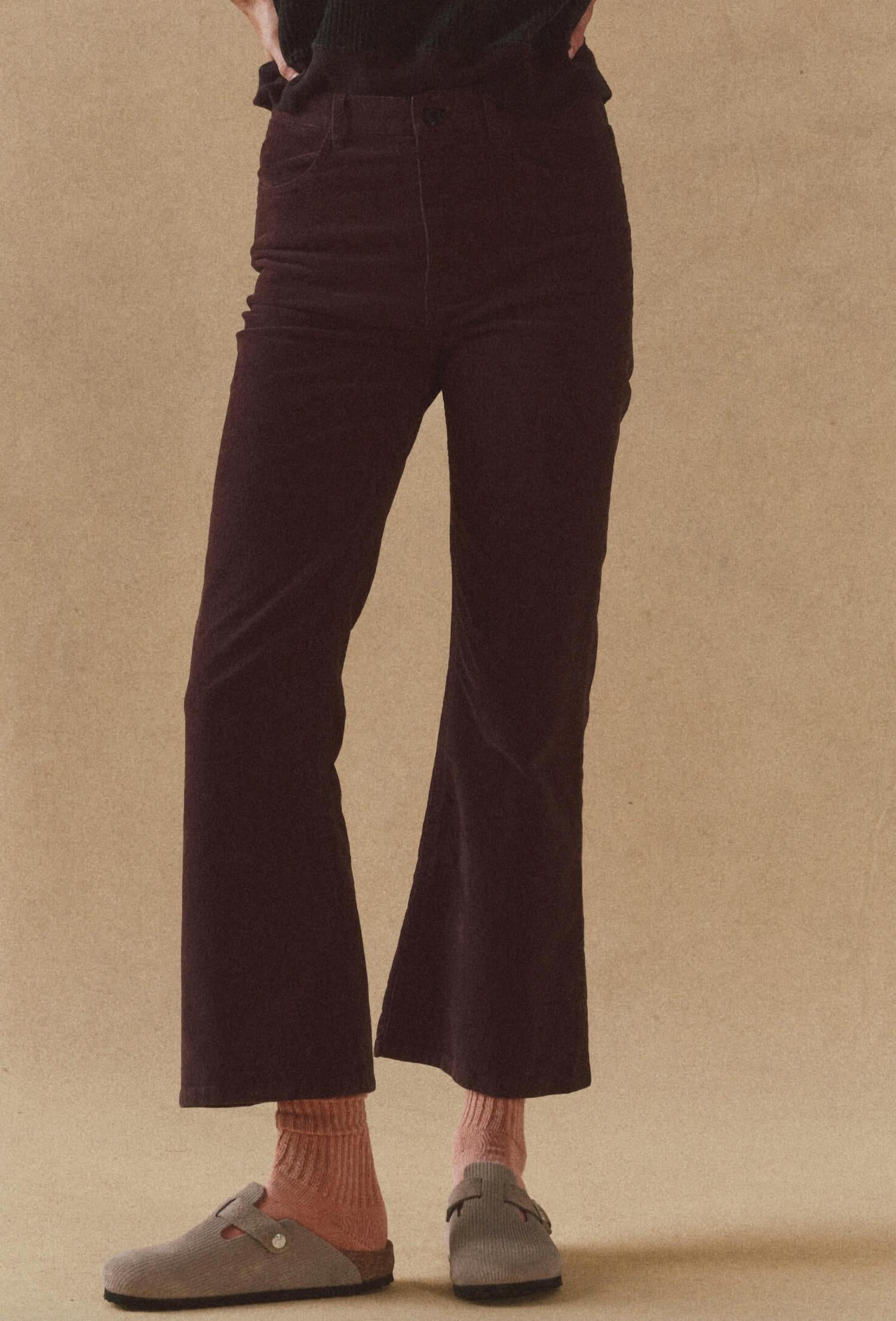 Designed to fit snug through the hips with a dramatic cropped kick flare at the hem, the high-rise design nods to vintage 70s bell bottoms. The silhouette has been updated in a soft textured cord with a hint of stretch. Finishing details include a square top block, perfectly cropped length, and a corozo button at the waistband. 98% Cotton, 2% Spandex. True to size. Comfortable and relaxed fit.