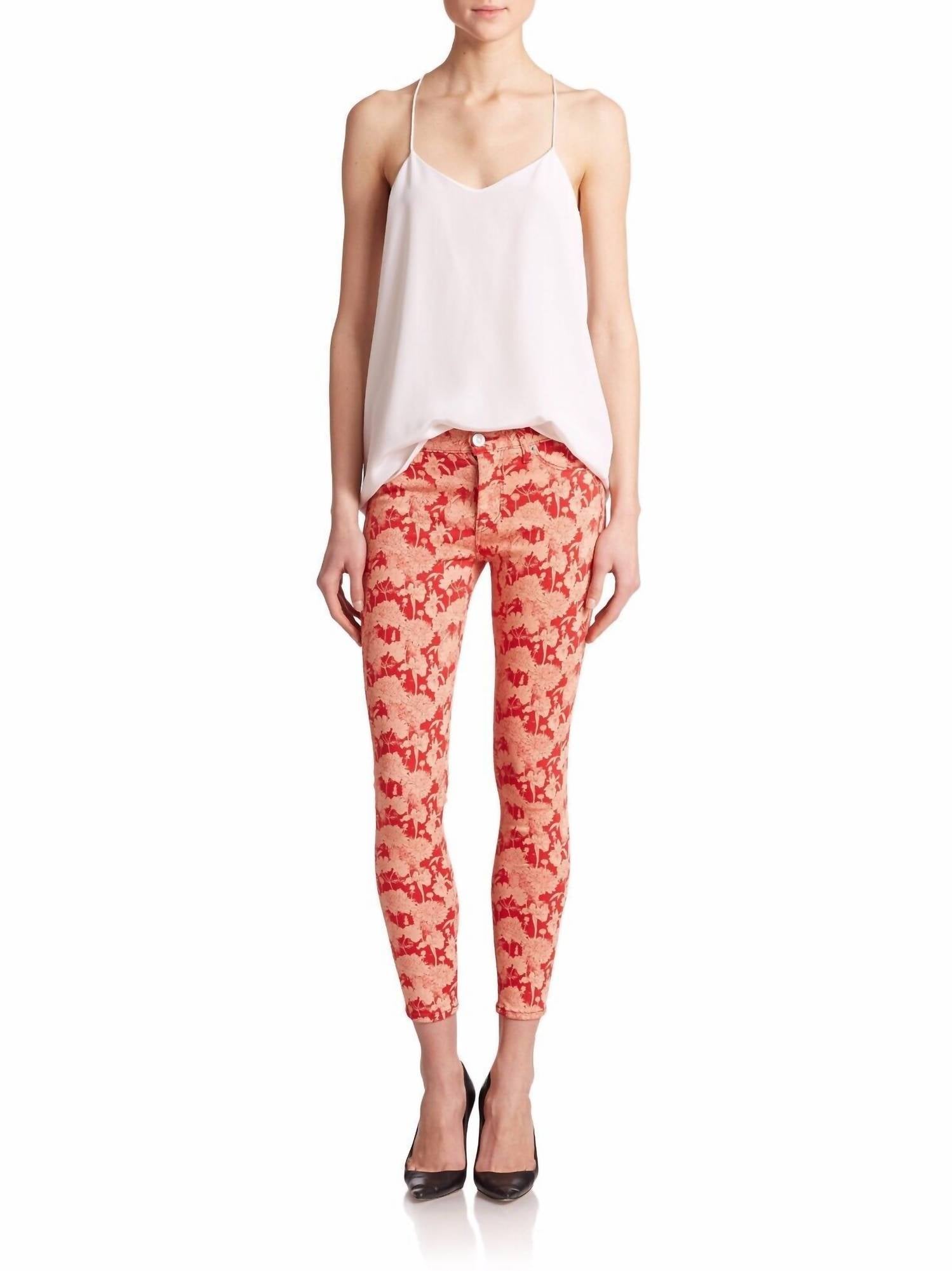 Comfortable and stylish, we love this cropped jean for all of the obvious reasons. Discover the Floral Print Nico Mid Rise Skinny Ankle Jeans by Hudson, featuring a striking light orange floral print on a bold red background. These jeans boast a mid-rise waist, a snug skinny leg, and a practical zip fly with button closure, complemented by silver branded hardware. Composition includes 70% Lyocell, 28% Cotton, and 2% Elastane, providing a comfortable stretch and soft feel. With a front rise of 8", back rise of 12.5", inseam of 27.5", and a leg opening at the hip of 8.5", these jeans offer a flattering fit punctuated by 5 pockets, 3 of which are faux.