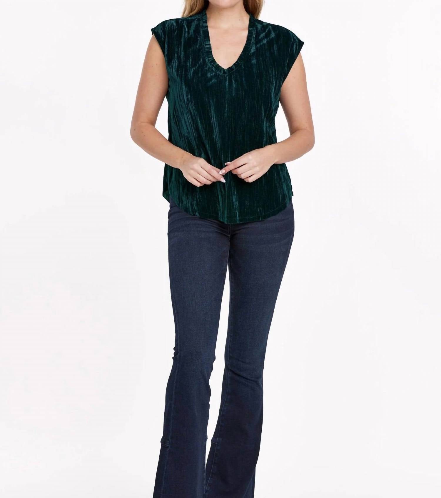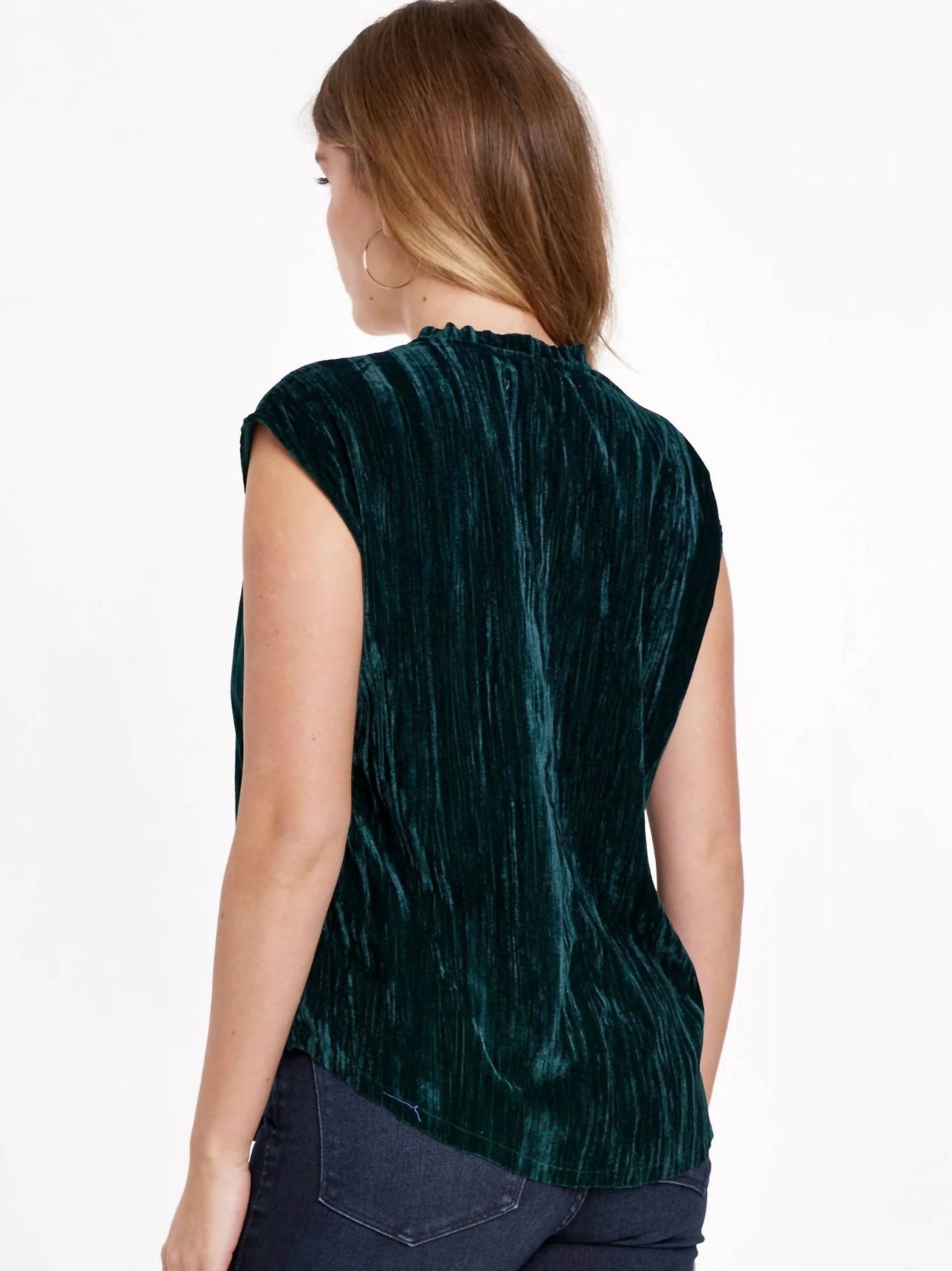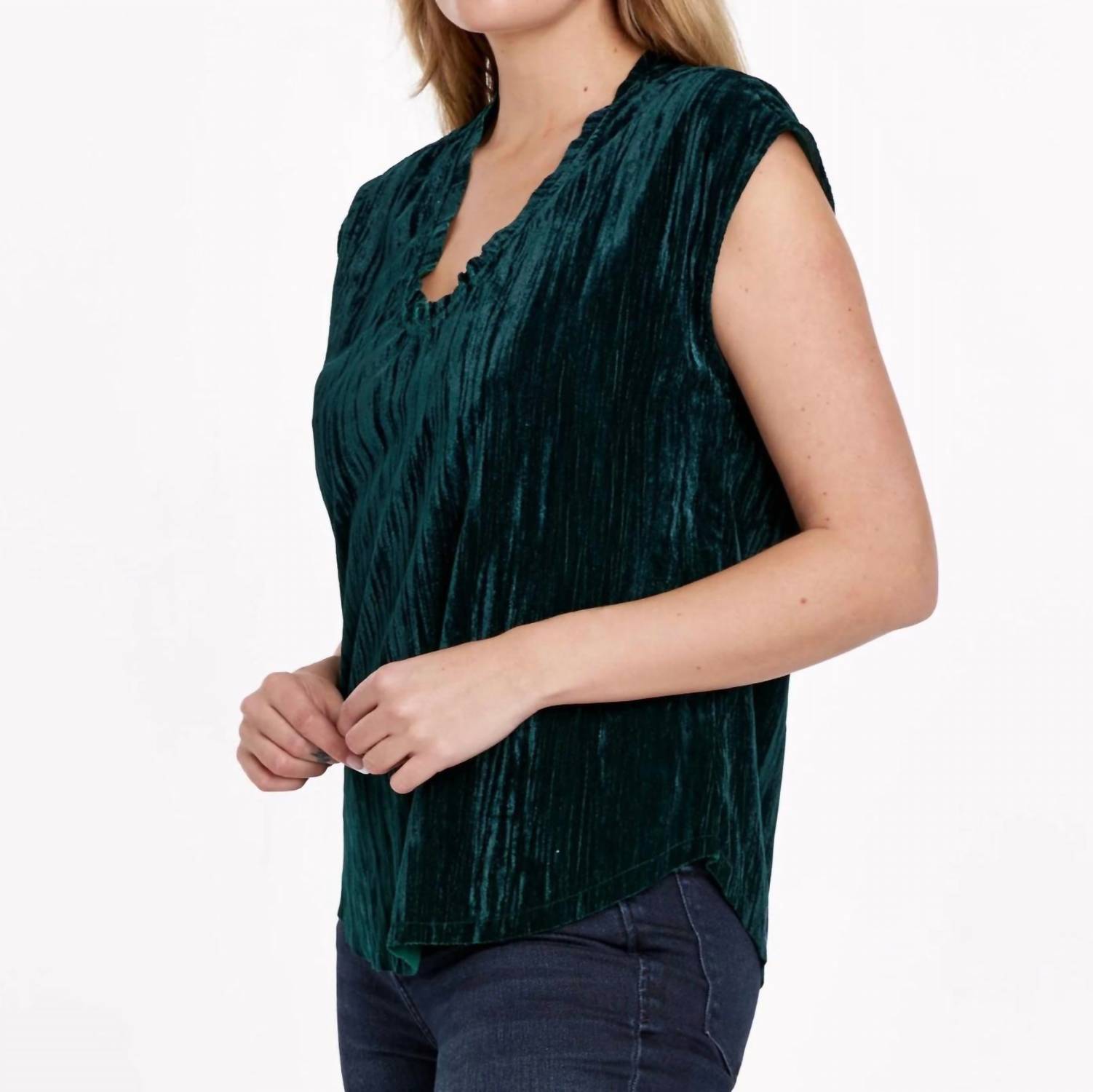 This Yanis Sleeveless Top features a V-neck with a self neck band and baby hem, offering a relaxed fit. Made from 100% polyester, it has a textured pattern and measures 26” in length with a 42” bust for size small.