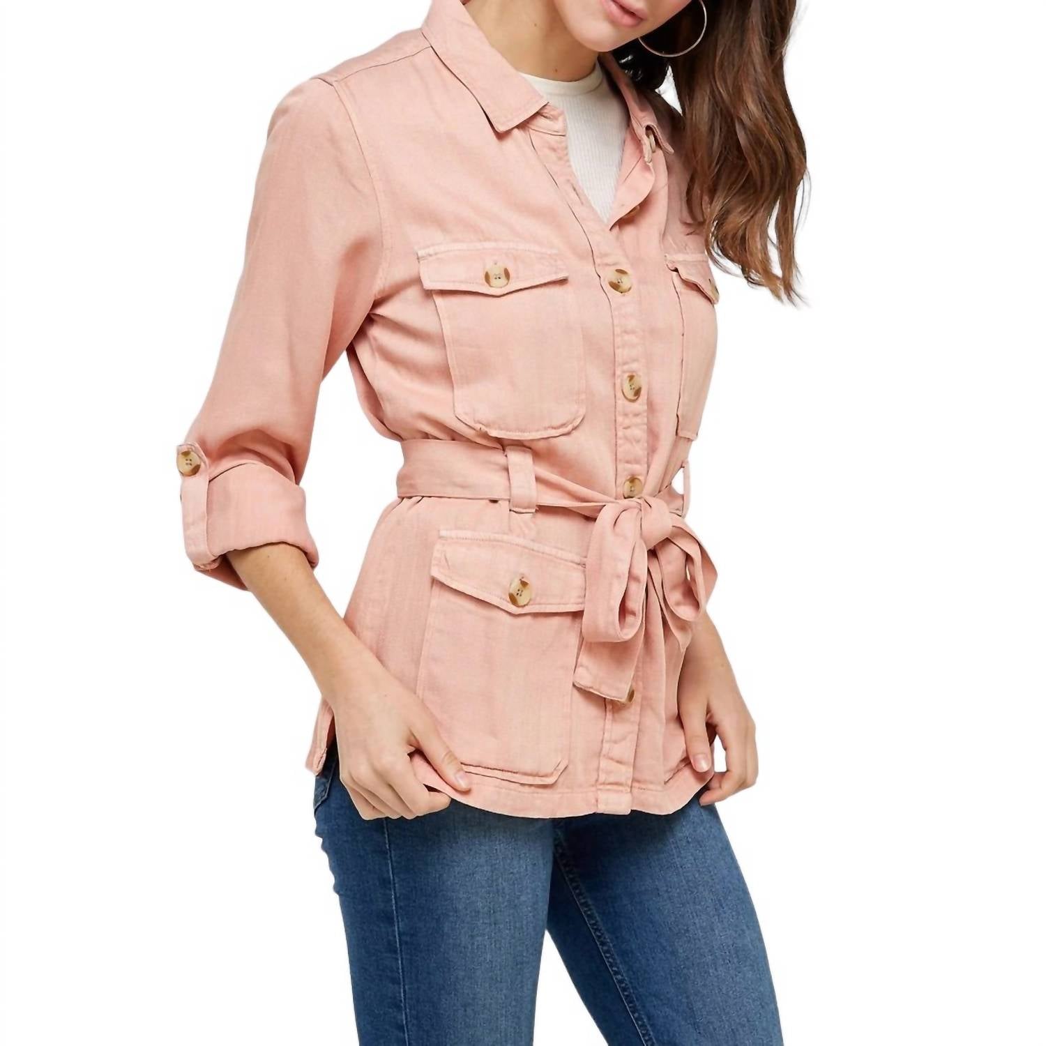 The Kennedy Jacket is lightweight and perfect for layering, featuring a collar, button closure, four pockets, and long sleeves, and is made from 100% lyocell.