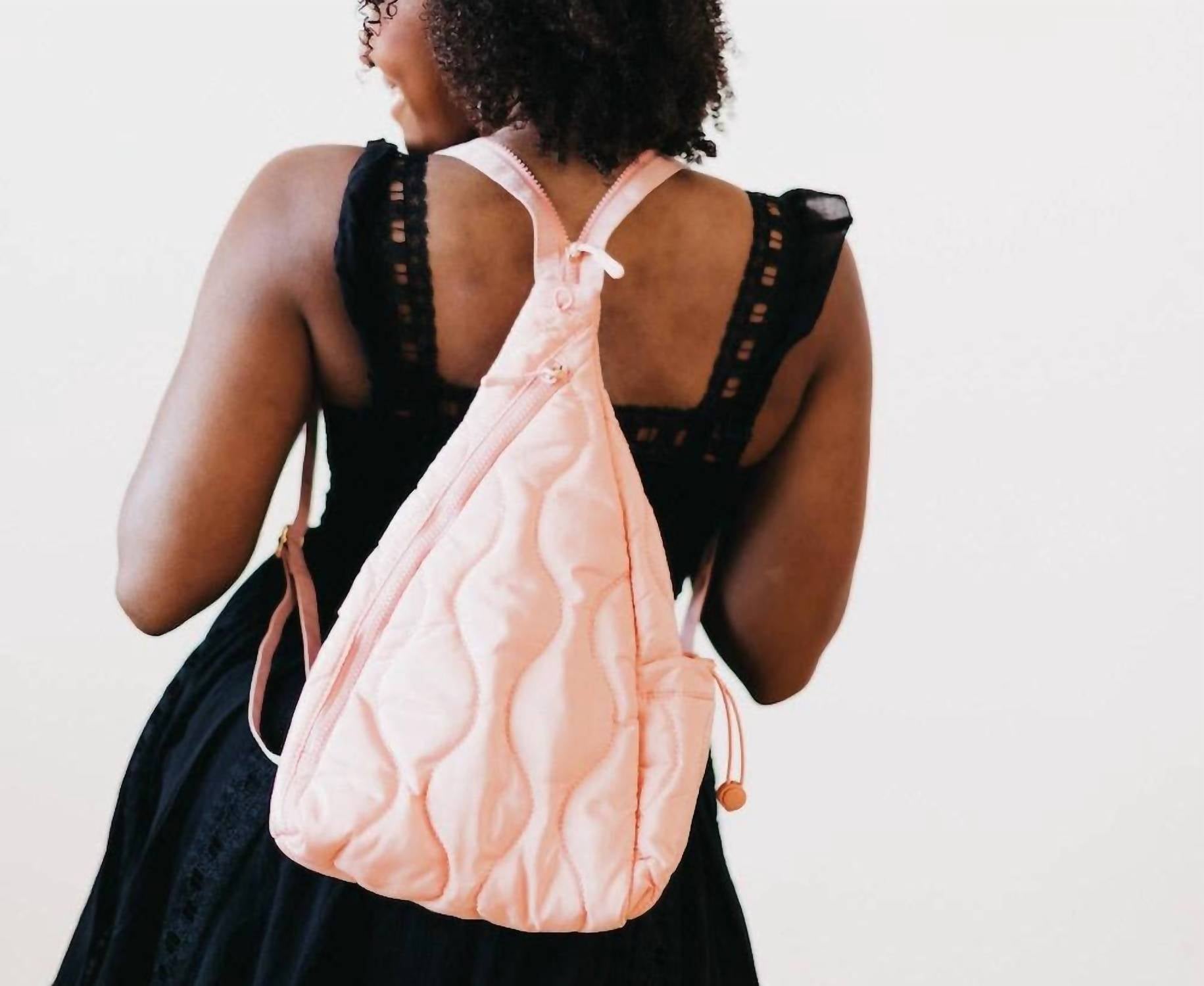 Crafted from nylon. Trendy bag offers the convenience of wearing it as either a sling bag or backpack. With adjustable straps, exterior water bottle pocket, and a chevron interior featuring an interior zipper pocket. Measuring 11"L x 4"W x 16"H with a strap length of 26" - 35.5". Combines functionality with stylish aesthetics.