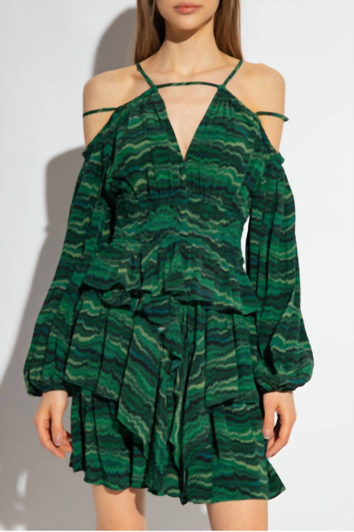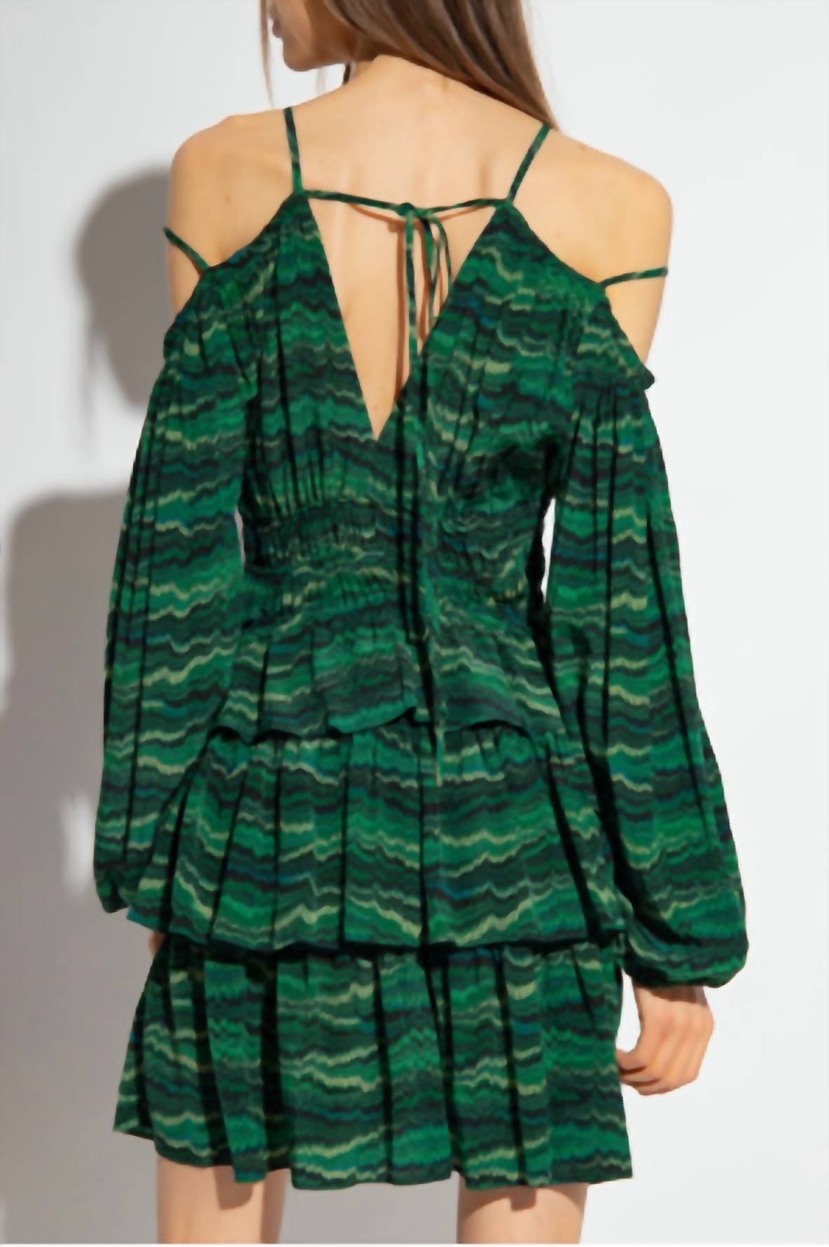 V-neckline with spaghetti straps, denuded shoulders, elastic waist, blouson sleeves with elasticated cuffs and a ruffled hem. 100% Silk. Model's Measurements: Height: 176cm. Bust: 85cm. Waist: 60cm. Hips: 89cm. Model is wearing size: 4.