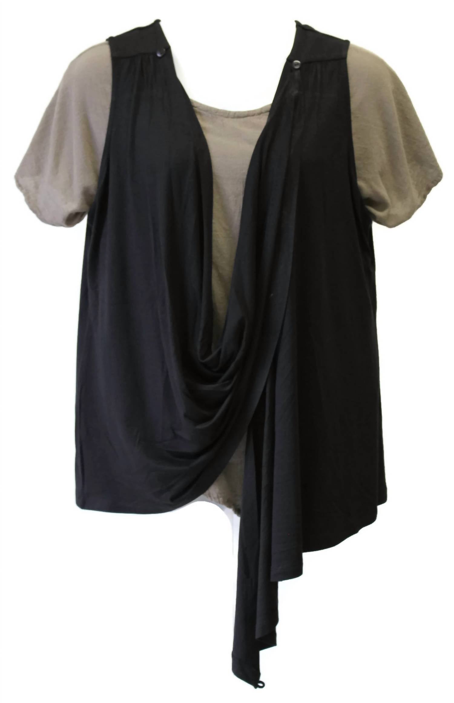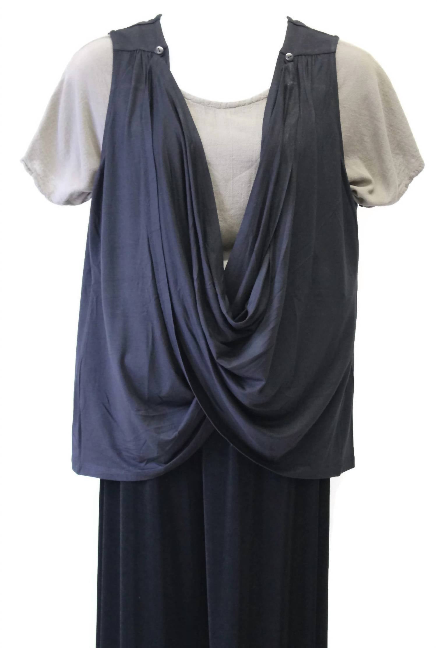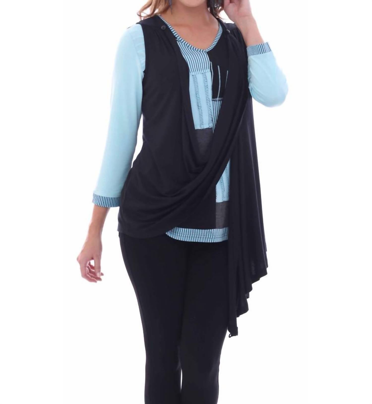This sleeveless vest features a long funky front with a shorter back. It can be styled three ways: open front, one button, or two buttons. 1X Bust 54" Length 37"-28", 2X Bust 56" Length 38"-29", 3X Bust 58" Length 39"-30". Made from 95% Rayon and 5% Lycra. Machine washable cold on a gentle cycle.