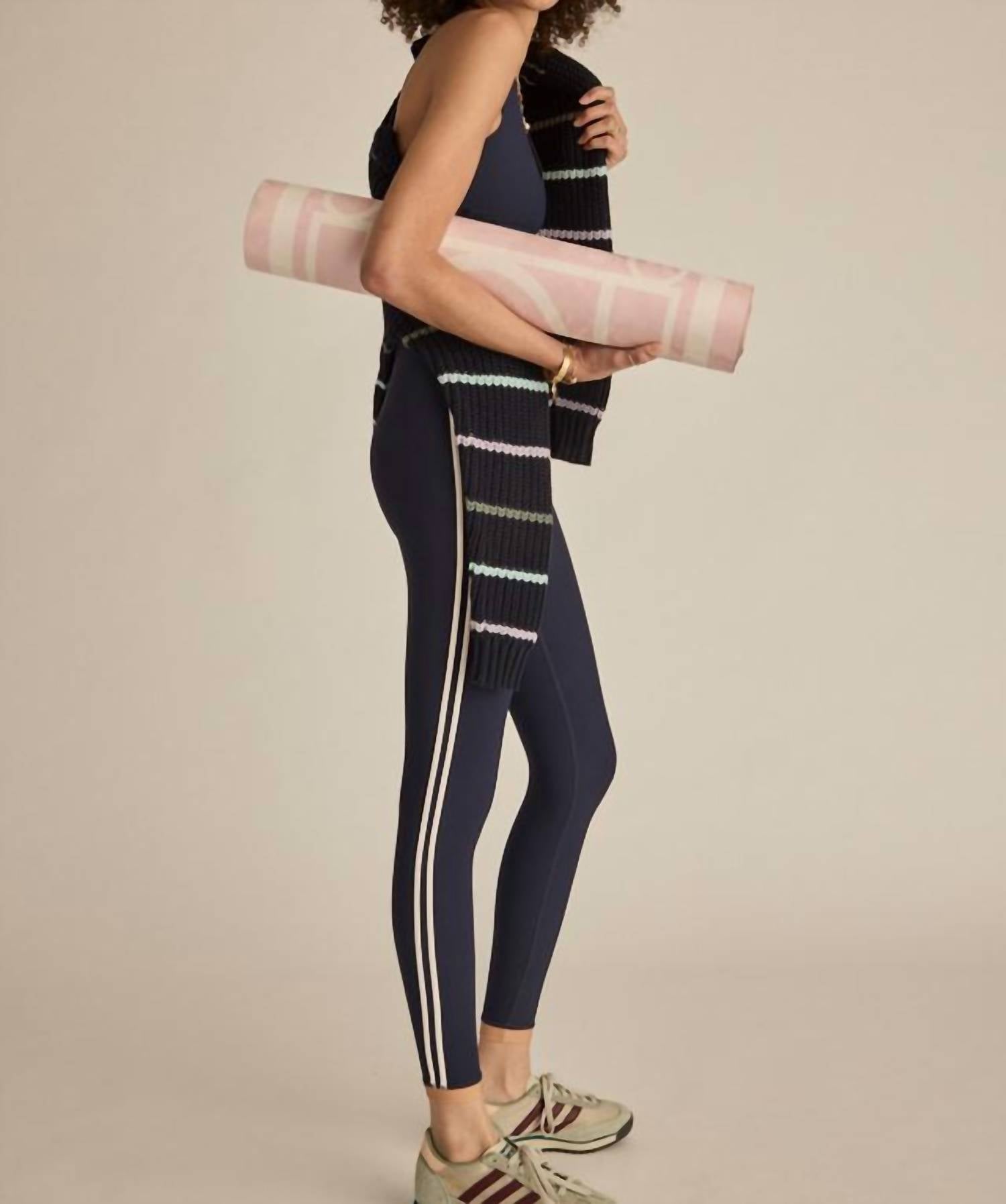 Experience the ultimate support with THE UPSIDE Daytona Jetta Racerback Bra, a stylish choice in solid navy for any fitness or workout session. This bra features a V neck racerback design with contrast cream binds down the sides and a printed arrow at the back, adding a unique touch. Crafted from a recycled soft peached nylon blend, it offers moisture-wicking, breathable, quick-drying, and extra soft properties for your comfort. Care for this athleisure essential is simple: machine wash and line dry.
