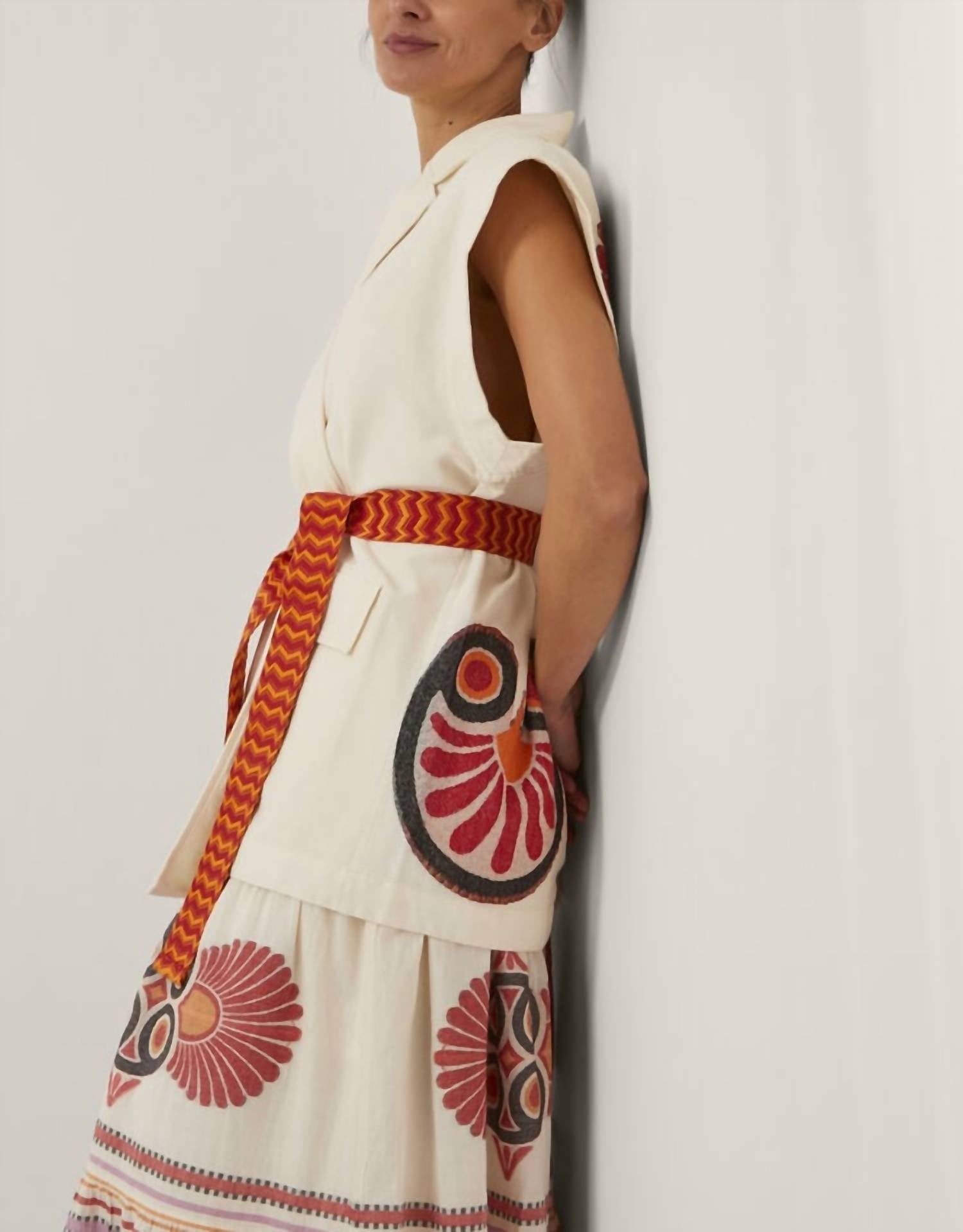 Pair with cozy slippers for loungewear perfection. Introducing the Laughlin Sleeveless Jacquard Jacket by Devotion Twins, an ivory blazer-style piece designed for bold, summer-ready outfits. Crafted from luxurious cotton, this patterned jacket features a V-neck and is adorned with a colorful tie-up fabric waist belt. Perfect for spring fashion and Scandi style enthusiasts, it boasts beautifully embroidered jacquard patterns on the back for a vibrant touch. Ideal for layering with your favorite jeans or pairing with the Olympia Maxi Skirt.