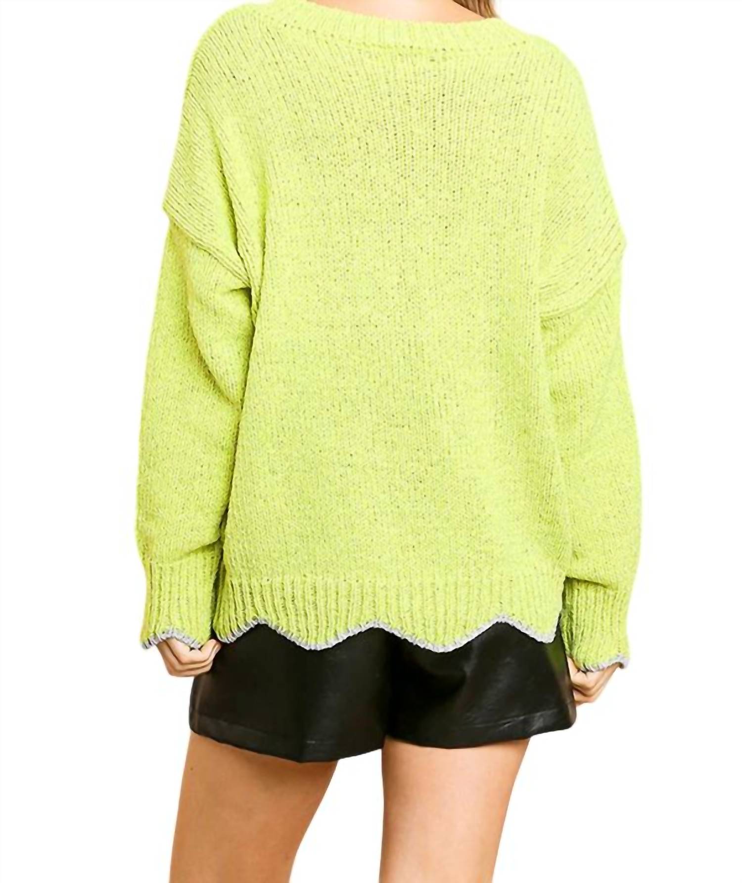This sweater features a V-neckline. Long sleeves. Dropped shoulders. Zig zag hemline. Lurex trim. Relaxed oversized silhouette. Small bust 42" length 23". Medium bust 44" length 23". Large bust 46" length 23". 90% nylon 10% polyester. Imported. Dry clean only.