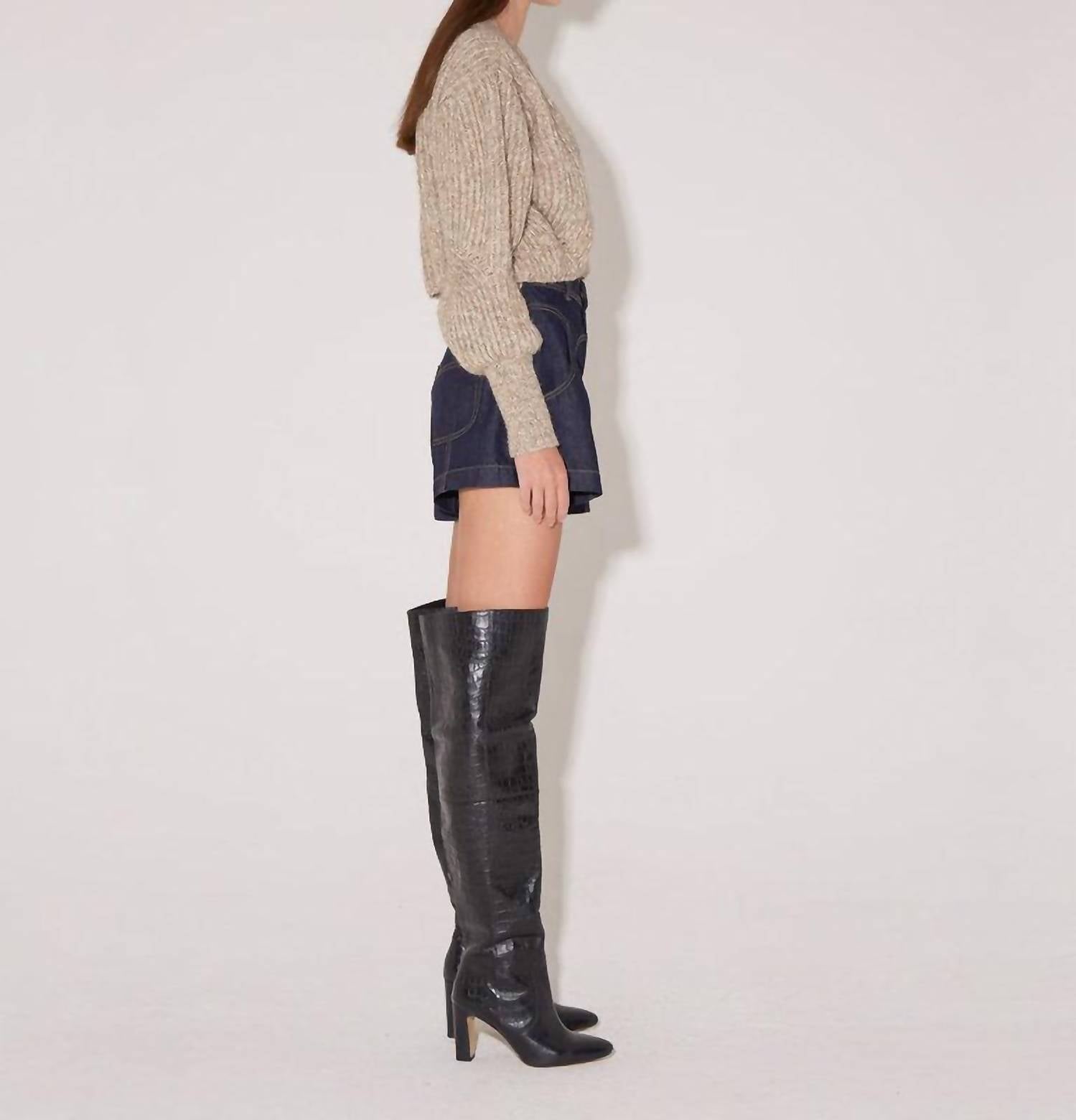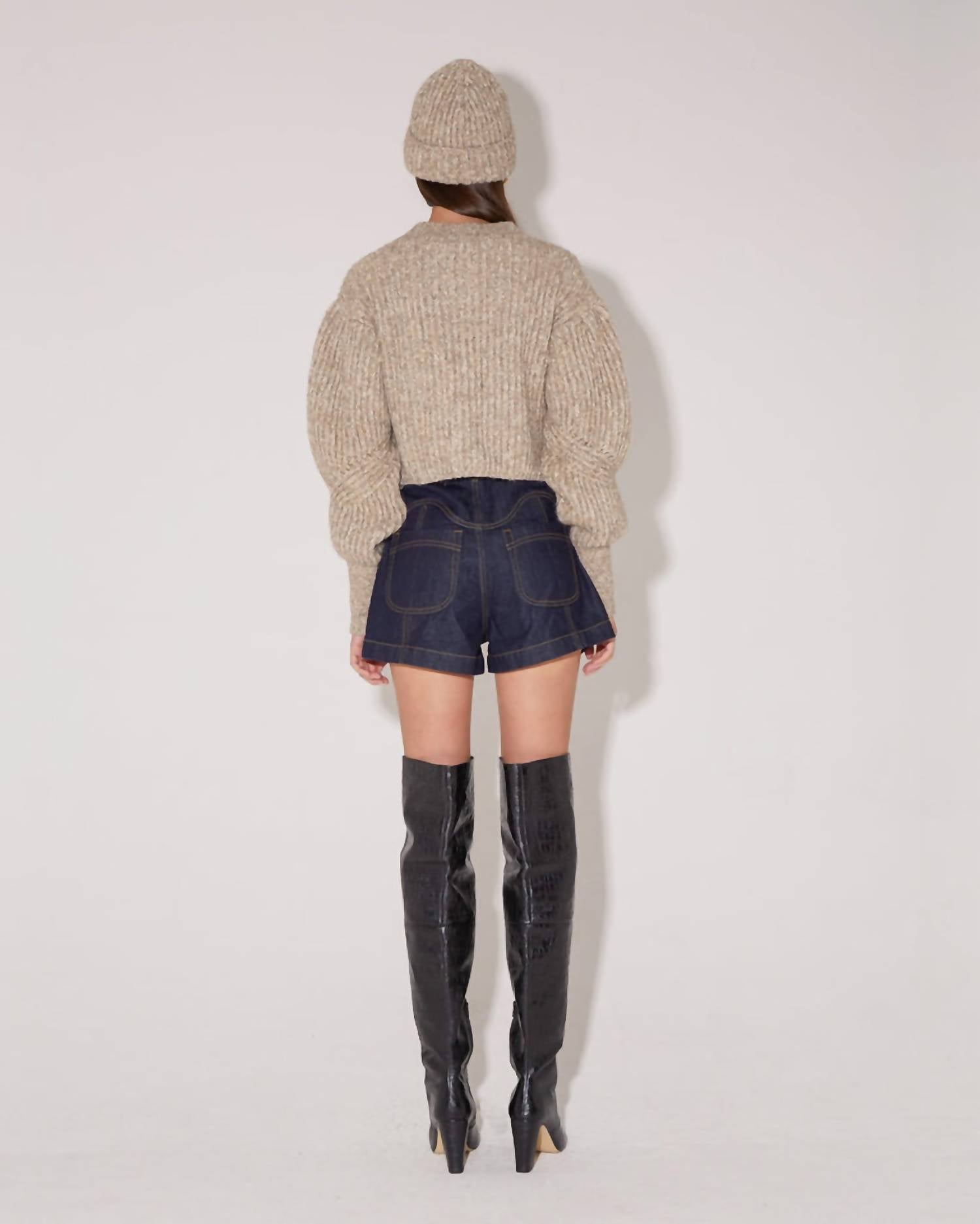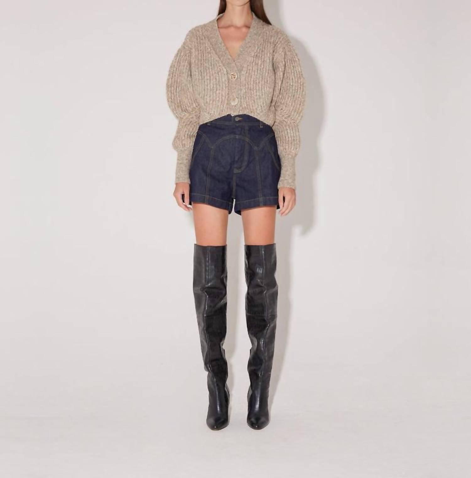 This loose fitted style features a contrast rib knit pattern throughout the garment. Balloon sleeves. Statement buttons. Contrast rib pattern. Alpaca wool. The model is 178cm tall (5’8) and is wearing a size S.