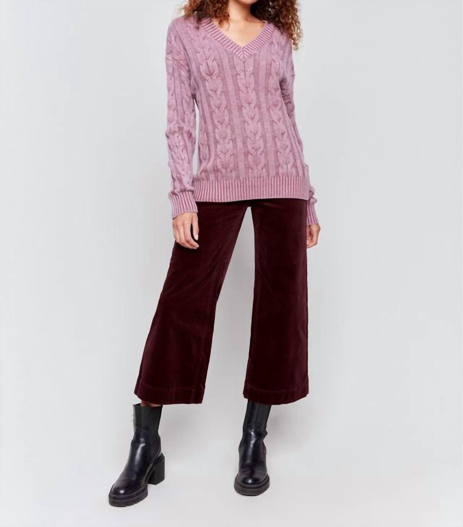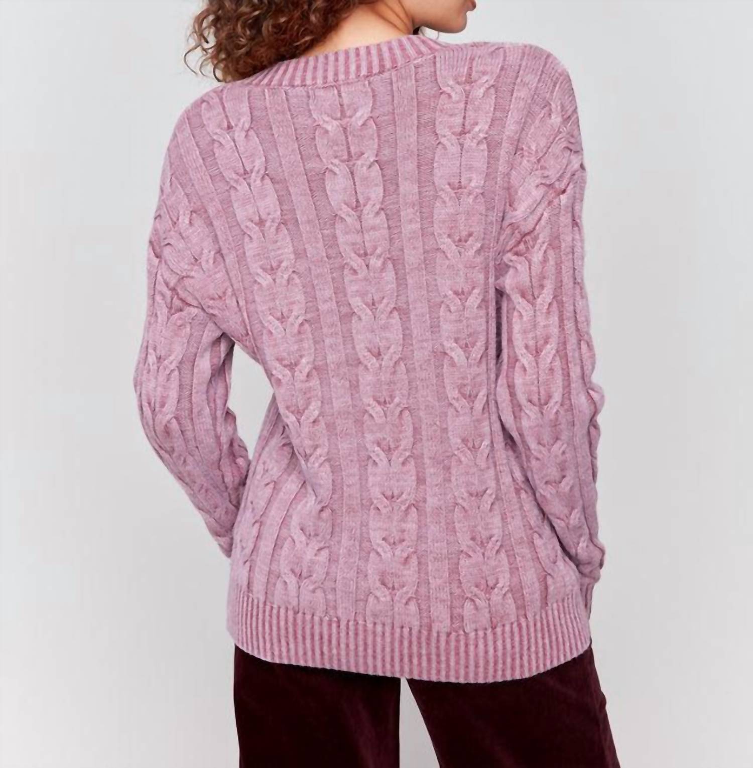 Draped in a stunning cabernet. Elegant piece marries timeless sophistication with modern versatility. Featuring a classic cable knit pattern that exudes both charm and comfort. V-neckline offers a graceful touch. Crafted from a luxurious blend of cotton, acrylic, rayon, polyester, and nylon. Ensures superior warmth and comfort. 23.5-inch back length. Provides the perfect balance between cozy coverage and flattering style. Machine wash cold with like colors. Do not wring or twist. Use only non-chlorine bleach when needed. Lay flat to dry. Cool iron on reverse side if needed.